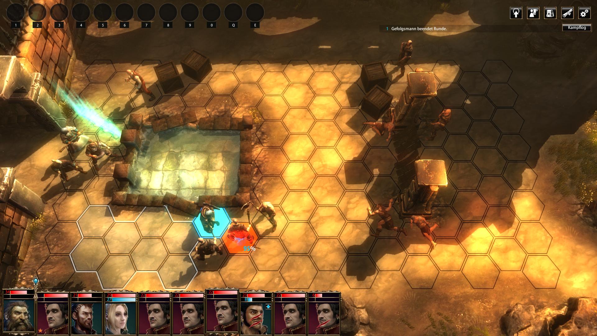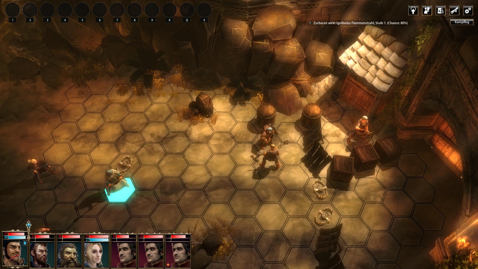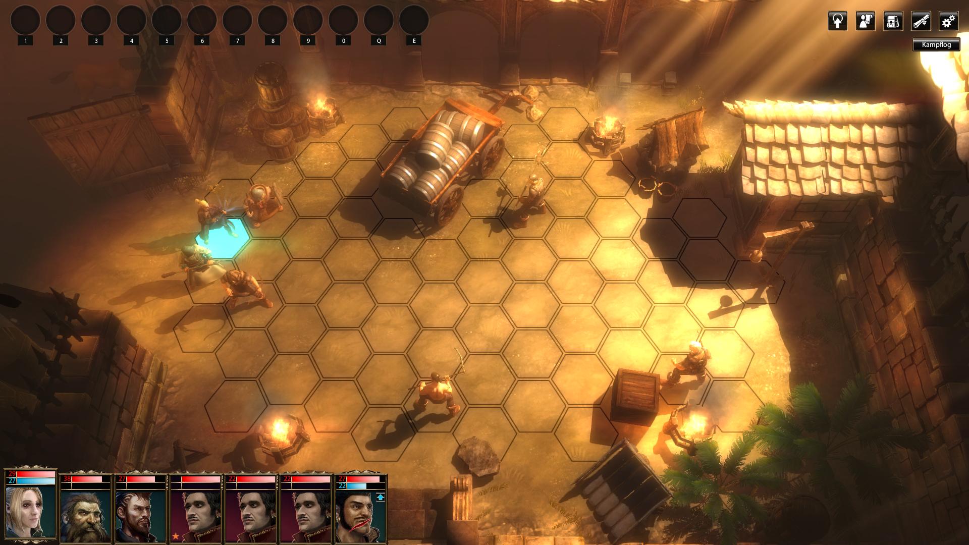 Das Tor zur Villa wird von drei Soldaten bewacht und ist mit Fallen gespickt, von denen zwei offensichtlich in der freien Passage zwischen den Barrikaden liegen. Setz deine "Sinnesschärfe" ein, um sie aufzudecken und nicht versehentlich rein zu laufen. Die Fässer lassen sich im Gegensatz zu den Holzbrettbarikaden leicht zerschlagen. Nutze das bei deinen Nahkämpfern aus. Der dritte Mann steht übrigens oberhalb auf einem Balkon und kann nur von Geschossen oder Zaubern getroffen werden.