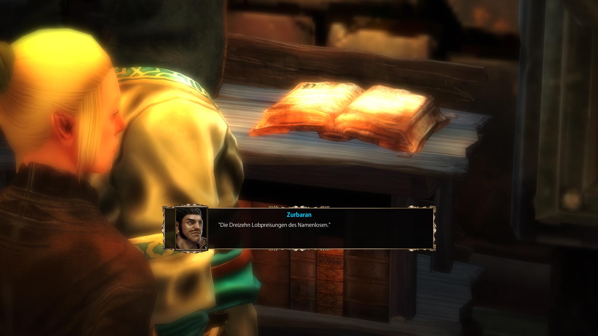 In der Folterkammer findest du zusätzlich das Buch der "Dreizehn Lobpreisungen des Namenlosen" . Was offensichtlich auf den verstoßenen Gott, den Ursprung alles Bösen hindeutet und eine viollette, nach ?Lorbeer duftende Flasche von Lysander. Da eure Ziele sich weiter überschneiden, bietet Niam an euch nach Morbal zu führen, damit ihr gemeinsam über die Grenze nach Mengbilla kommt. Auf dem Weg dorthin kommst du an einem Landstreicher und dem Örtchen Chaleba vorbei. Hier gibt es die "Bruderliebe" Nebenquest, für die du mit dem Corpofrigo Kälteschock Zauber belohnt wirst.