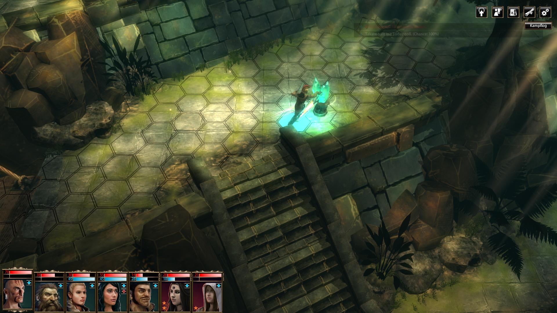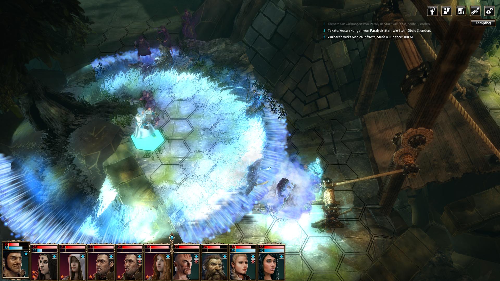 Begibst du dich zum Aufstand, so stehen dir die Prophetin und sechs Diener gegenüber. Neben dir erhebt sich eine eingefahrene Zugbrücke. Auf deren anderer Seite ein revitalisierender Kristall steht, welcher die Feinde jede Runde vollheilt. Ob es sich lohnt fünf Runden für die Zerstörung zu investieren, musst du selbst entscheiden. Die Prophetin ist magisch sehr begabt und wirkt Zauber wie "Blitz dich find!" auf deine ganze Gruppe, oder lässt dich mit "Paralysis Starr wie Stein" erstarren. Blocke sie mit "Gardianum Zauberschild" oder hebe sich anschließend mit "Magica Infracta". Als Beute bekommst du u.a. den "Schmiedehammer".