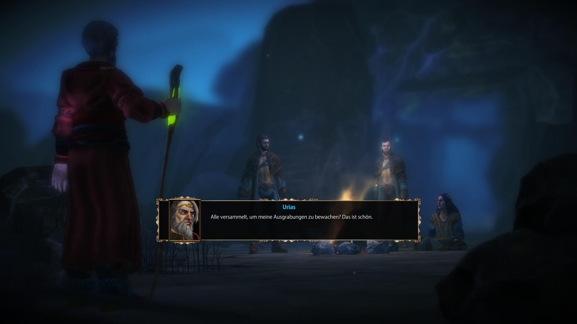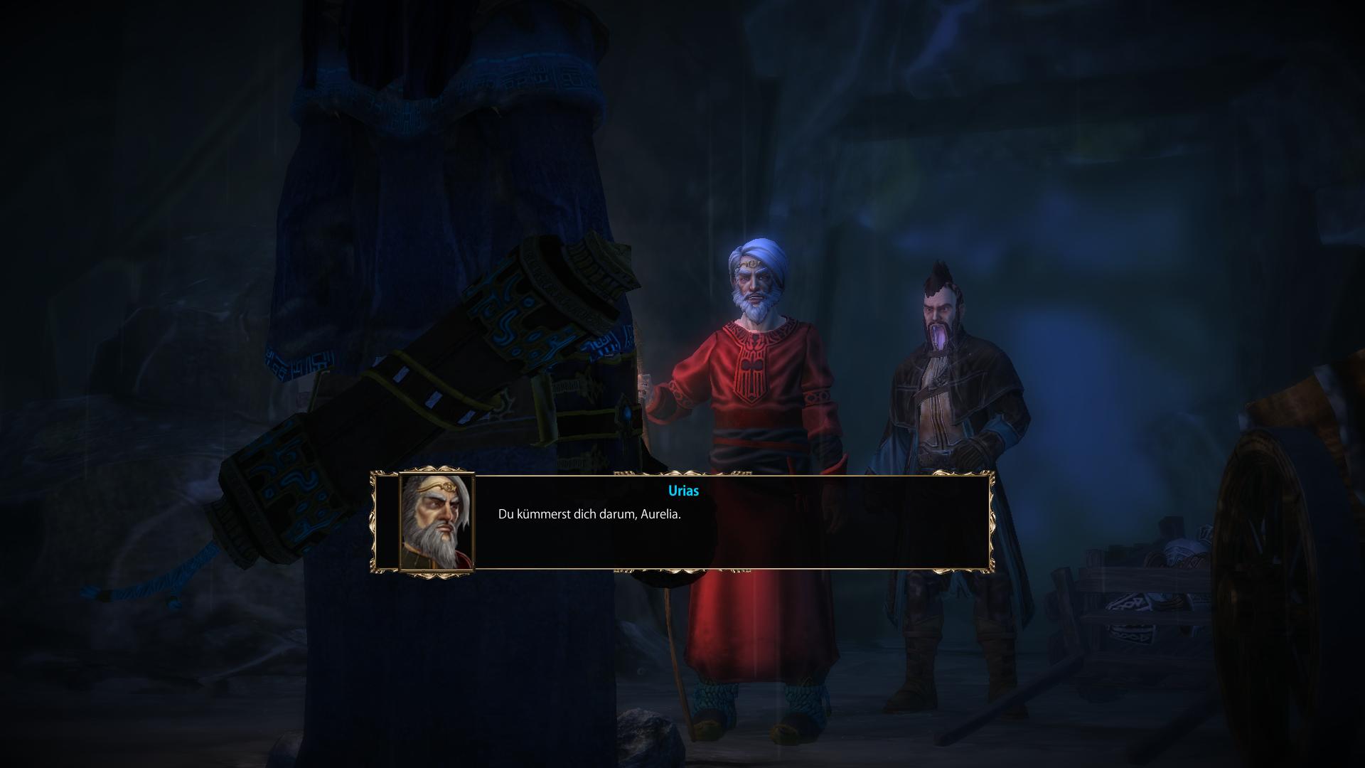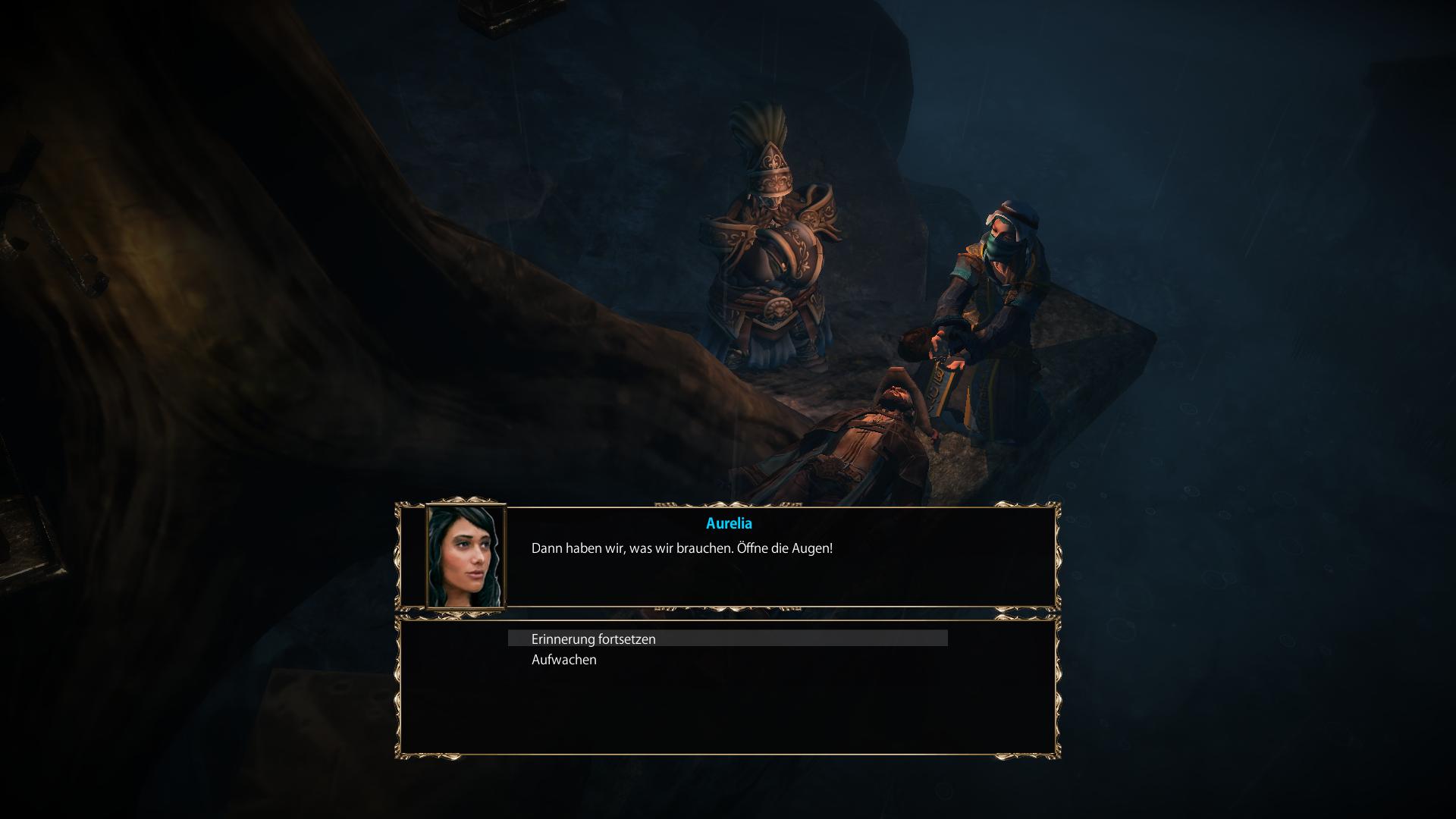Aurelia versetzt dich in deiner Erinnerung tatsächlich zurück in der Zeit. Prinzessin Elanor lebt noch und ihr sitzt zu dritt am Lagerfeuer. Lysander gesellt sich hinzu und fordert Elanor zu einem Spaziergang auf. Lysander ist aufgeregt und will euch beide sofort zum Abstieg in ein Grab überreden. Er erklärt euch die Lage. In dem Grab soll der Schlüssel zu allem abgrundtief bösem liegen. Womit er vermutlich das Bannwort meint. Offenbar wissen alle mehr als du. Aber als du dich endlich dazu beschließt aufzubrechen, kommt Graf Urias zu euch. Urias hat das gleiche wie ihr vor, also folgt ihr ihm die Treppen hinab. Vor der Pforte zur großen Grabkammer werdet ihr angegriffen.