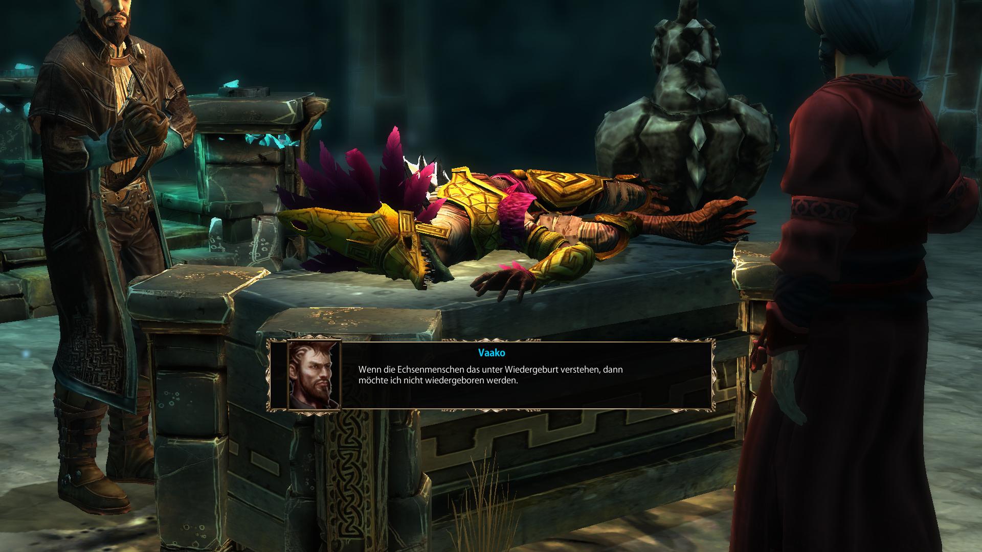 Sobald die Mumie am Boden liegt, flüstert sie den Namen. Damit hast du theoretisch alles was du brauchst und kannst aufwachen. Wenn du wissen willst, wie es zu deiner Gedächtnislöschung kam, dann solltest du weiter schlafen. Unabhängig von deiner Erinnerungsforschung sieht Naurim die Situation als ideale Gelegenheit der Verräterin endlich die Kehle durch zu schneiden. Egal wer und was in dem Gespräch argumentiert wird, Aurelia darf weiterleben und ihr müsst die Echsenstadt finden. Da Aurelia von Urias nicht in den Standort eingeweiht wurde, musst du ihn irgendwie ausfindig machen. Takate hat dazu einen Vorschlag: Die Geisterfrau seines Stammes. Damit beginnt die Suche nach der Schamanin.