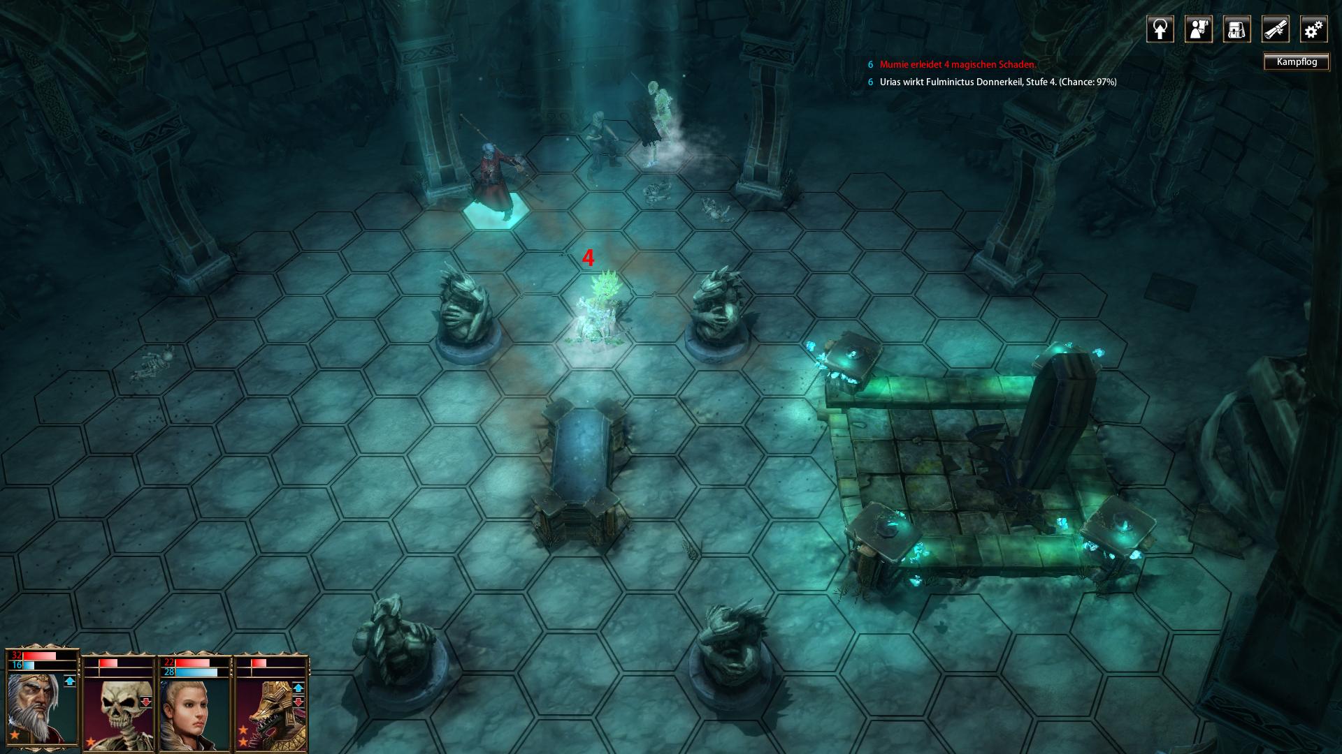Die finale Kammer folgt einem ähnlichen Prinzip wie die siebte Runde der neun Horden. Soll heißen, in der Mitte drehen sich vier Echsenstatuen, die Feuer in ihre Blickrichtung versprühen. Von diesem kannst sowohl du als auch die Skelette getötet werden. Wobei die den Luxus eines revitalisierenden Kristalls haben. Für den Sieg musst du die vier Kristalle zerstören, welche die magischen Strahlen zum Sarg aussenden. Lass Urias deinen Hauptcharakter mit "Axxeleratus Blitzgeschwind" buffen, damit er zwei mal pro Runde ziehen kann. So kann er schnell zu den Kristallen laufen und sie zerstören. Das lässt Urias jedoch mit den vier unsterblichen Skeletten zurück. Buff ihn in der zweiten Runde mit "Standfest Katzengleich", damit seine Überlebenschance steigt. Anschließend kannst du mit ihm im Kreis rennen, damit die Skelette aufschließen aber nicht angreifen können. Sobald du alle vier Kristalle zerschlagen hast, kommt eine Mumie aus dem Sarg. Mit etwas Glück steht sie gleich darauf in den Flammen der Statuen. Wenn nicht, musst du beim Tod halt nachhelfen. Die Mumie dauerhaft in die Bahn der Flammen zu steuern, ist definitiv der effektivste Weg sie zu bezwingen. Bedenke zudem, das die Skelette jetzt sterblich sind.