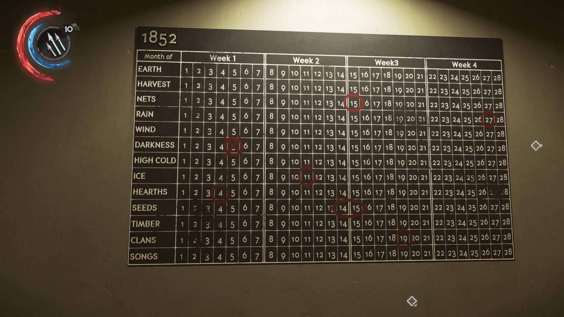 Geht anschließend wieder zur Front und neben dem Geschäft die Treppe in den ersten Stock hoch. Die Wohnungstür lässt sich nun öffnen. Auf dem Gang zum Wohnzimmer hängt ein Kalender mit eingekreisten Zahlen. Das sind alle möglichen Kombinationen, die es sein könnten. Nun müsst ihr nur noch herausfinden, welche Reihe es ist. Geht dafür zum Schreibtisch und seht euch die Notiz an der Hochzeits-Silbergraphie an. Darauf sollte etwas stehen wie "Vermählt im Monat des Regen". Da der Kalender englisch und die Notiz deutsch ist, müsst ihr nun selbst etwas übersetzungsarbeit leisten. Aber wenn auf dem Foto "Regen" stehen würde, müsstet ihr am Kalender die Zeile mit "Rain" suchen. Zählt ab, die wievielte Spalte es ist. Rain wäre z.B. die 4. Sucht dann nach der/den umkreiste(n) Zahl(en) in der Reihe. Steht da Beispielsweise 27, wäre der Code für das Schwarzmarkt-Schloss 427.