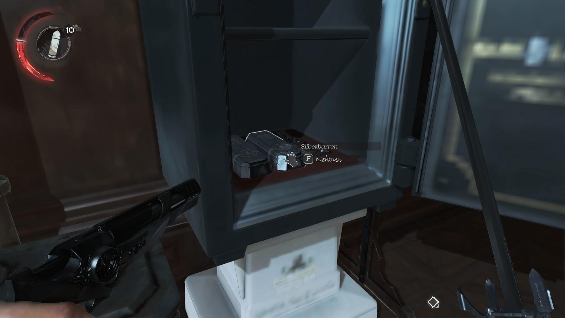 Fundort:Der erste Tresor, der euch im Spiel begegnet, steht in Galvanis Labor während des "Erreiche das Schiff" Quest-Schritts. Klettert die Dächer vom Dunwall Tower aus hinab auf die Straße und geht in das erste Gebäude auf der linken Seite (neben dem "For Rent" Schild). Die große Holzpforte bringt euch auf einen Gang, geht in den Laborraum links.