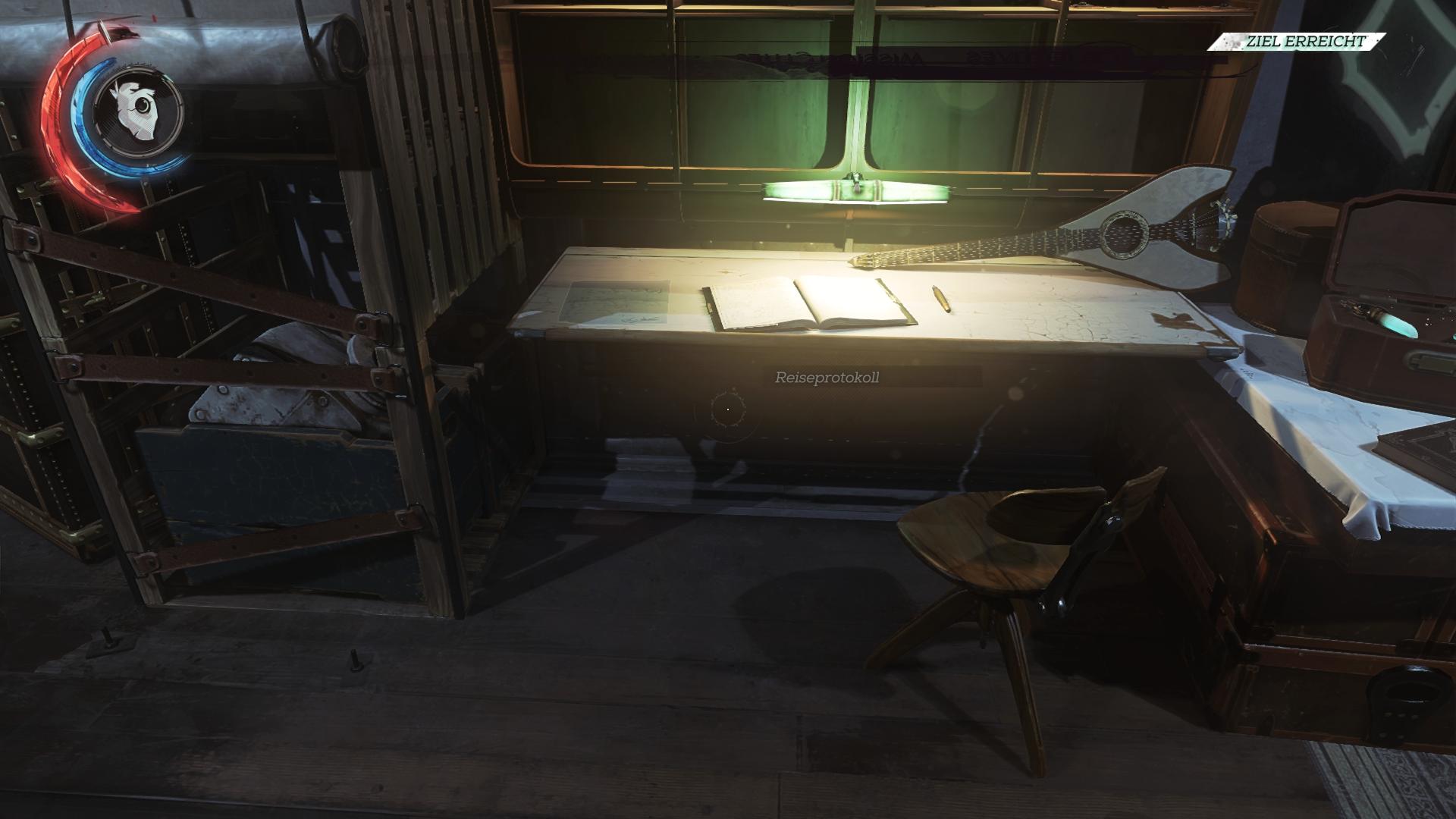 - Fundort:Corvos/Emilys Kabine auf dem Schreibtisch, links vom Reiseprotokoll Buch.