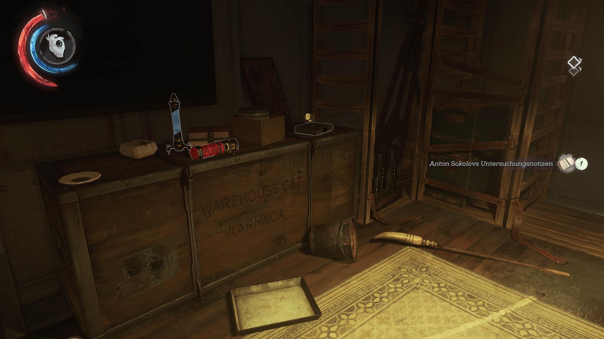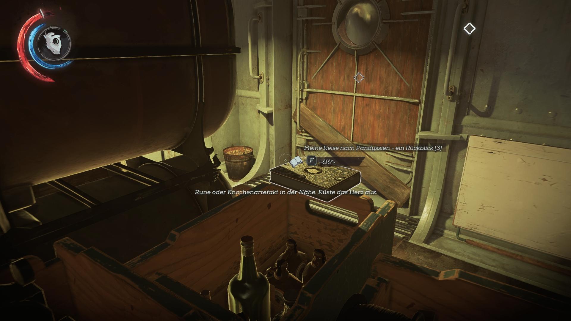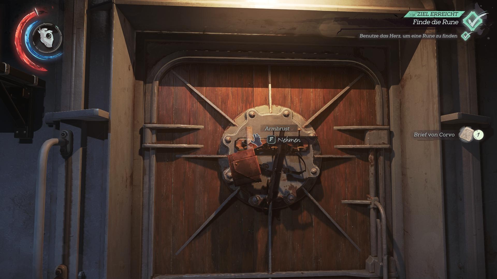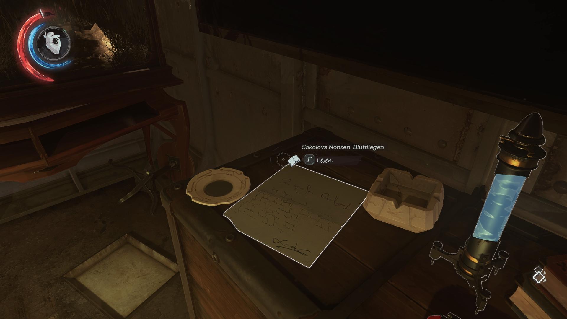 - Fundort:An der Innenseite der Tür von Corvos/Emilys Kabine, neben der Armbrust. Kann man nicht verpassen.