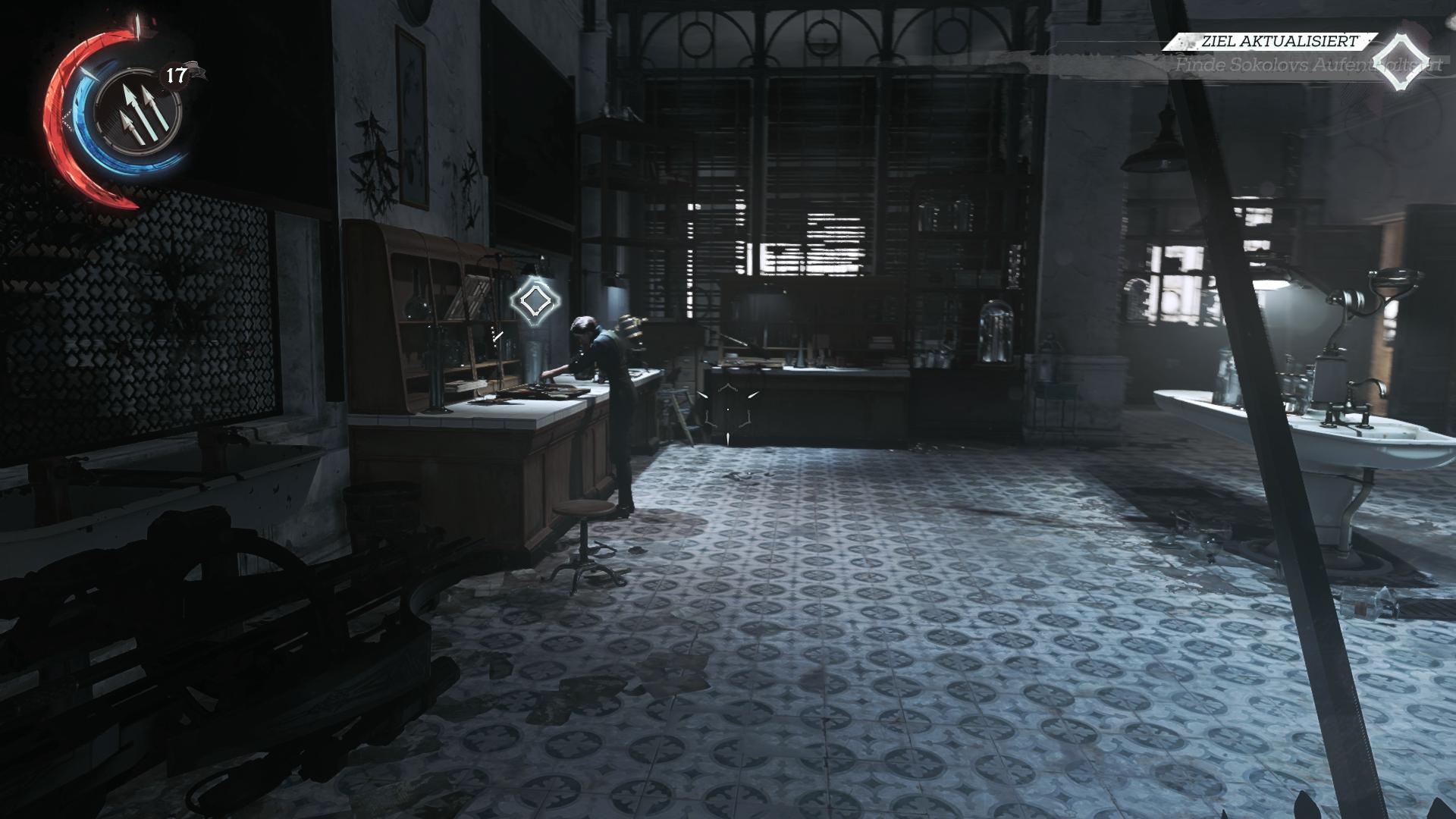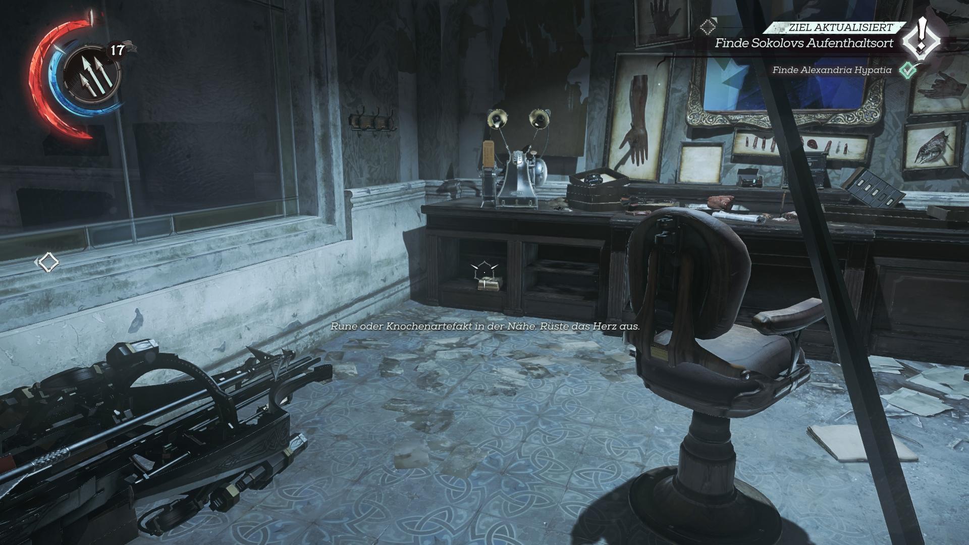 Geht in den Rekuperation-Bereich rein, rechts den Gang entlang, nach der Tür die Treppe runter, wo Alexandria Hypatia an der Theke eine Blutfliege seziert. Lauft an ihr vorbei, in den holzvertäfelten Bereich hinter ihr. Ganz am Ende ist das Arbeitszimmer mit dem Knochenartefakt.