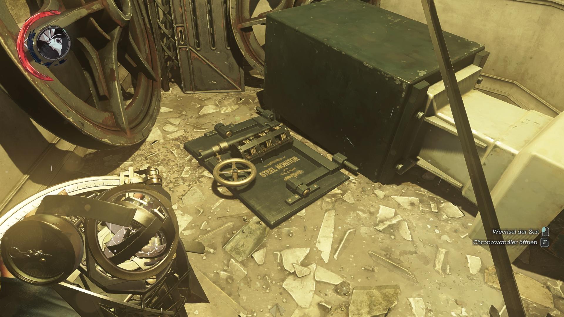 Dort ist der Tresor von einem Blutfliegennest überwuchert und vollkommen unzugänglich. In der Vergangenheit ist er verschlossen. Öffnet in der Vergangenheit den Offen, werft den Leichnam des Hundes hinein und heizt ihm mit dem roten Knopf richtig ein. Dadurch entstehen im Verlauf der Zeit keine Blutfliegen und ihr könnt in der Gegenwart die Kombination an der offenen Tresortür ablesen. Stellt sie in der Vergangenheit ein und plündert den Safe.