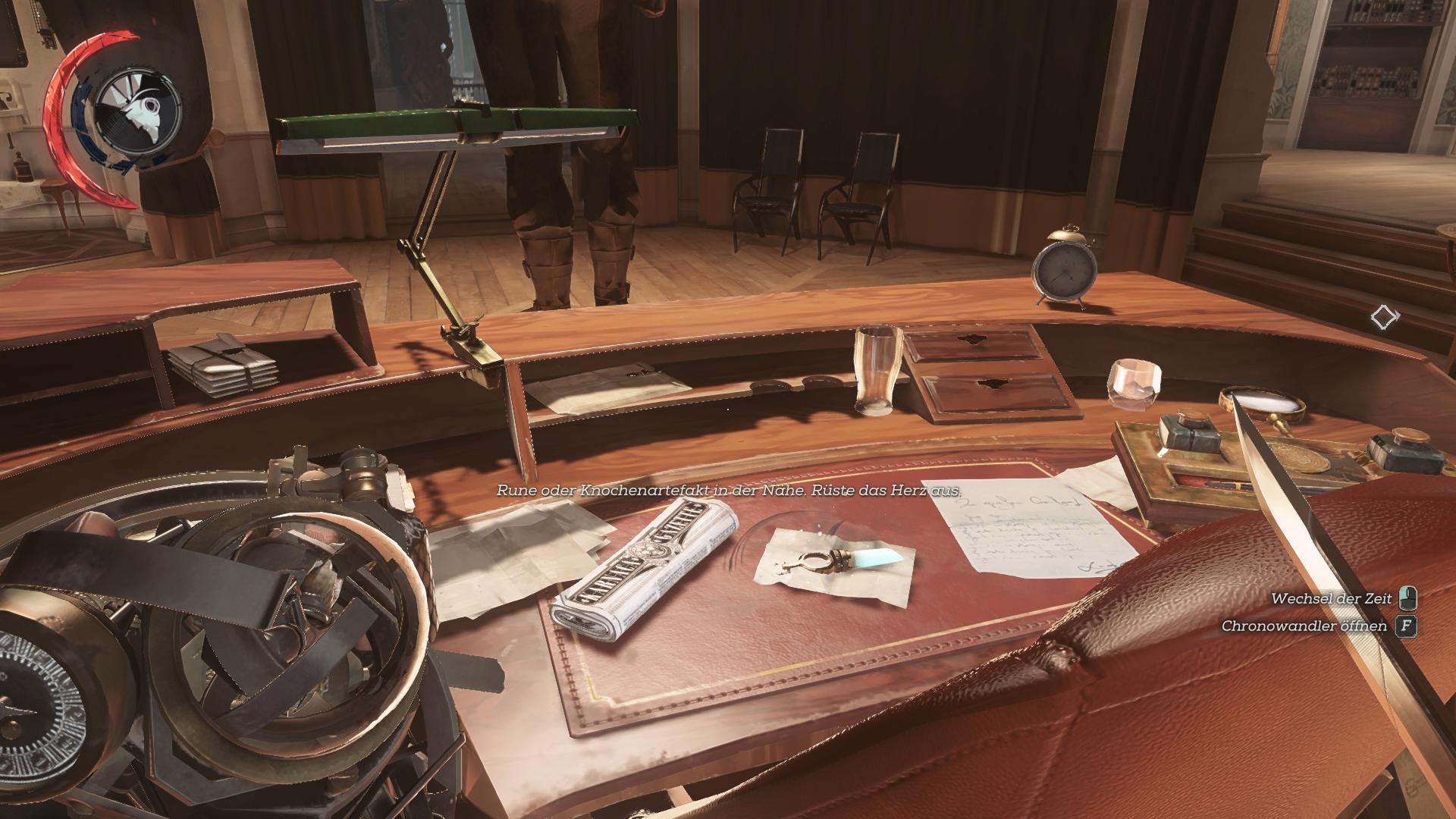 Geht vom Eingang des Hauses aus die Treppe im Foyer hoch und durch die Glastür zur großen Halle. Auf der linken Seite, wo bisher eine Baustelle war, ist nun ein Durchgang zu Aramis Stiltons Büro. Geht um die Statue herum und nehmt das Knochenartefakt vom Schreibtisch.