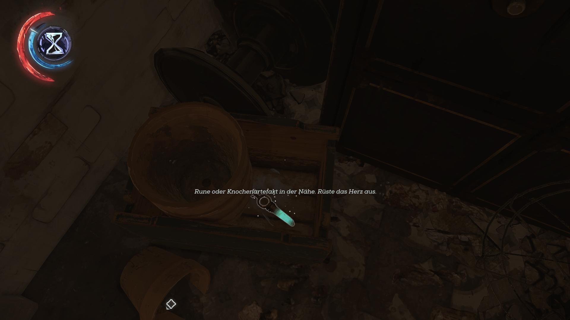 Fundort:Verlasst den Platz mit der Statue Richtung Promenade und geht durch die Unterführung, wo zuvor die Lichtwand war. Klettert auf der rechten Seite hinter die Holzwand, wo die letzte Rune liegt, lauft bis zum Ende durch und springt von dort auf das Vordach des gegenüberliegenden Gebäudes. Klettert weiter bis aufs Dach hoch und nehmt das Knochenartefakt von der Ablage am Waschbecken.