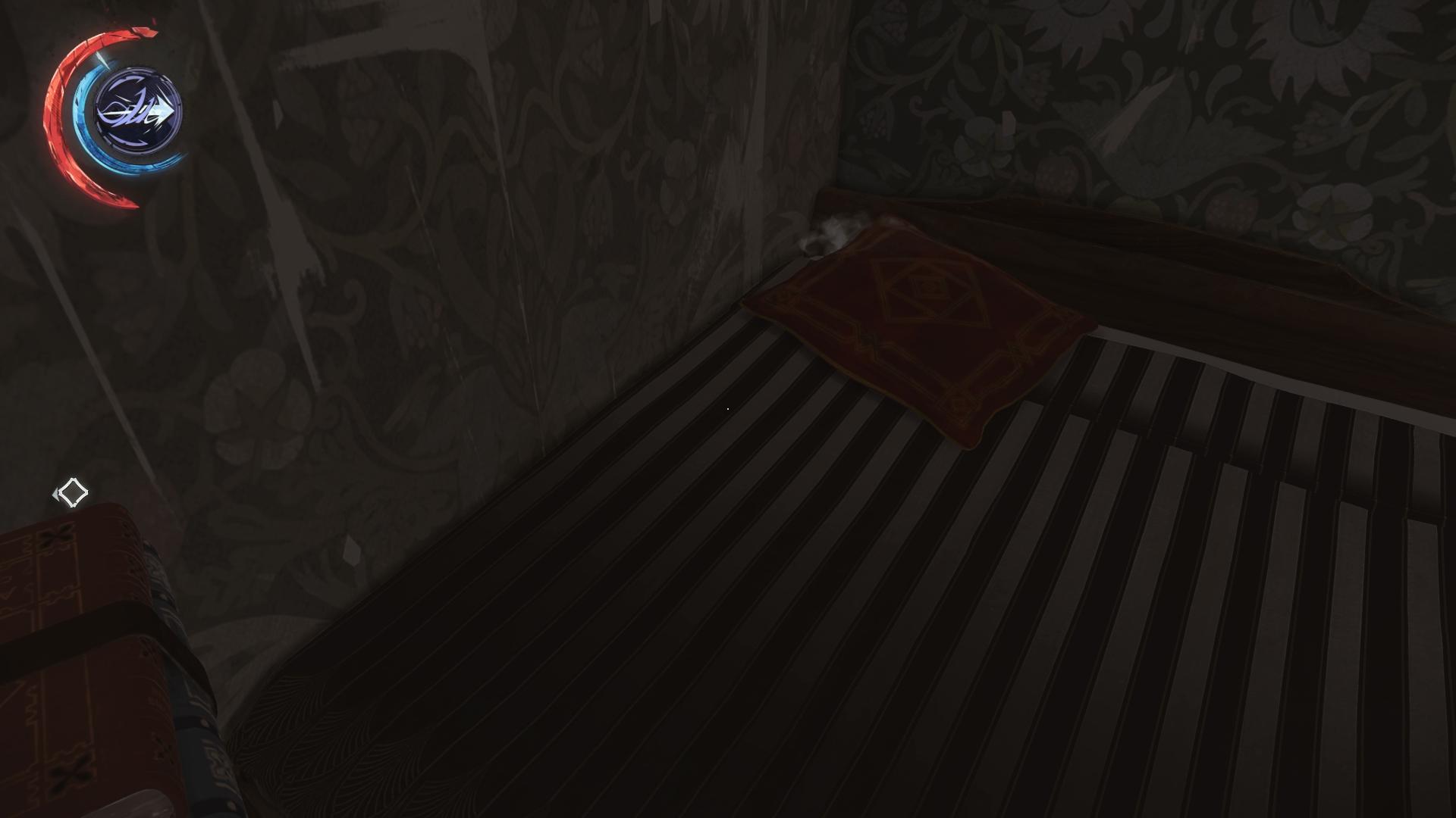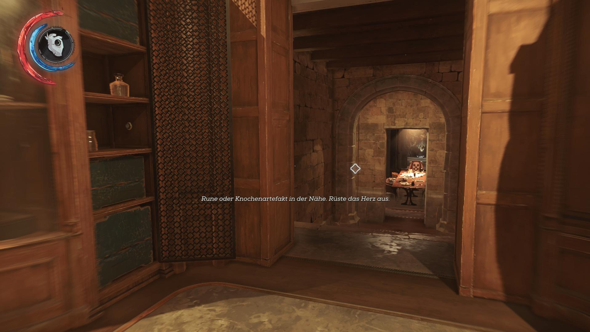 Geht vom Eingang des Palastes in das Esszimmer und dort auf den rechten Gang. Die Tür hinter der Treppe führt in einen roten Saal, wo auf dem linken Bett das Knochenartefakt ruht.