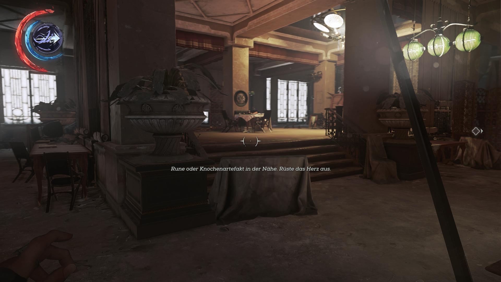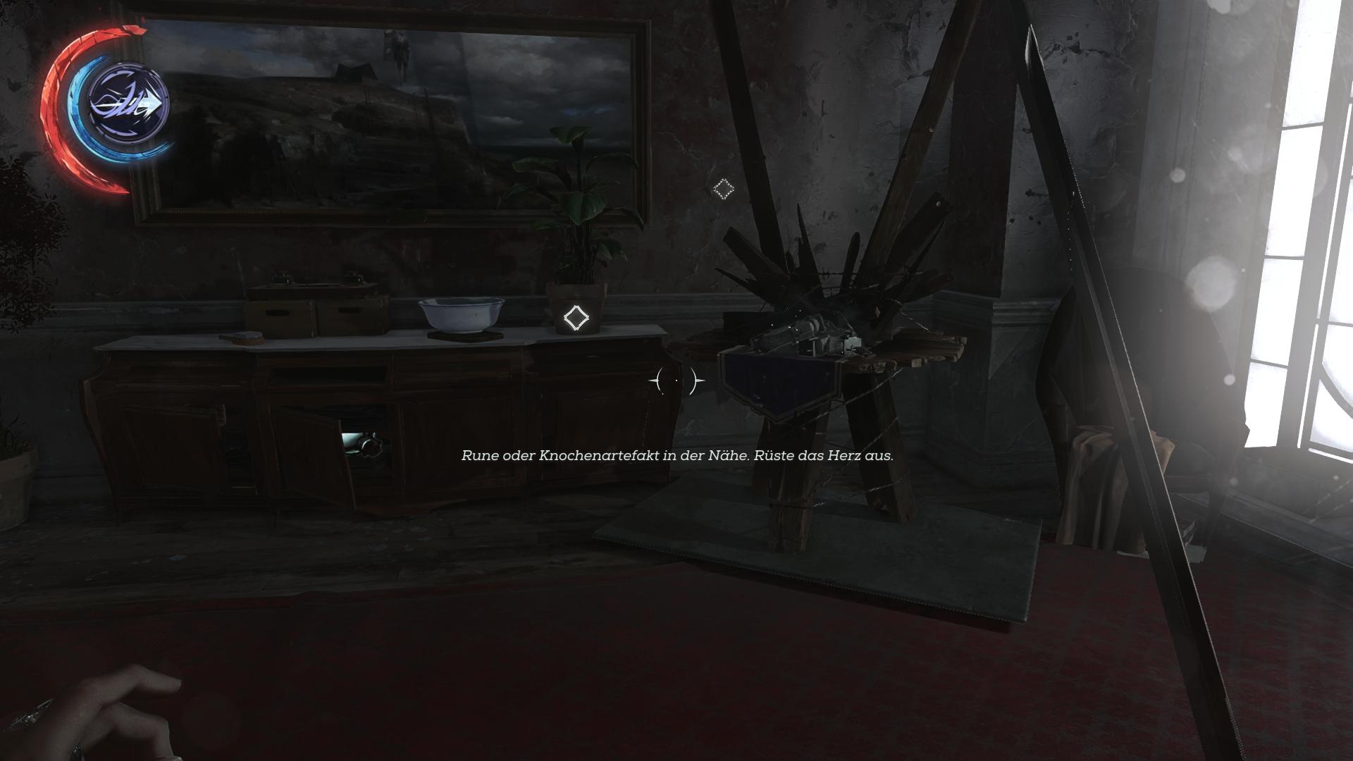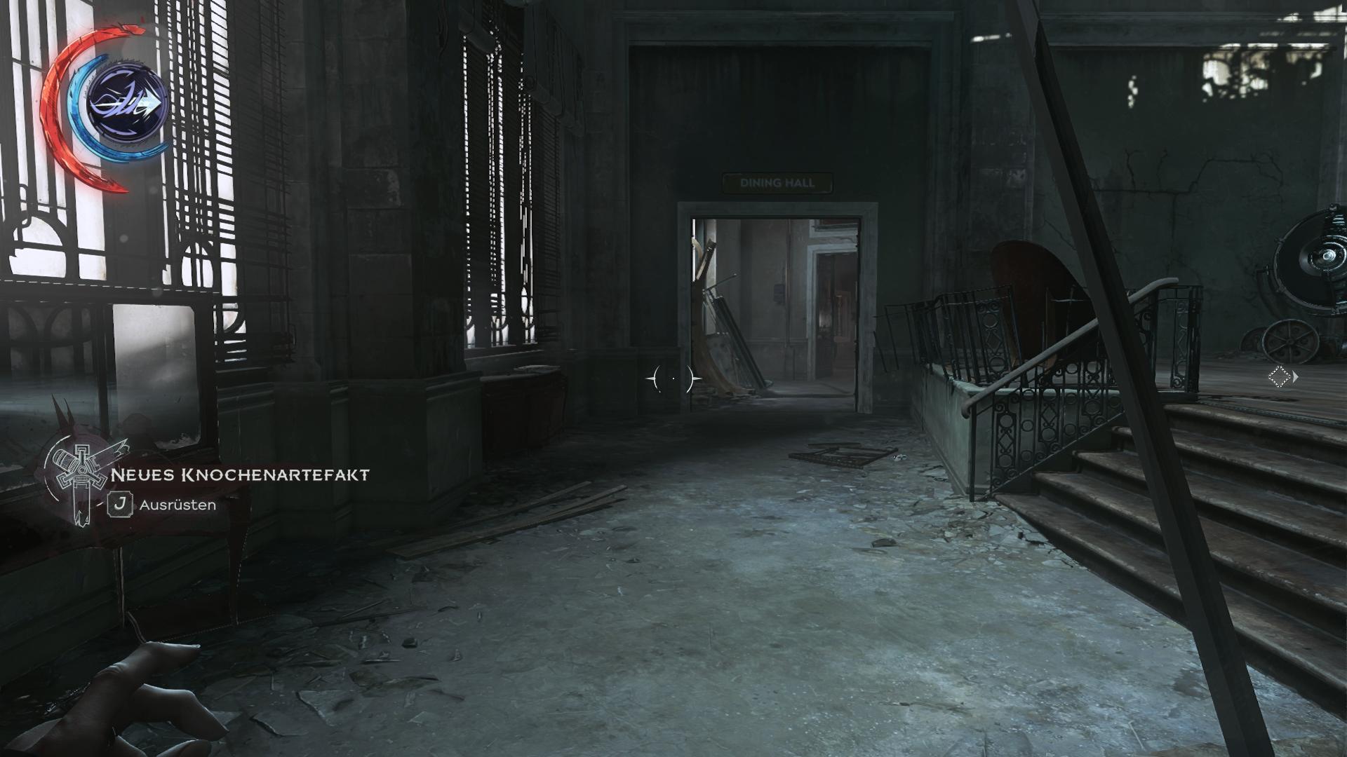 Fundort:Die erste Rune ist unweit der vorangegangenen Knochenartefakte zu finden. Geht aus der Eingangshalle den linken Gang entlang in den Speisesaal. Auf der zentralen Plattform erhebt sich eine Säule, mit einer runden Trophäe. Daran ist die Rune aufgehängt.