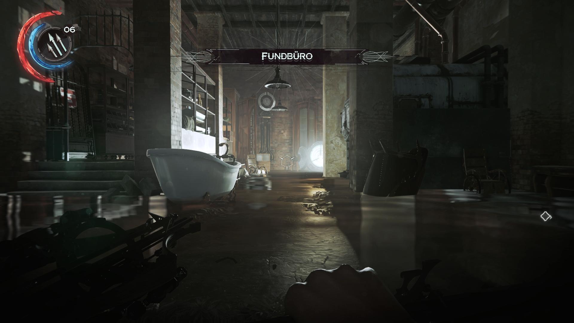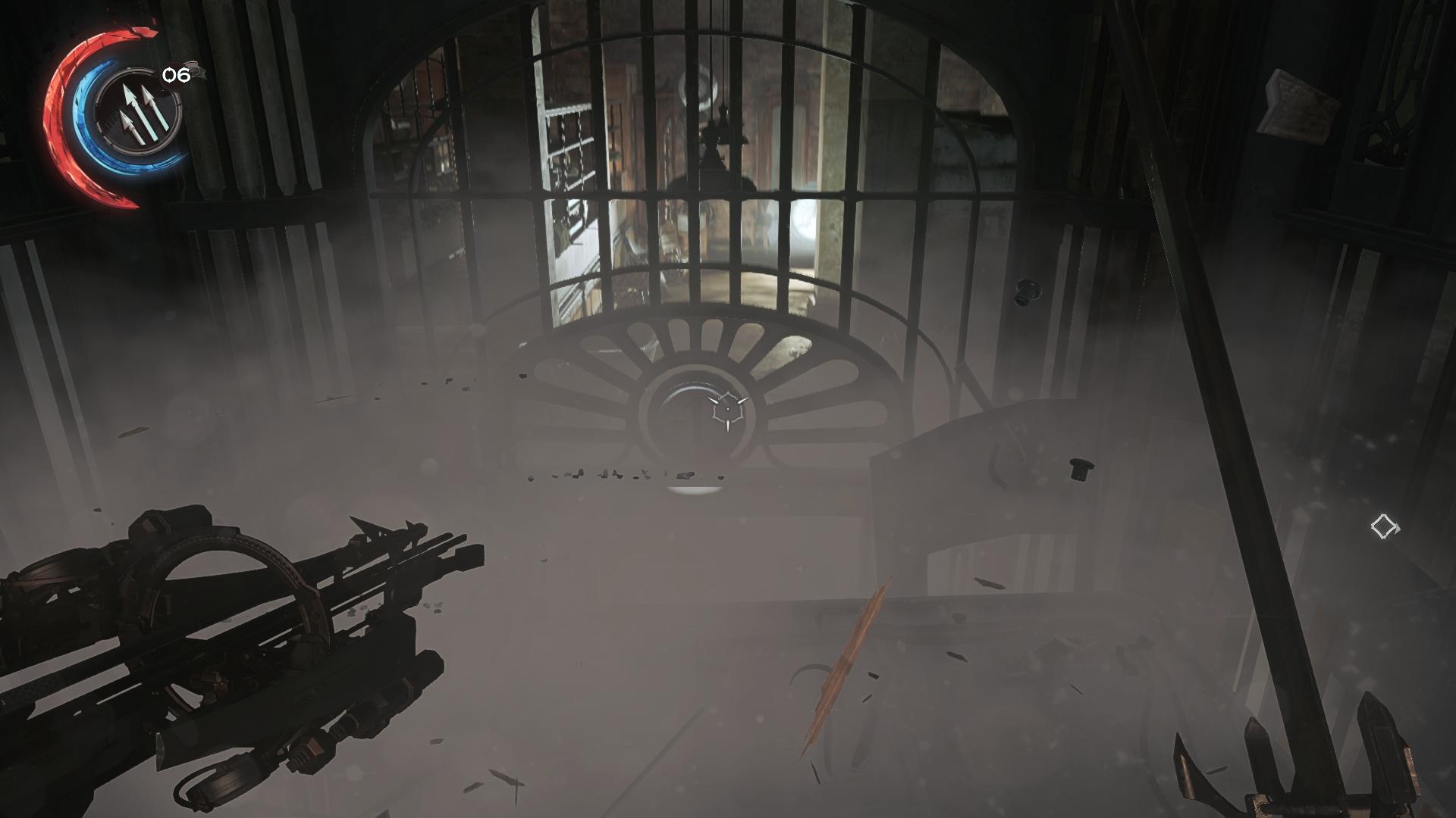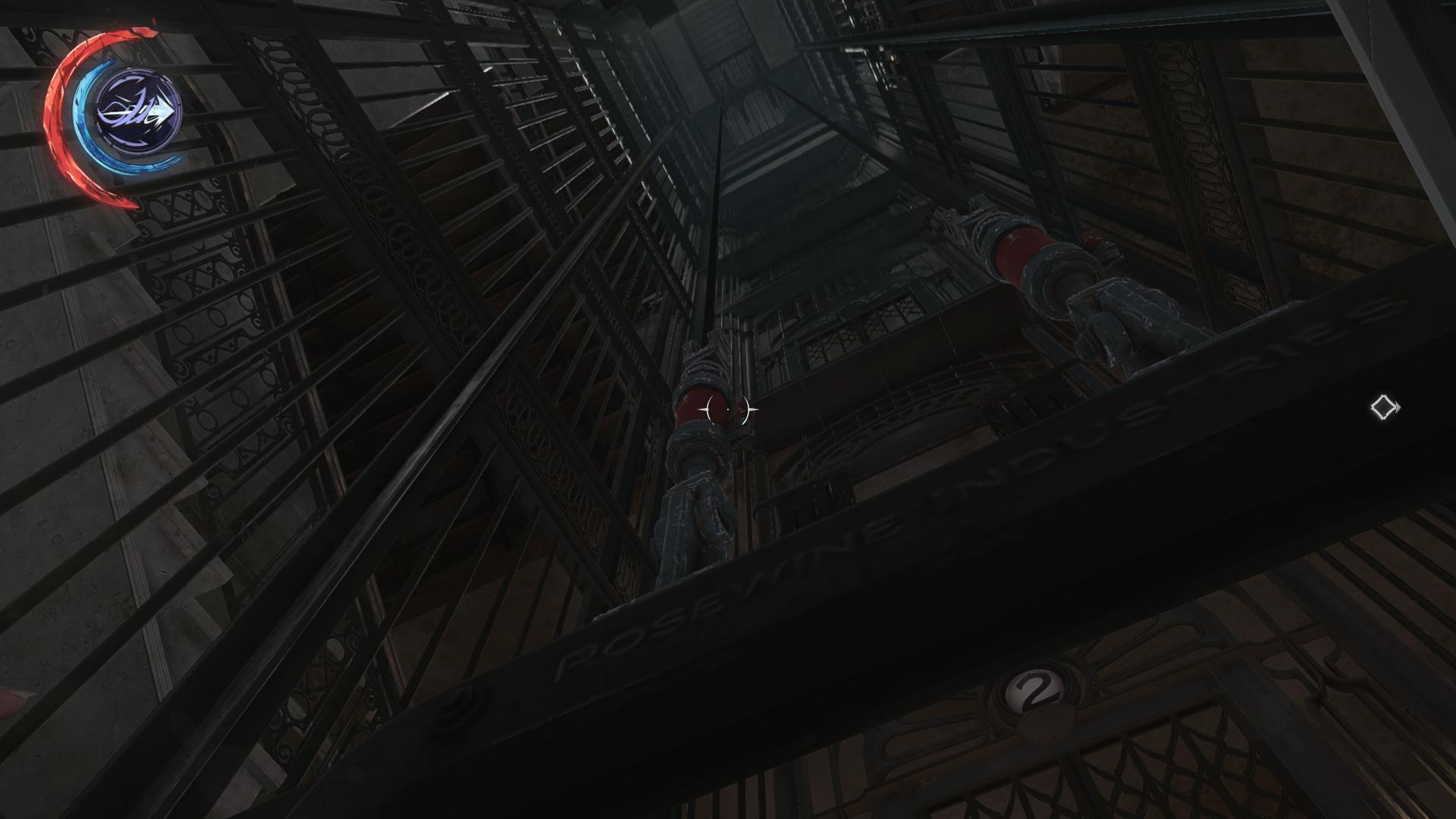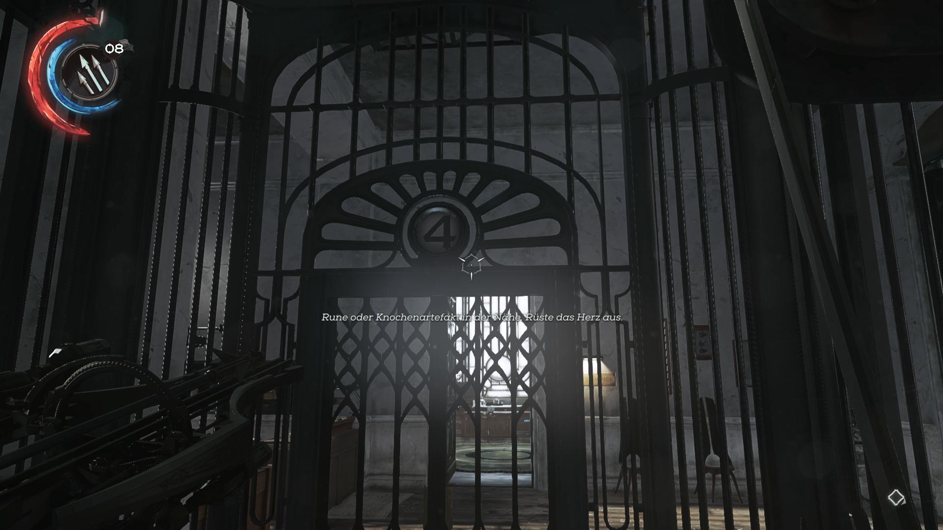 Wenn ihr bereit seid, steigt im Erdgeschoss in den Fahrstuhl ein, klettert auf die Fahrstuhlkabine und zerschießt die roten Halterungen an den Stahlseilen über euch. Dadurch rast der Fahrstuhl in den Keller und ihr könnt euch die Rune aus dem Regal links holen.