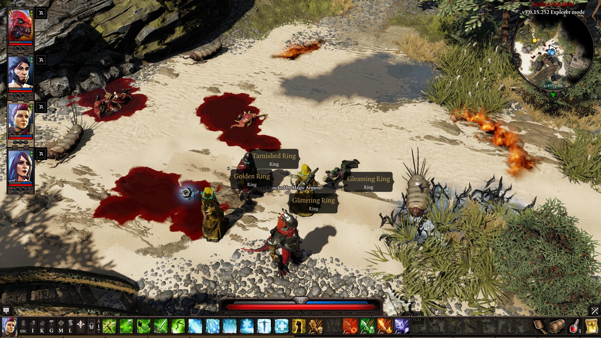- Fundort:Der Gleaming Ring ist zusammen mit dem Glittering Ring, Golden Ring und Tarnished Ring am Strand nahe dem Ausgang vom Sanctuary of Amadia vergraben. Der Ort ist gleichzeitig das Nest einiger Void Salamander. Nachdem ihr die Salamander besiegt habt, solltet ihr euch das Areal mit den Blutlachen und Leichen genauer ansehen. Mit einem hohen Wits Attribut entdeckt ihr umgehend die Stelle zum Graben (495/88).