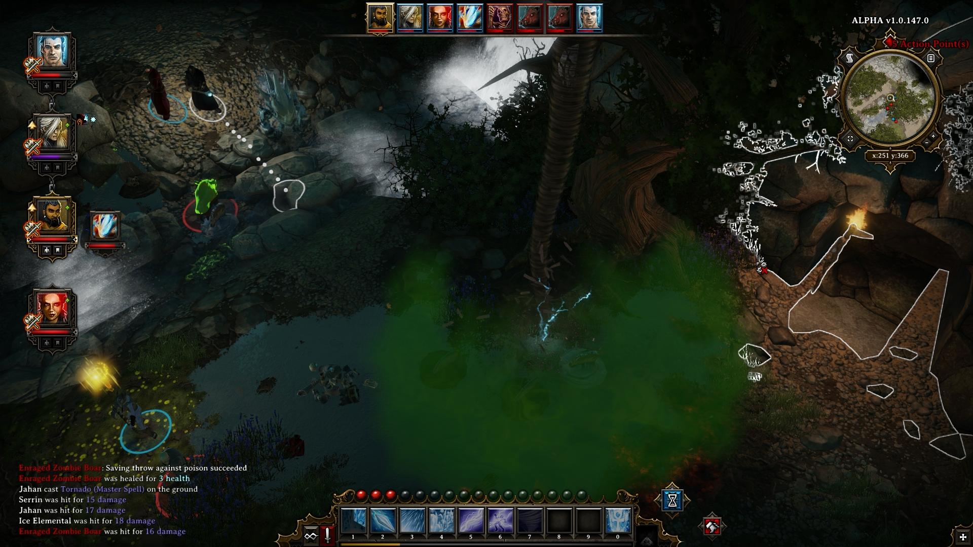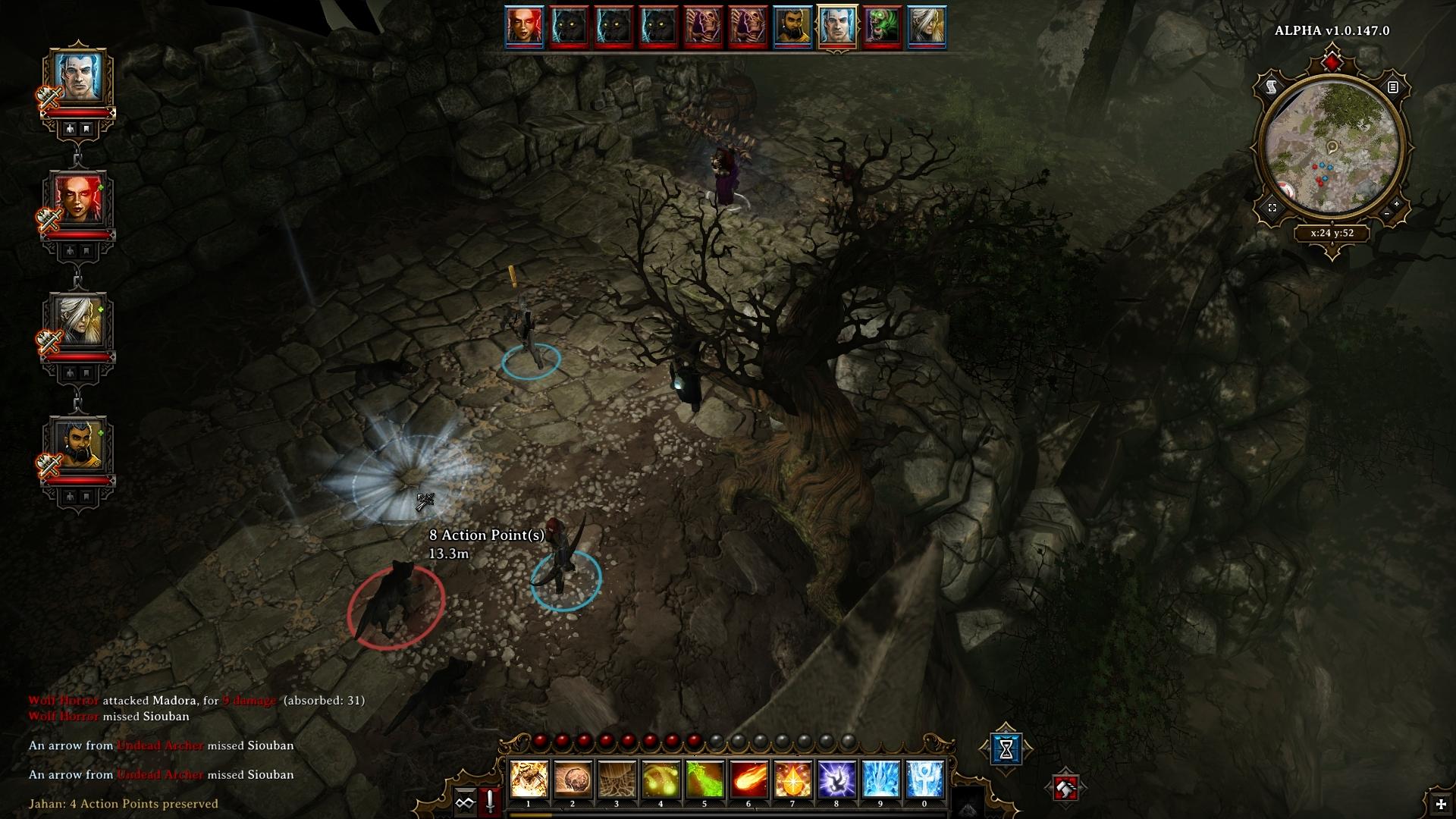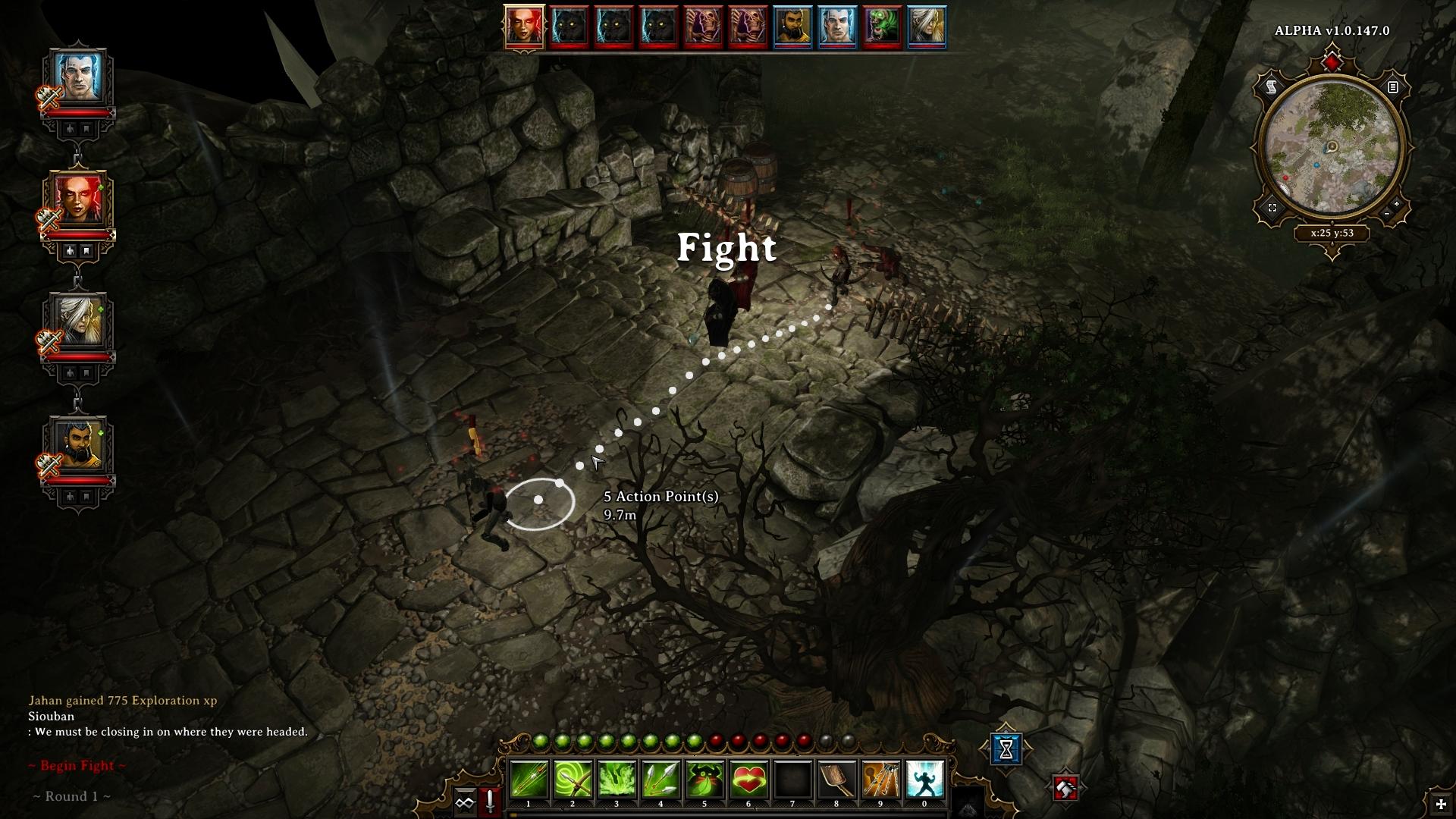 Eine Besonderheit des rundenbasierenden Kampfsystems ist es, dass sich nur die im Kampf befindlichen Charaktere rundenweise bewegen müssen. Was sich verwirrend anhört, wird klar wenn man weiß, dass sich die Gruppe aufteilen lässt. Ein Charakter kann jederzeit (außerhalb des Kampfes) von der Gruppe getrennt werden, indem man sein Portrait aus der Gruppe zieht. Optisch wird dabei die Kette zwischen den Portraits entfernt und spielerisch folgt der Charakter nicht mehr dem Weg des Anführers. Auf diese Weise können der Krieger (Warrior) und die beiden Zauberer (Wizards) z.B. frontal auf die Gegner zu marschieren und in den Kampf verwickelt werden. Nachdem in der ersten Runde alle Gegner auf das Trio zu gelaufen sind, läuft der überlebenskünstler (Survivor) in Echtzeit einen anderen Weg entlang und kommt von hinten zum Geschehen. Erst in dem Moment wo er einen Angriff ausführt, oder von jemandem im Kampf gesehen wird, wechselt auch er in den Runden-Modus. Es bieten sich also unzählige Wege den Feinden auf hinterhältige Weise den Gar aus zu machen.