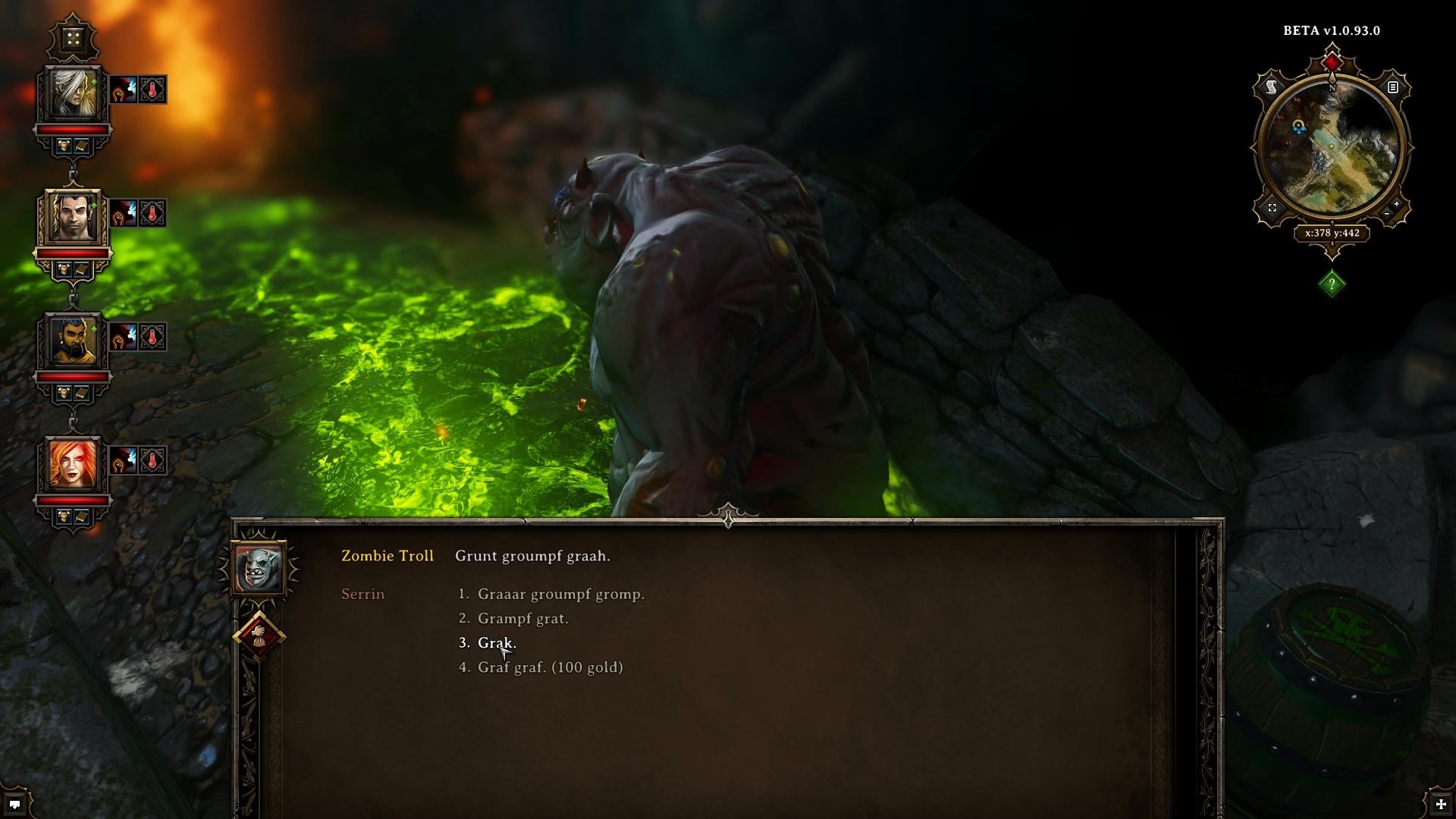 Um zu Braccus Rex zu gelangen, müsst ihr jedoch weiter nach Südosten, wo ein Zombie-Troll (13) die einzige Brücke blockiert. Er spricht aber nur einen Zombie Dialekt trollisch. Von dem Verrückten auf dem Friedhof (14) erhaltet ihr als Beute u.a. ein Übersetzungsbuch. Die möglichen Gesprächsoptionen bedeuten: