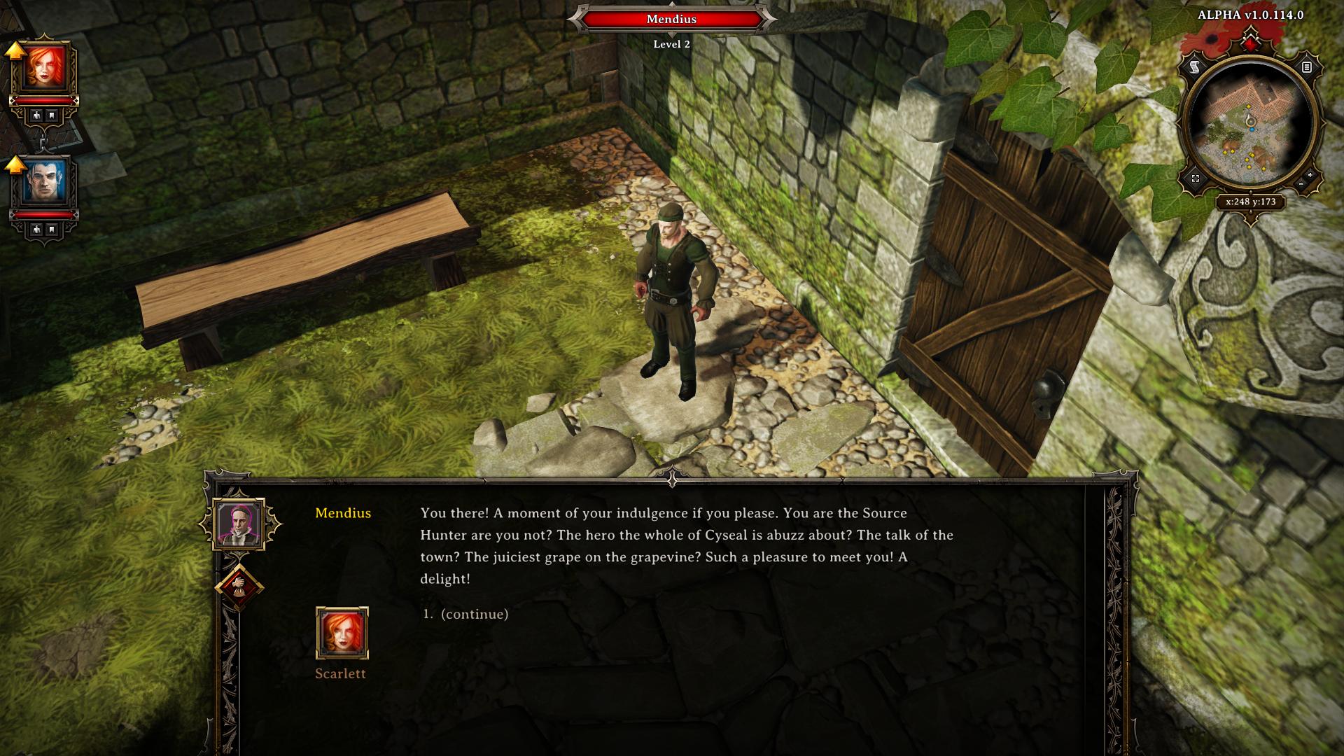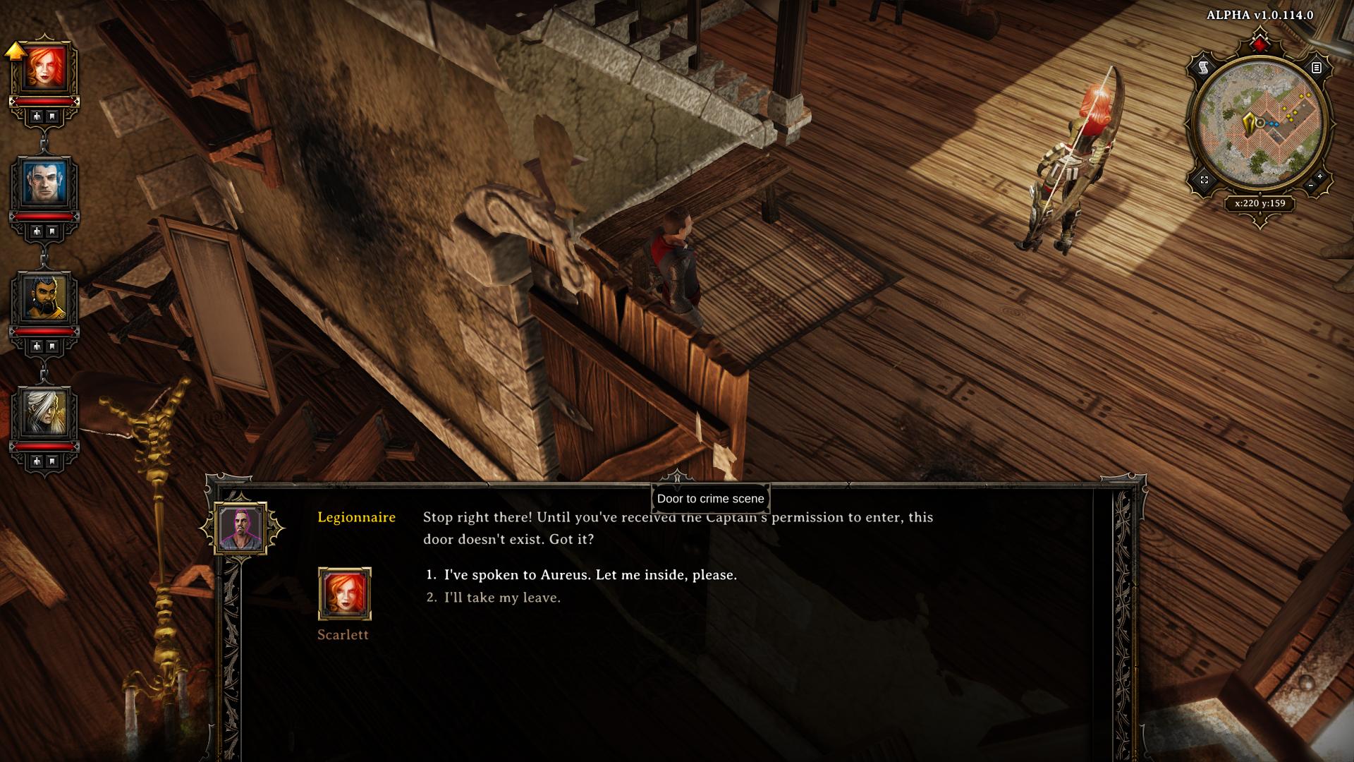 Der Zauberer Arhu hat euch gebeten den Tatort zu untersuchen, welcher sich in der "Gasthaus zur Königskrabbe" (King Crab Tavern) (E) befindet. Vor der Eingangstür wirbt Mendius für "die Fantastischen Fünf ("Fabulous Five"). Eine Heldentruppe, die vom Bürgermeister angeheuert wurde, um eines von Arhus fehlgeschlagenen Experiment zu vernichten. Den Roboter müsst ihr auf dem Weg ohnehin beseitigen, ihr könnt der Gruppe also gerne beitreten. Auf diese Weise könnt ihr bei Anna in der Taverne gute Ausrüstung kaufen. Wenn ihr kein Interesse habt und die Erzählungen für zu gut haltet, um wahr zu sein, wird die Quest später unter einem anderen Titel in eurem Questlog vermerkt ("Arhus fehlgeschlagenen Experiment") und ihr bekommt einen Umsichtig +1 (Schleichen) Bonus. Unter den Gästen der Taverne befindet sich Madora (Ritter/Knight), die anbietet sich eurer Gruppe anzuschließen. Wenn ihr das Spiel mit einer vierköpfigen Gruppe bestreiten wollt, solltet ihr dem Angebot zustimmen. Alternativ dazu könnt ihr euch auch bei den Stufenaufstiegen für das "Einsamer Wolf" (Lone Wolf) Talent entscheiden. Das streicht einen Gruppenslot zu Gunsten von einer prozentualen Verbesserung der eigenen Charakterattribute (mehr Informationen dazu findet ihr in unserem Charakteroptimierung-Guide). Versucht den Tatort im Süden des Gasthauses zu betreten. Die davor positionierte Wache, will euch jedoch nicht passieren lassen. Ihr müsst euch zunächst eine Genehmigung einholen. In einem der unverschlossenen Zimmer des Obergeschosses könnt ihr übrigens Shareth besuchen. Sie verkauft Fertigkeitenbücher für Hexerei (Witchcraft) und Schuft (Scoundrel) Fertigkeiten.