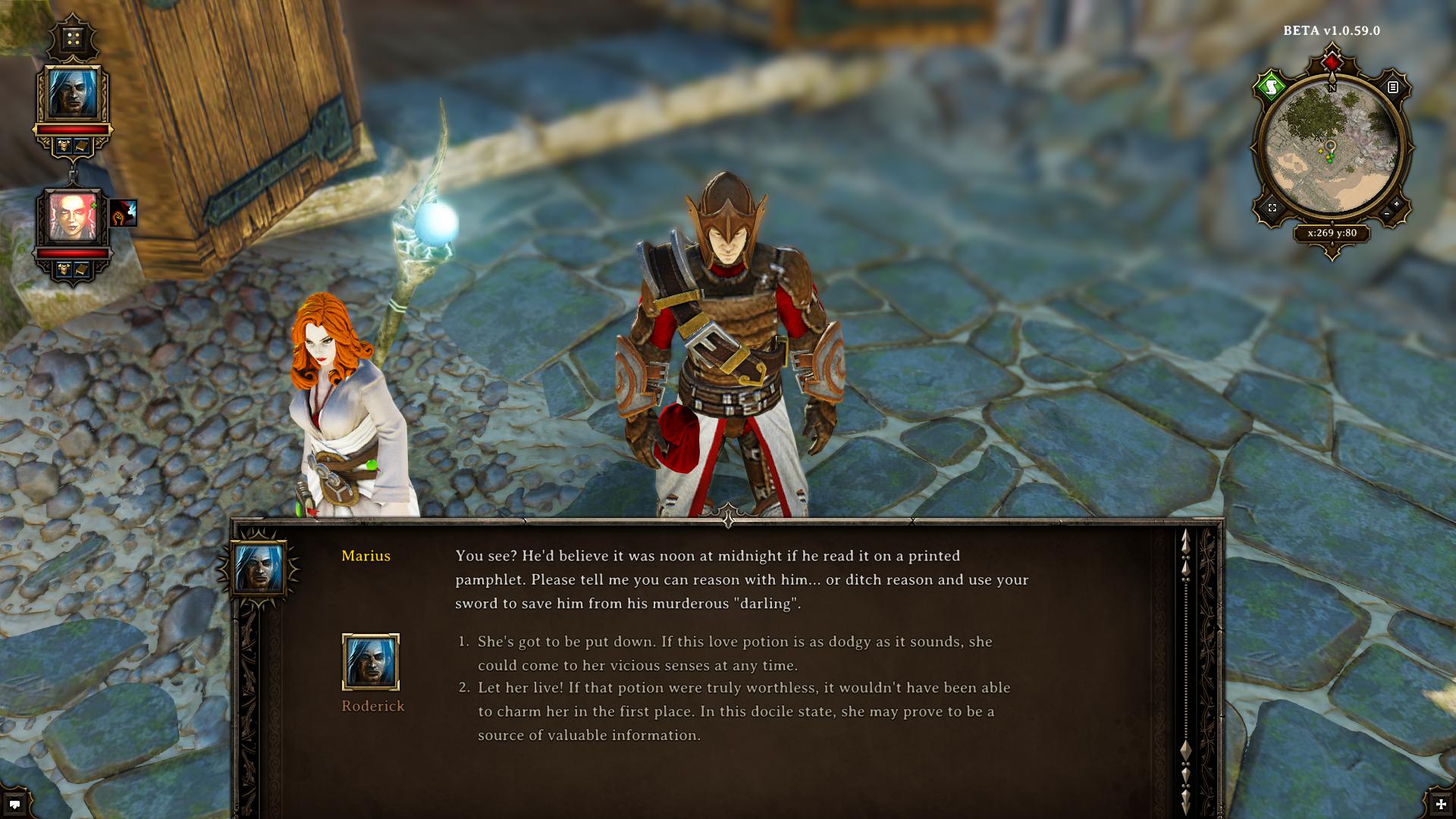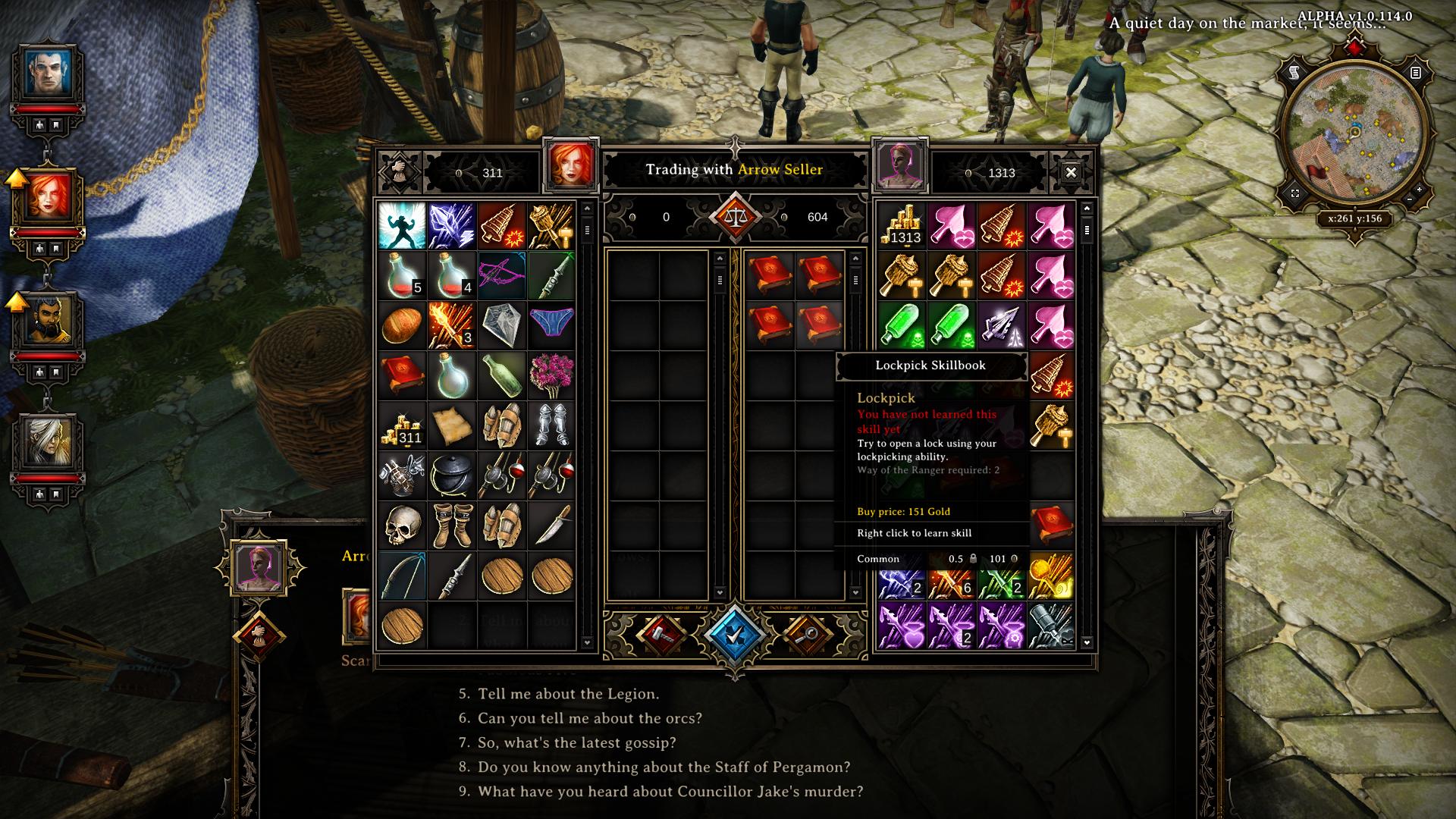 Direkt hinter dem Stadttor (südlich davon) liegt ein brennendes Boot vor Anker (2). Nutzt den gerade gefundenen Regenzauber (Regen Schrifrolle) und richtet ihn auf das Feuer. Das macht euch zwar nass, aber das Feuer ist gelöscht. Im Hafen-Lagerhaus (B) könnt ihr den bisher eingesammelten Schrott verkaufen und weitere Ausrüstungsgegenstände im Tausch erstehen. Am Hinterausgang des Lagerhauses (Osten) haben zwei Legionäre eine Ork-Dame bezaubert. Hier könnt ihr einen weiteren Charakterzug (Traits) bekommen. Befehlt ihr den weiblichen Ork zu töten, erhaltet ihr erneut Pragmatisch +1 (mehr Handwerk). Lasst ihr die Orc-Dame am Leben, wird sie später die Wachen töten, wenn die Bezauberung verschwindet und ihr erhaltet Romantisch +1. Vor dem Hafen-Lagerhaus befindet sich der zweite Wegpunkt und wiederum östlich davon könnt ihr die Treppen hinauf zur Stadt erklimmen. Am Marktplatz beobachtet ihr wie in Junge den Fischhändler bestielt, um etwas zu Essen zu bekommen ("Der Fischdieb"). Das daraus resultierende Gespräch formt erneut euren Charakter. Entscheidet ihr euch dafür, dass der Händler ebenfalls essen muss, gibt es Gerecht +1, was die Führung Fähigkeit steigert. Wie bei den Wachen an der Brücke, müsst ihr euch auch diese Entscheidung für später notieren! Einen weiteren Charakterzug könnt ihr erlangen, in dem ihr Kelvania auf dem Markplatz ansprecht. Sie scheint unglaubliche Angst vor Männern zu haben. Für die "Männer sind statistisch gesehen gefährlicher als Frauen" Antwort gibt's Umsichtig +1 (Bonus auf Schleichen) und für "Sie sollte nicht die Hälfte der Bevölkerung wie Kriminelle behandeln" Entscheidung Kühn +1 (Bonus auf Initiative)