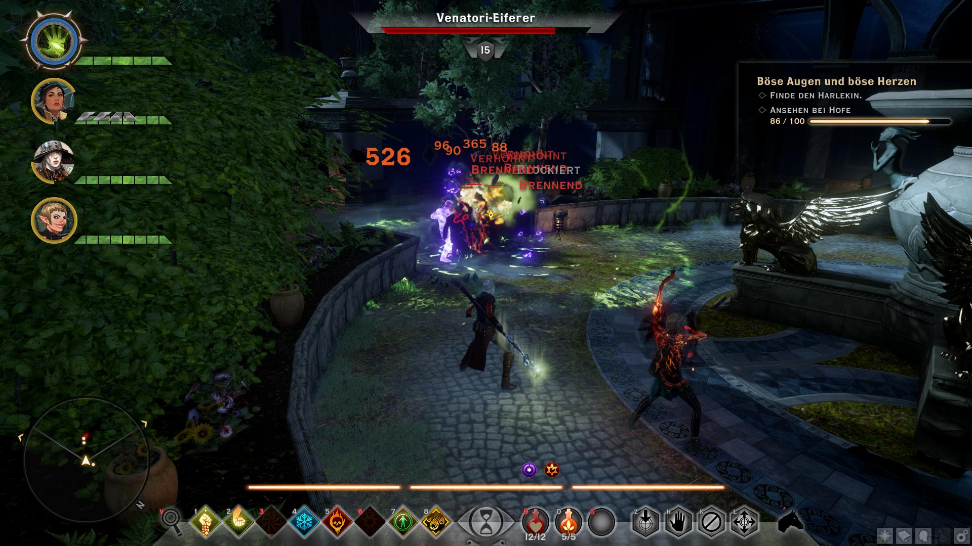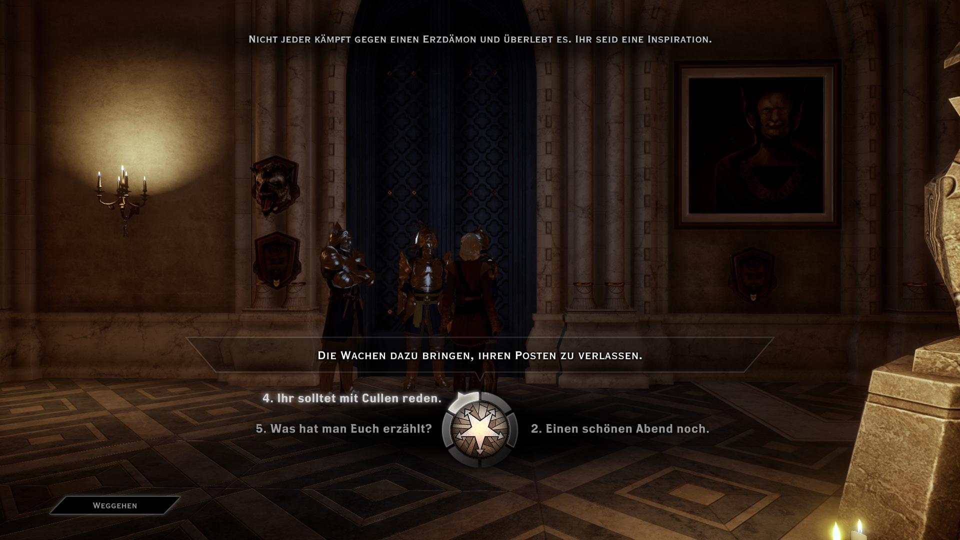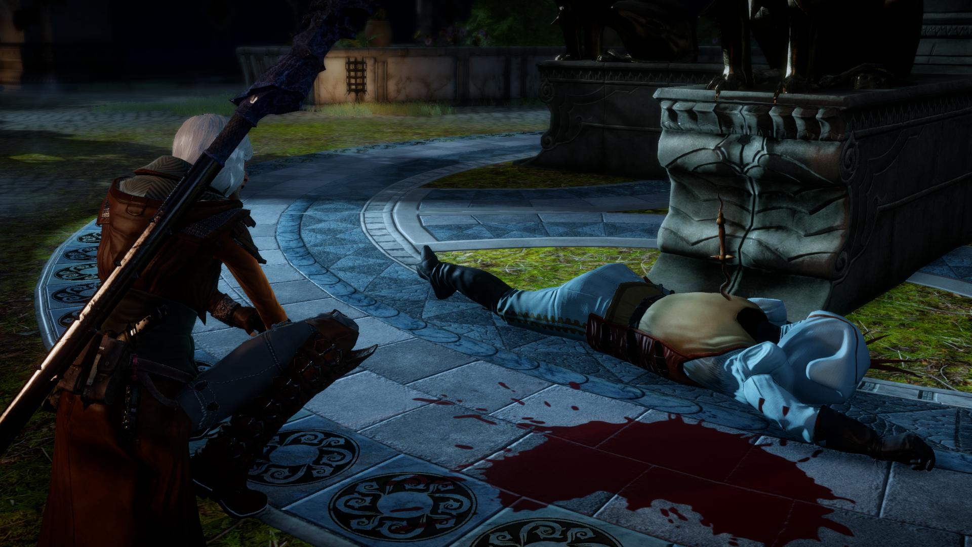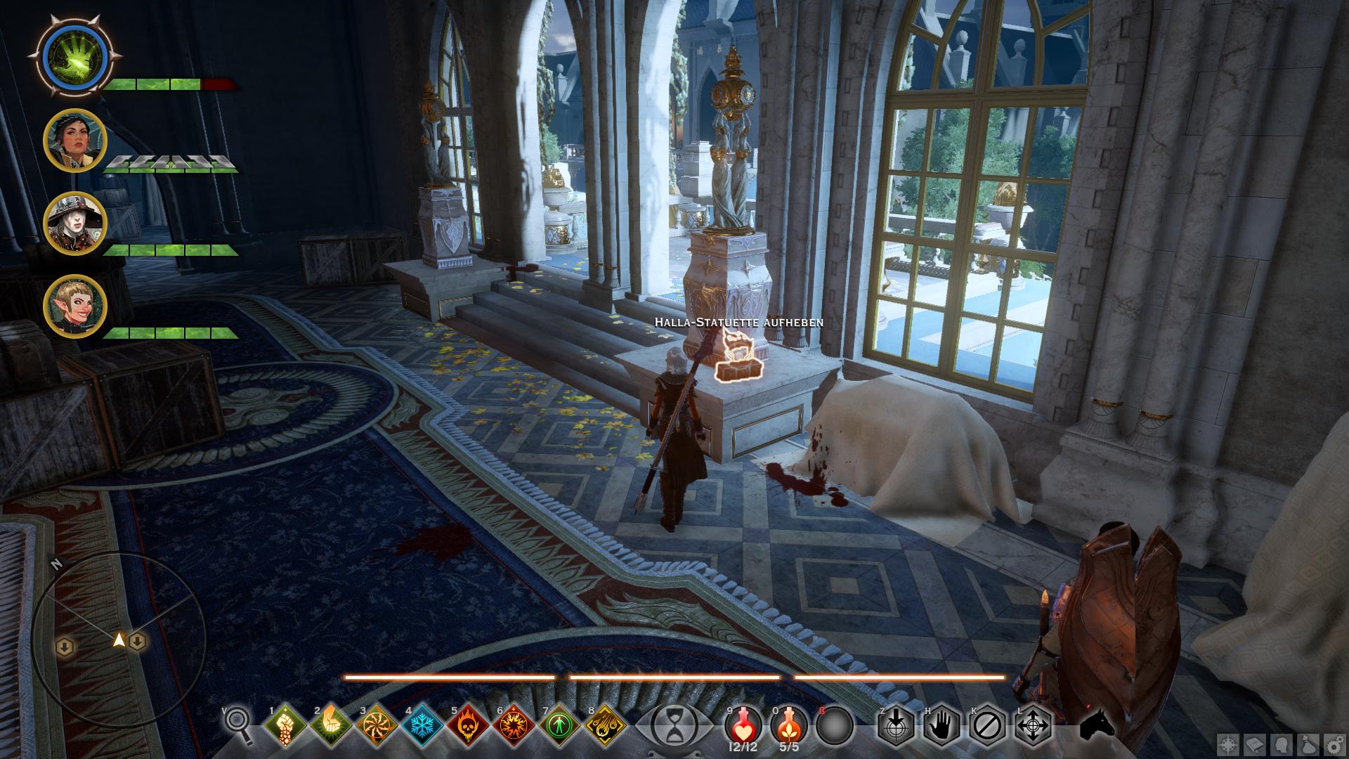 Am Brunnen liegt der Leichnam eines Adeligen und in seinem Rücken ein Dolch mit Gespards Familienwappen. Im selben Moment erscheint ein Harlekin auf der Bildfläche, sticht die letzte Bedienstete ab und verpufft dann wieder in einer Rauchwolke. Das aus dem Süden anrückende Venatori-Trio hindert euch daran den Harlekin direkt zu verfolgen. Habt ihr sie ausgeschaltet, solltet ihr schnell nördlich des Brunnens, die Treppe im Osten [3] hoch und dort die fünfte Halla-Statue und eine weitere Caprice-Münze an euch nehmen. Anschließend könnt ihr euch in die herrschaftlichen Gemächer im Westen aufmachen.