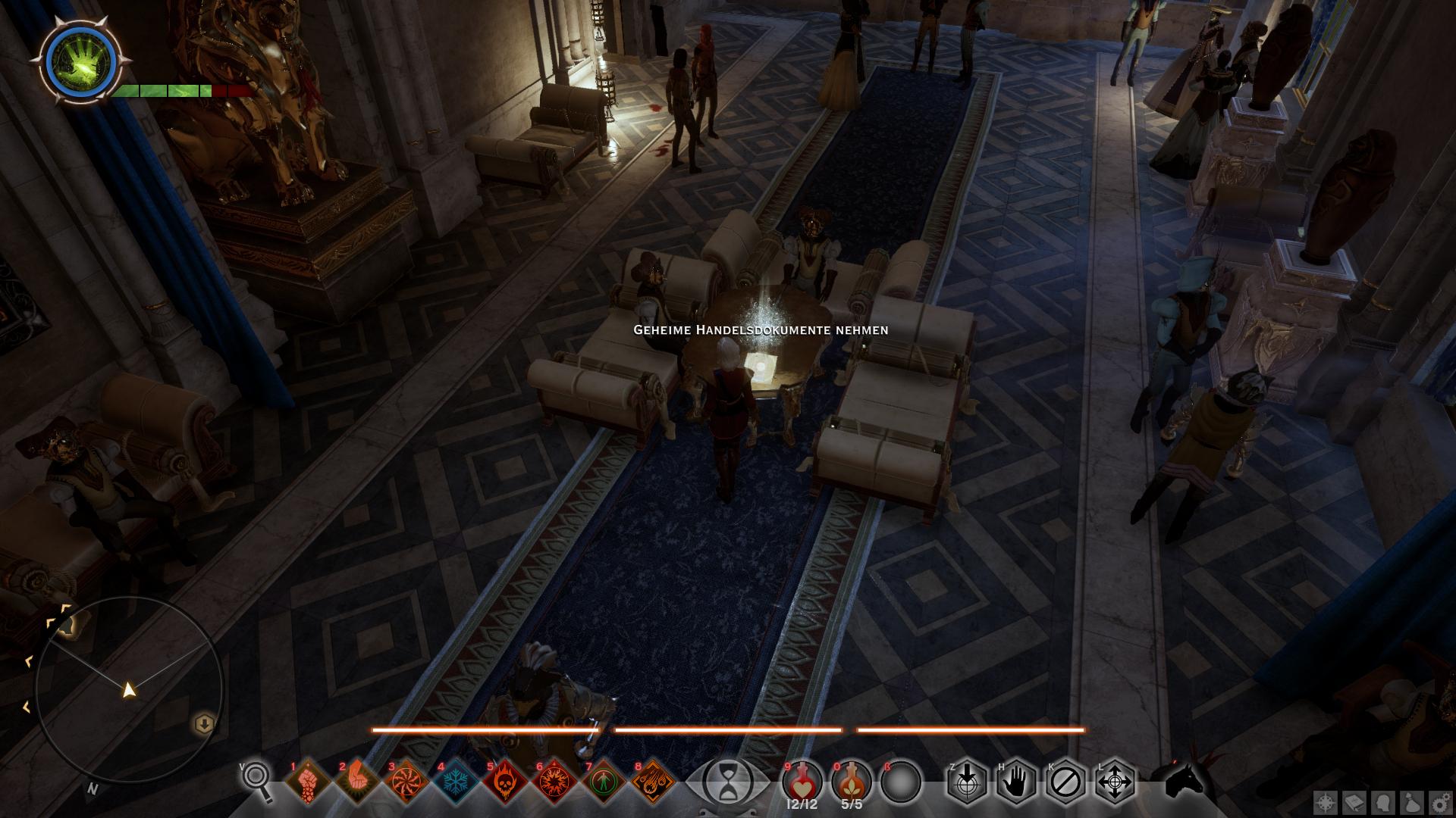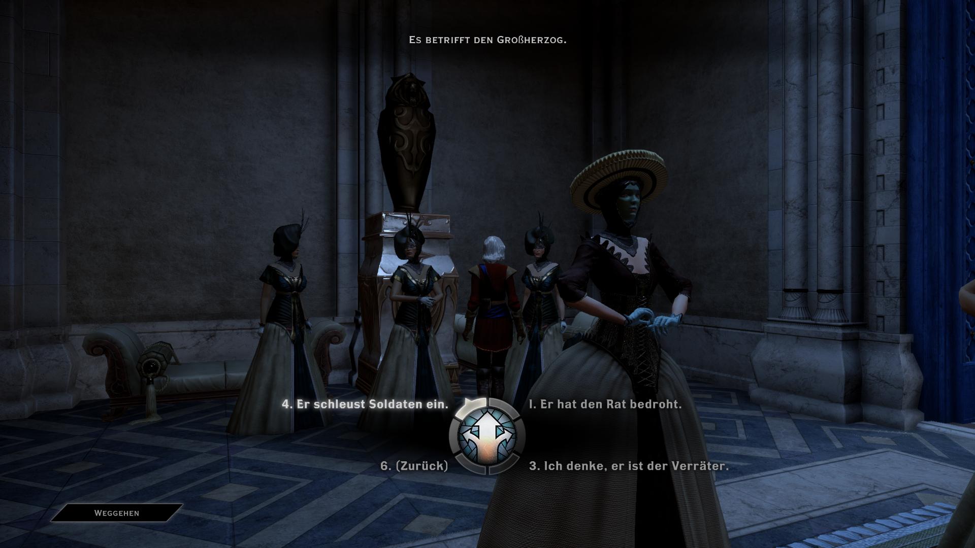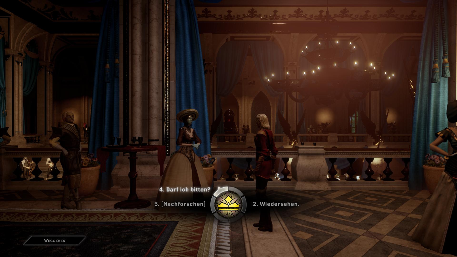 Im östlichen Gang des Obergeschosses erwartet euch der vermutlich härteste Kampf des Winterpalastes. Der Harlekin hat dort mit mehreren Venatori-Scharfschützen und Venatori-Eiferern einen Hinterhalt gelegt. Nutzt entsprechend eine eurer Fokus-Fähigkeiten, falls euch der Kampf zu schwierig erscheint. Sind die Ventori bezwungen, tritt Botschafterin Brialla auf die Bildfläche. Sie kam hierher, um den Tod ihrer Bediensteten zu rächen und ist von euren Handlungen beeindruckt. In Folge dessen gibt sie zu, sich in euch getäuscht zu haben und schlägt eine Partnerschaft vor. Die Entscheidung kann jedoch bis zum Ende des Balls warten. Nichts desto trotz, lenkt das wiederum den Verdacht auf Gespard.