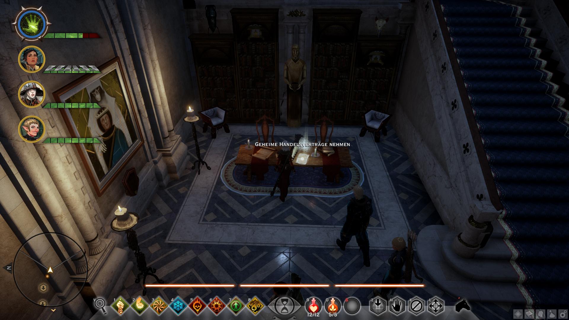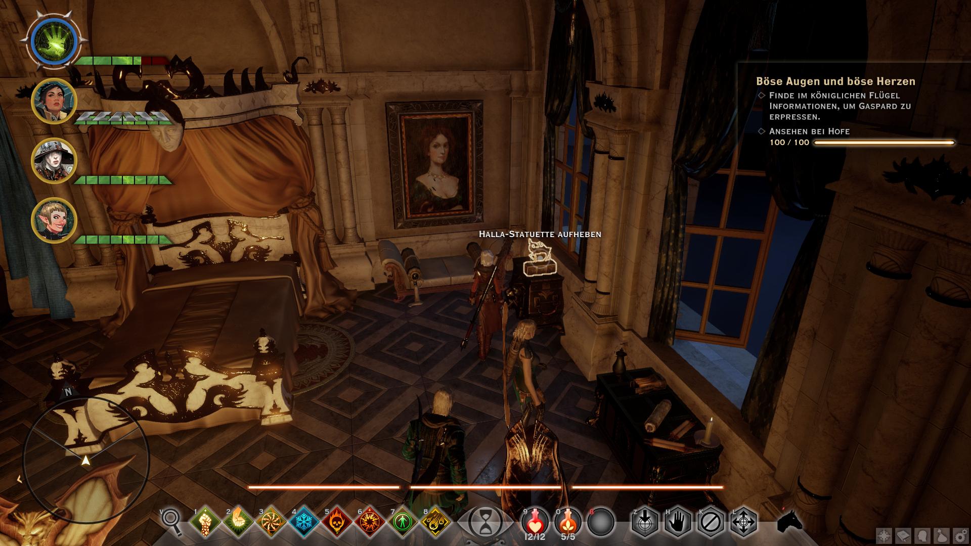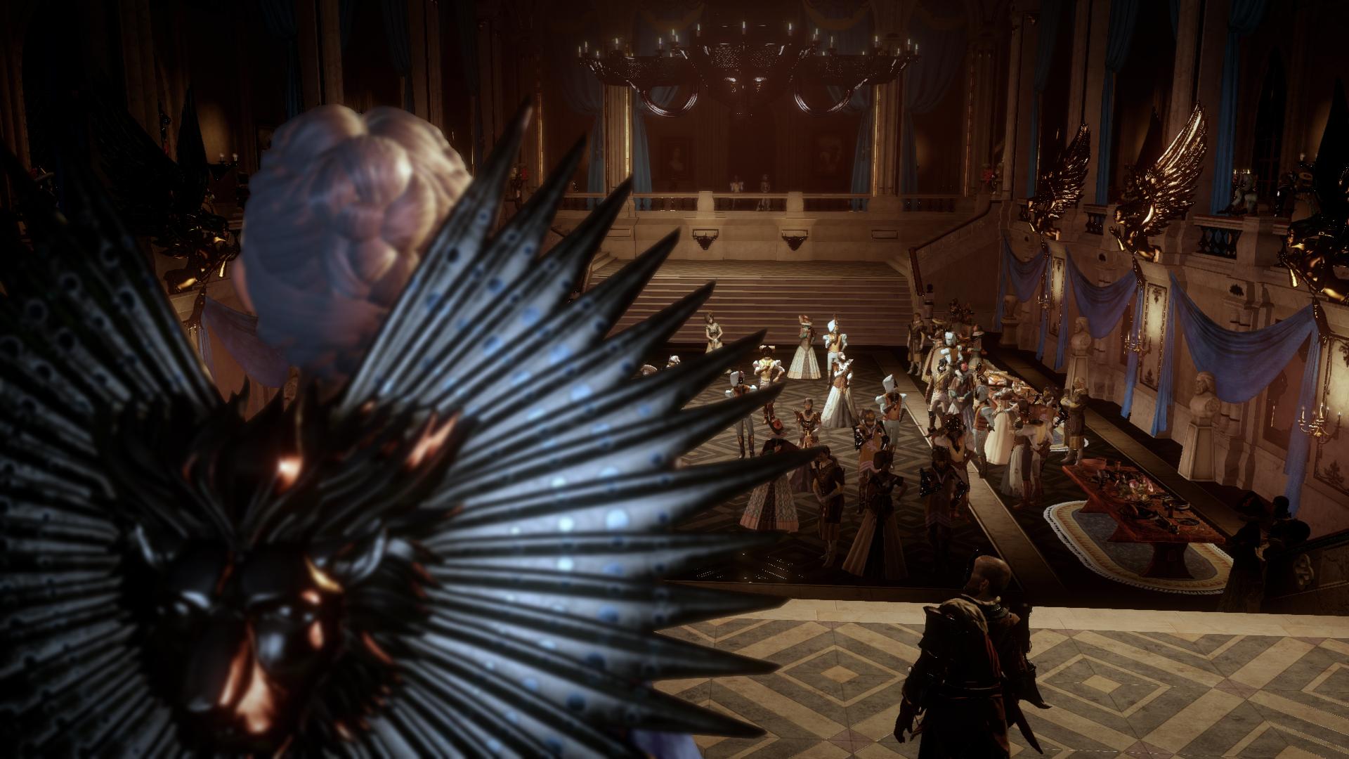 Begebt euch daraufhin über die Treppe im Süden [7] auf die Hauptebene zurück und kämpft euch am Harlekin und den Venatori vorbei zum Ballsaal [24] vor. Im Norden der Hauptebene der königlichen Quartiere findet ihr außerdem noch ein Vorratslager [23]. Solltet ihr weniger als 85 Ansehen beim Hofe haben, werdet ihr es vermutlich brauchen. Tretet ihr durch die Tür [24] zum Ballsaal, beginnt der Showdown im Winterpalast von Halamshiral.