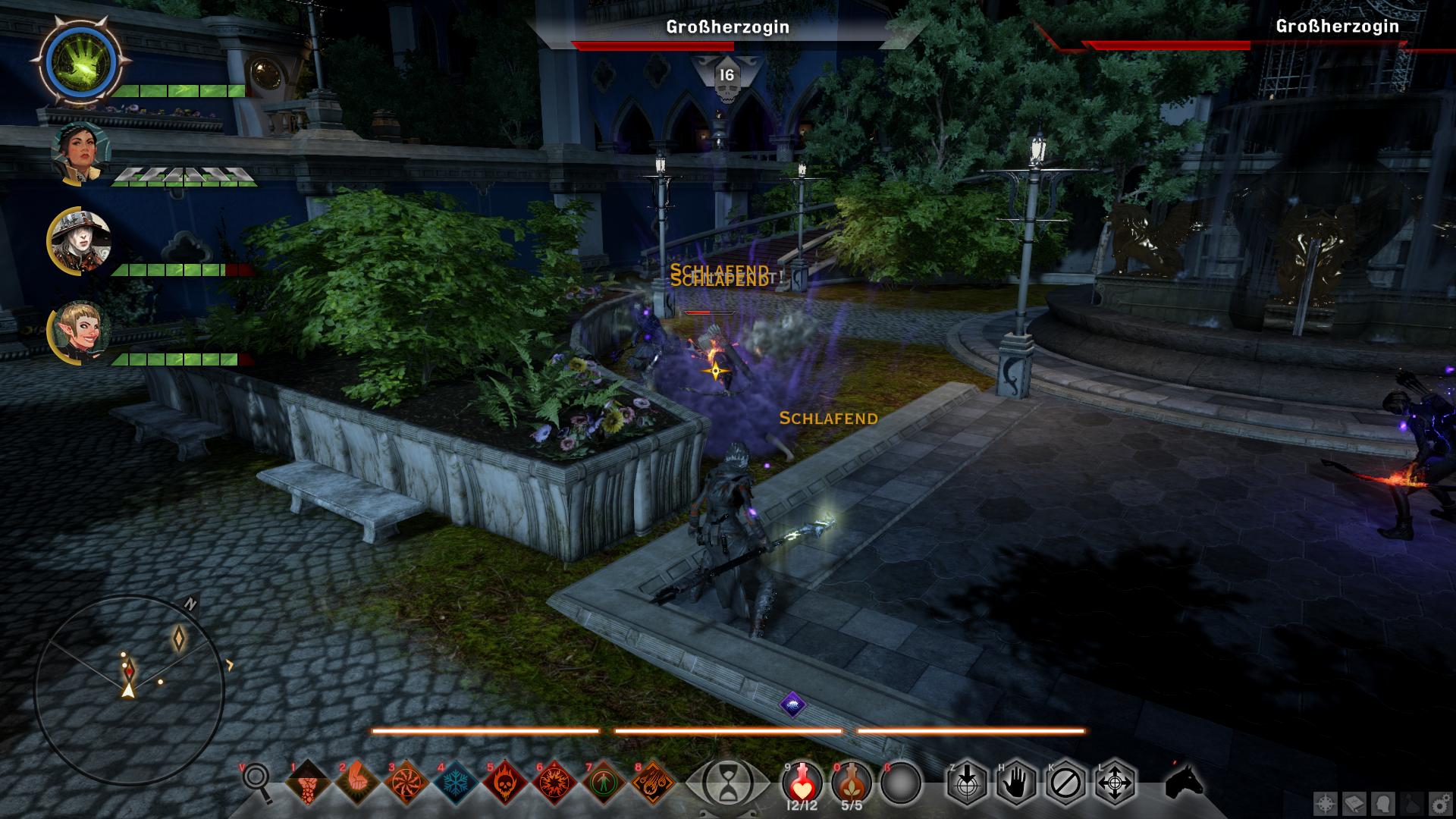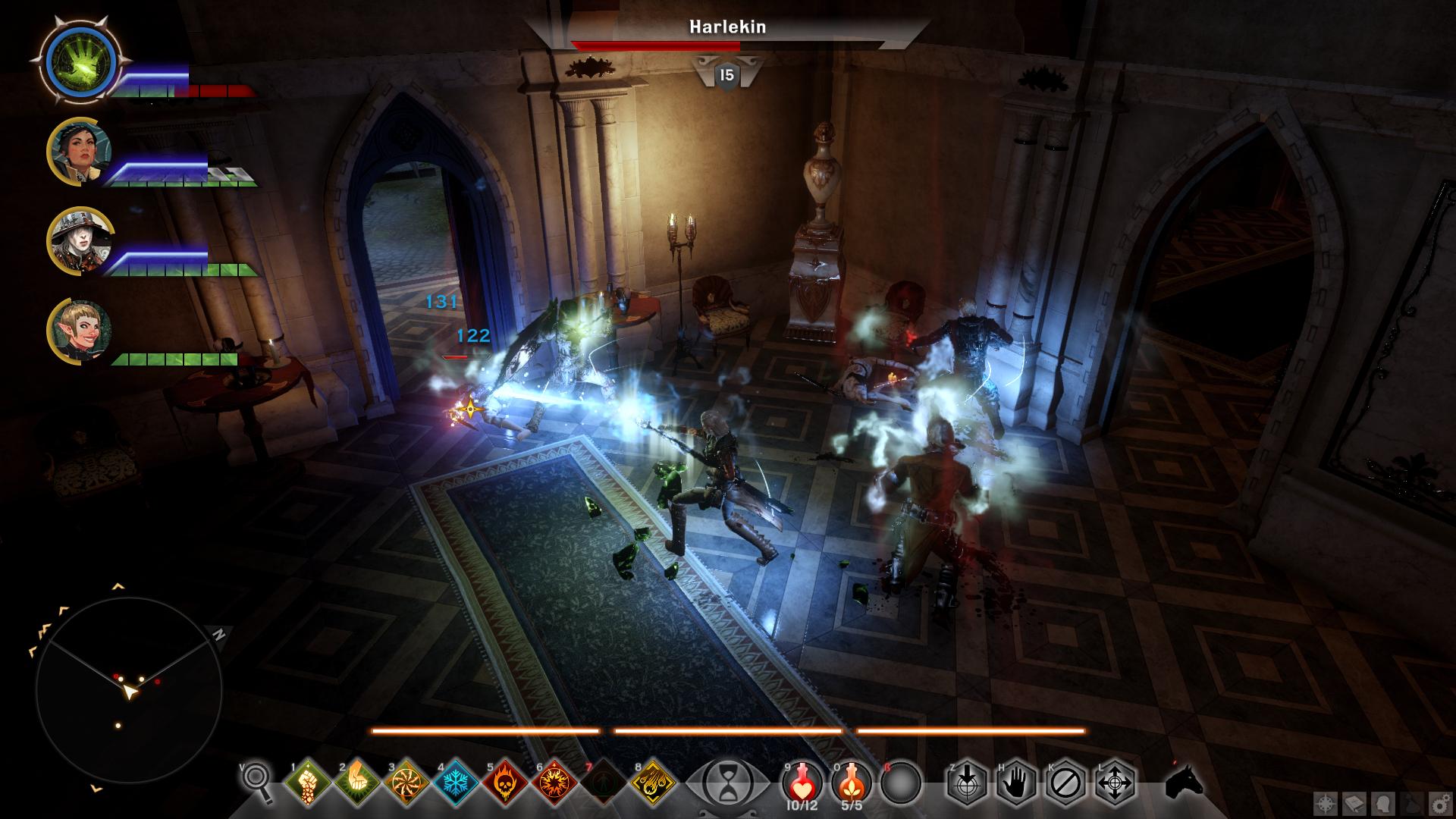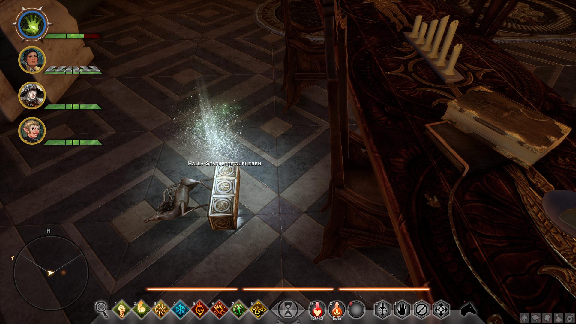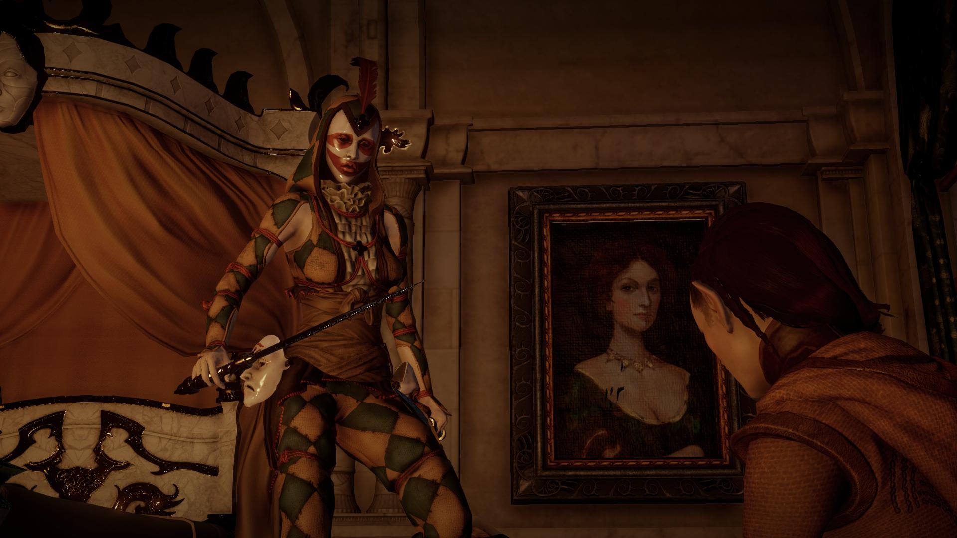 Begebt euch daraufhin über die Treppe im Süden [7] auf die Hauptebene zurück und kämpft euch am Harlekin und den Venatori vorbei zum Ballsaal [24] vor. Im Norden der Hauptebene der königlichen Quartiere findet ihr außerdem noch ein Vorratslager [23]. Solltet ihr weniger als 85 Ansehen beim Hofe haben, werdet ihr es vermutlich brauchen. Tretet ihr durch die Tür [24] zum Ballsaal, beginnt der Showdown im Winterpalast von Halamshiral.