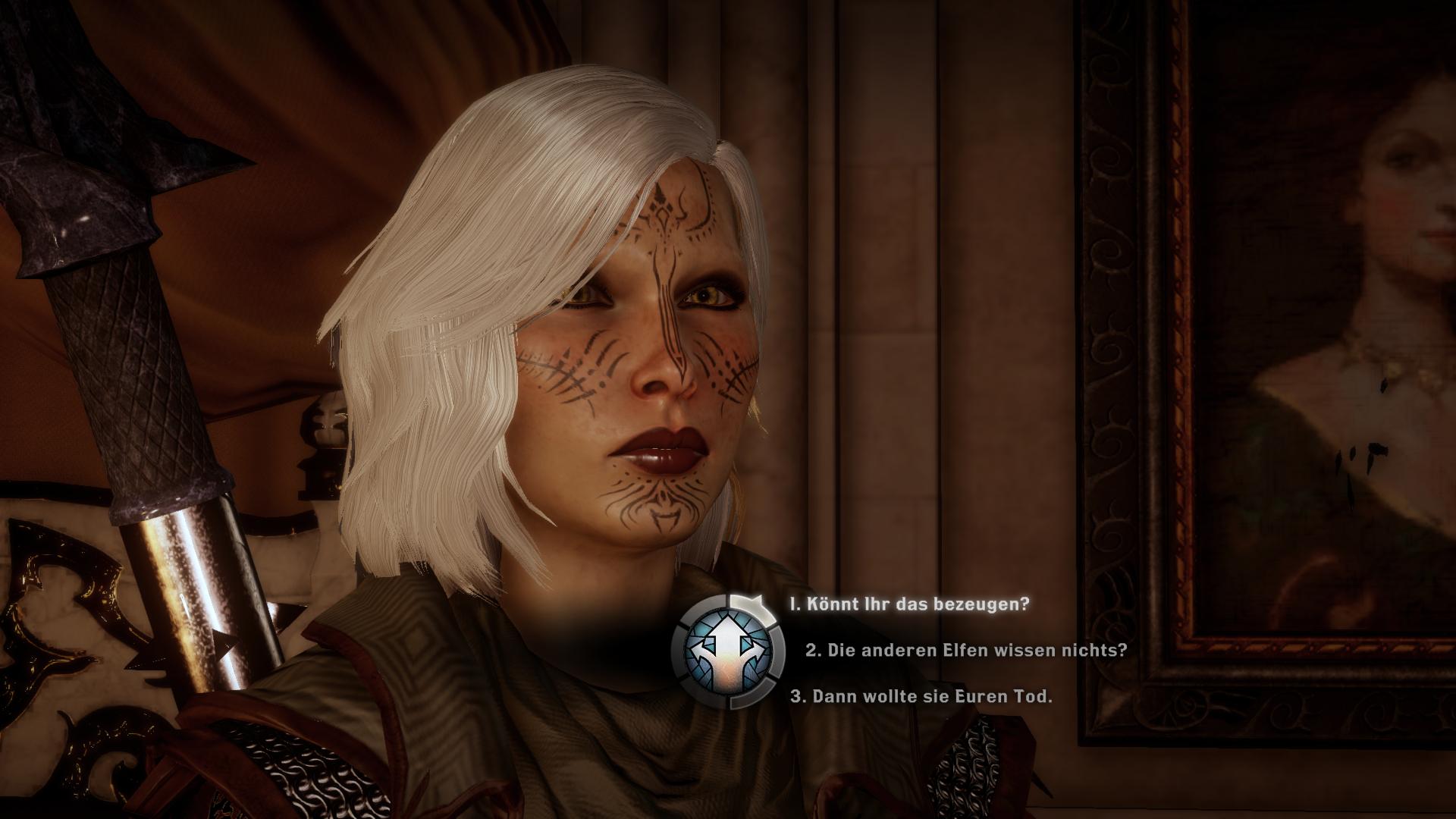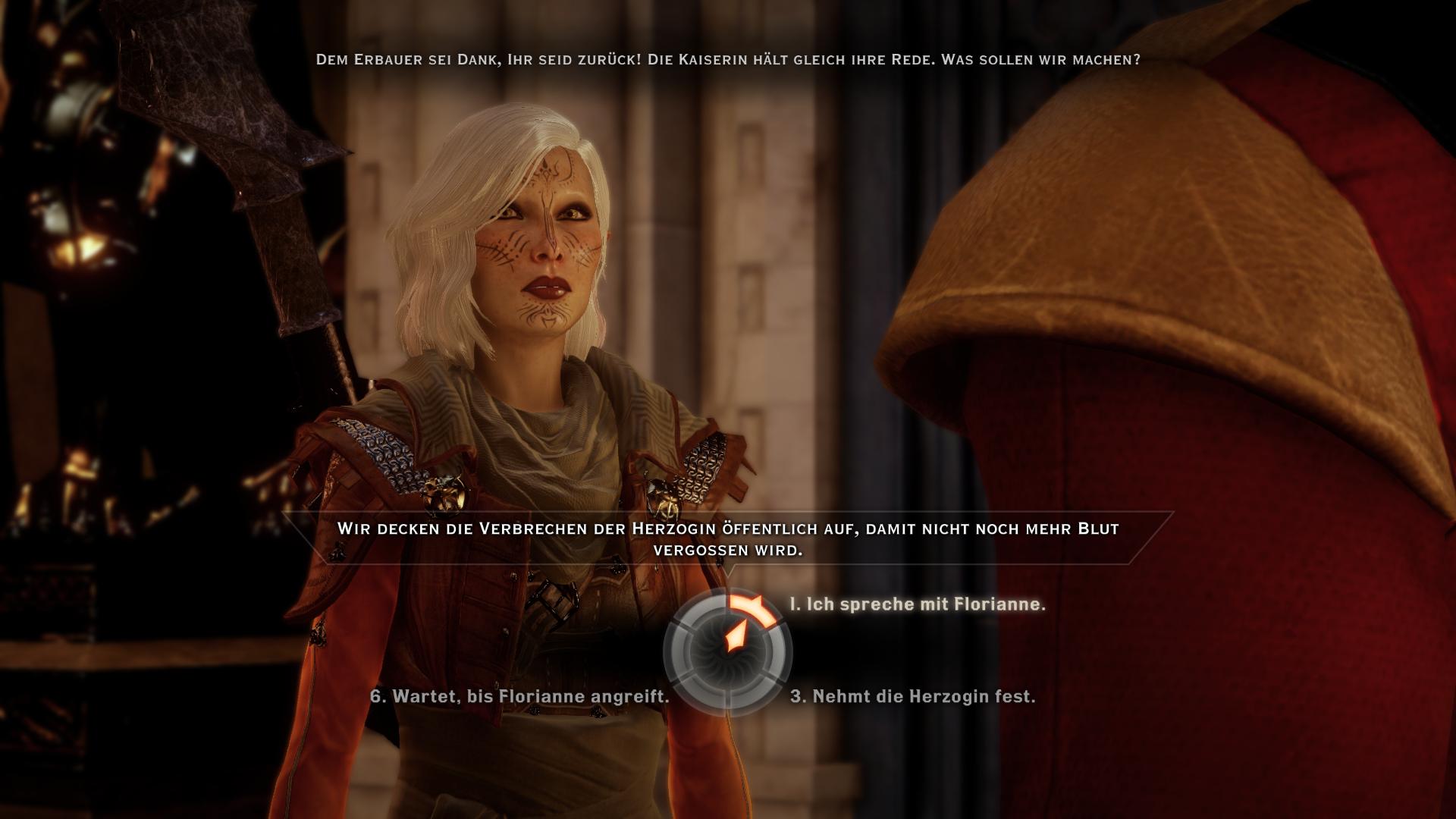 Die wohl beste Antwort. Sie ist jedoch nur verfügbar, wenn ihr 85 Ansehen bei Hofe oder mehr habt. In dem Fall stellt ihr Florianne vor allen Anwesenden bloß und lasst sie danach verhaften. Dadurch folgt kein Endkampf gegen sie und ihr könnt später auf der Himmelsfeste über Floriannes Schicksal entscheiden. Wollt ihr sie z.B. zum Emissär machen, dann müsst ihr diese Antwort wählen. - Nehmt die Herzogin fest