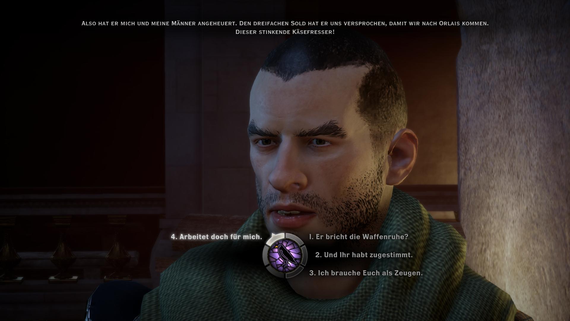 Schreitet ihr letztlich durch die Tür [21] in den Hof des königlichen Flügels, tappt ihr direkt in Floriannes Falle. Womit dann auch geklärt wäre, wer Corypheus Handlanger am Hofe ist. Florianne selbst verdrückt sich nach einem kleinen Plausch und lässt euch mit ihren Bogenschützen sowie einem Riss ins Nichts zurück. Habt ihr alle Bogenschützen sowie Dämonen vernichtet und den Riss geschlossen, befreit ihr automatisch Gespards Söldnerhauptmann. Der wurde scheinbar zur Opferung hier angebunden und ist dank der Rettung sehr gesprächig. Er sagt mit Freude gegen Gespard aus. Ferner könnt ihr ihn als Emissär anwerben, wenn ihr den "Kenntnis der Unterwelt" Inquisitionsbonus besitzt.