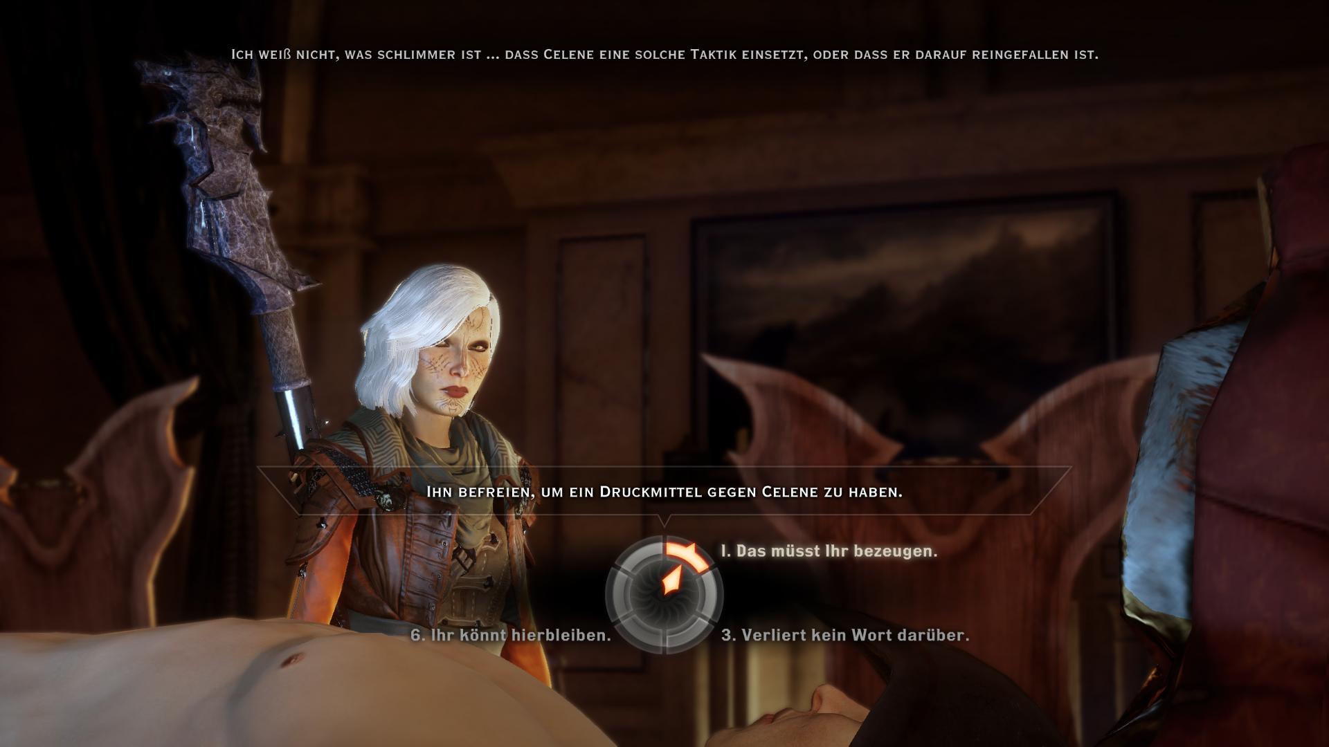 Kommandant Cullen empfängt euch im Ballsaal, weist euch auf die bevorstehende Rede der Kaiserin hin und will wissen, wie ihr verfahren wollt. Ihr habt an diesem Punkt bis zu drei Auswahlmöglichkeiten: