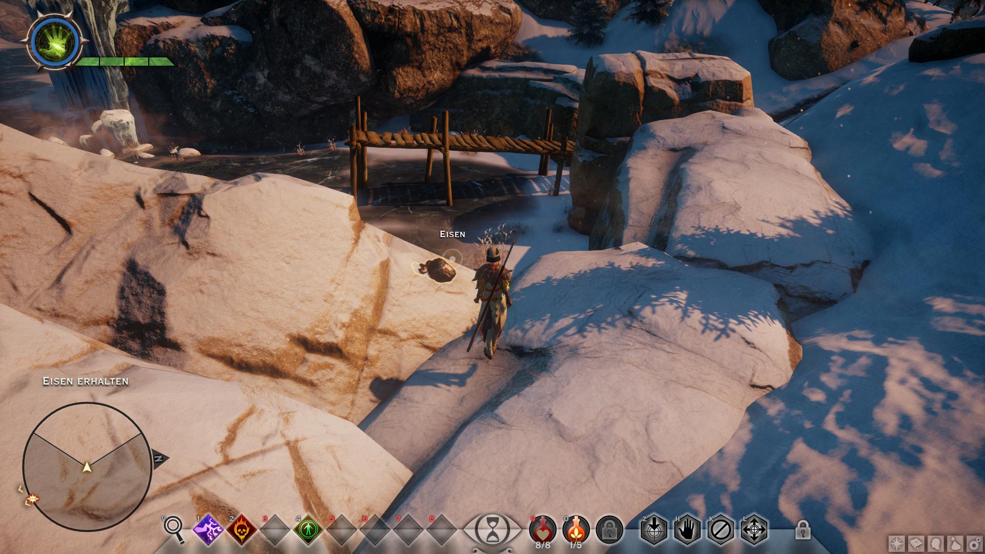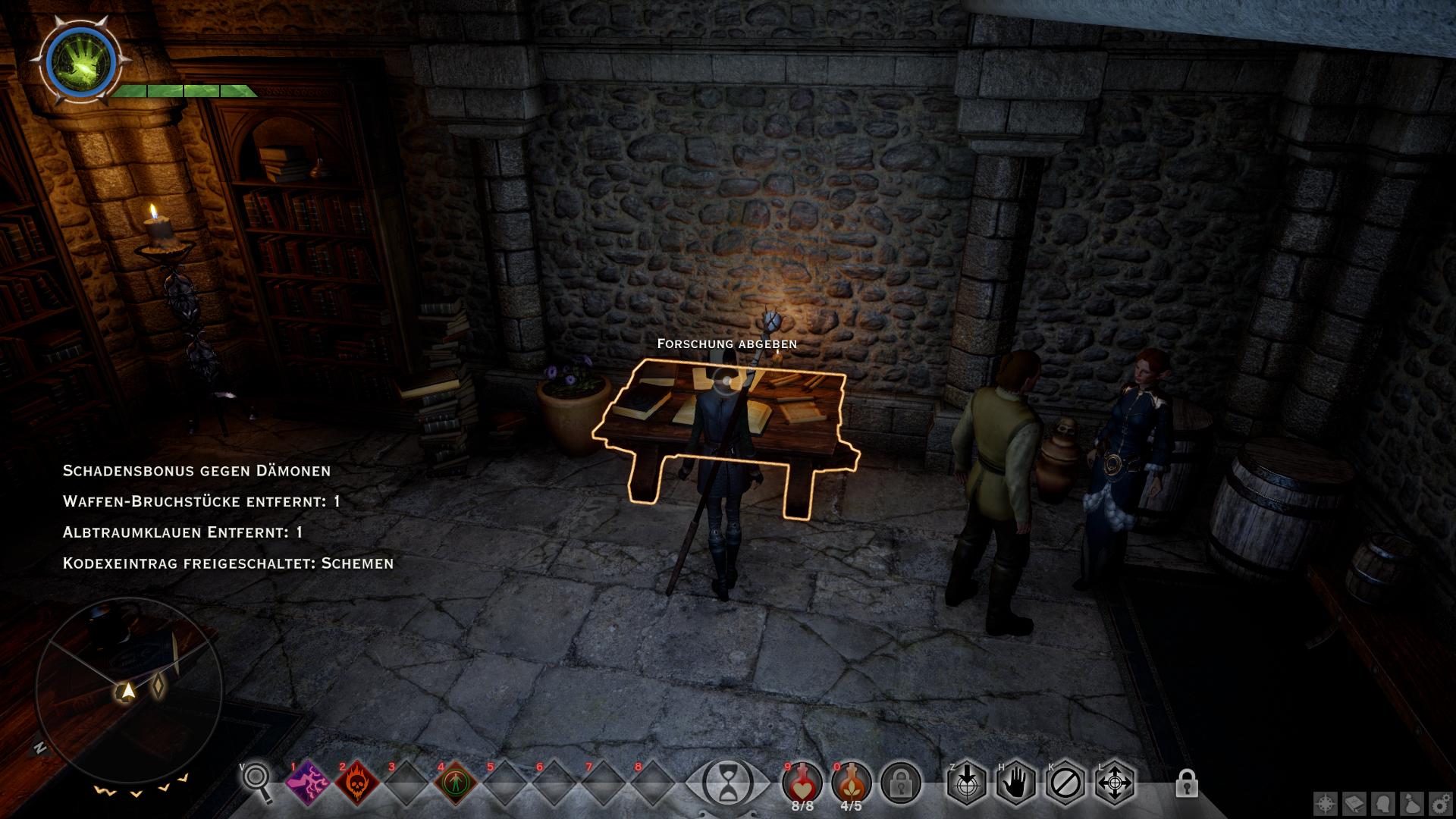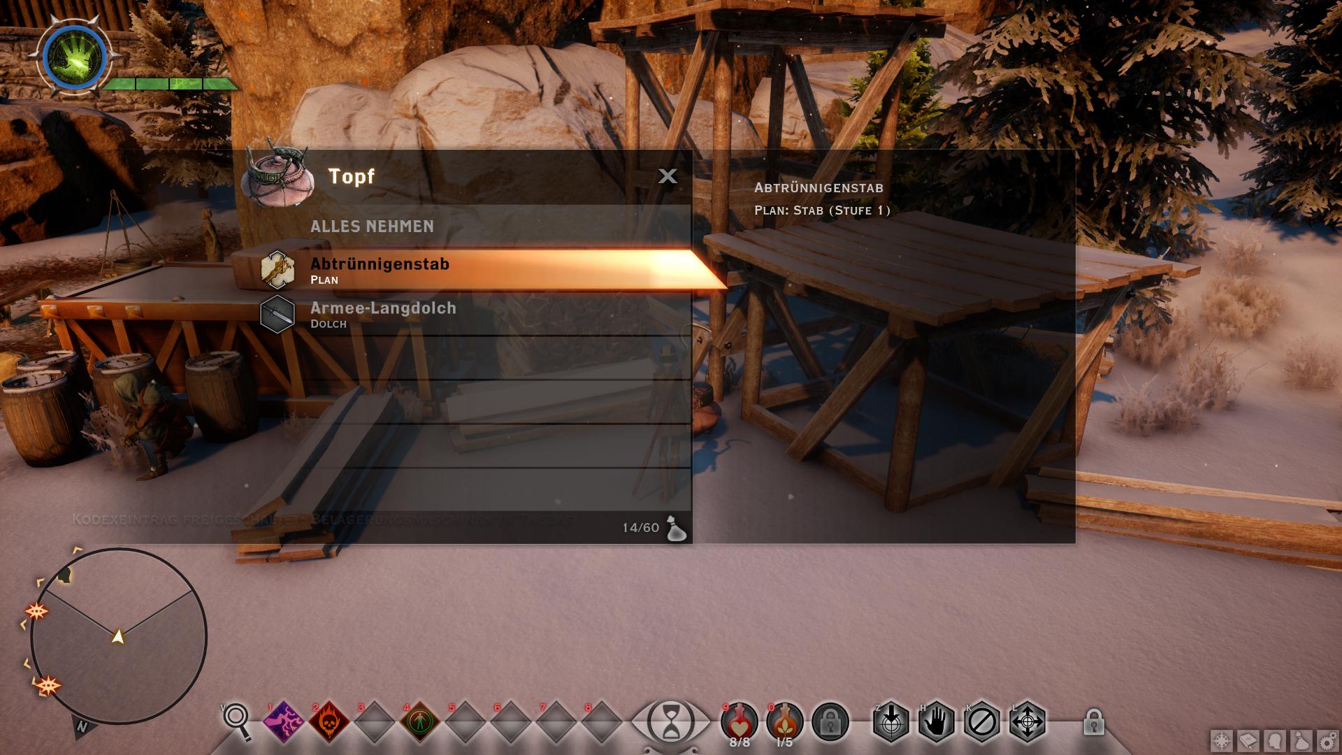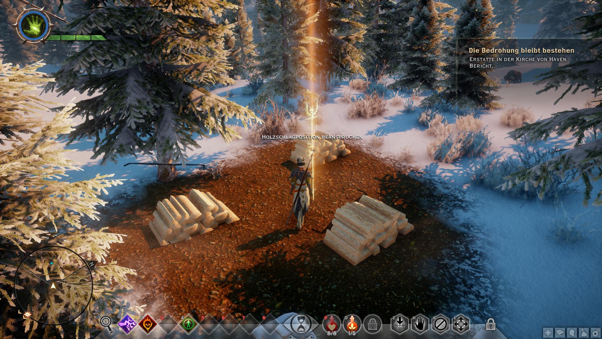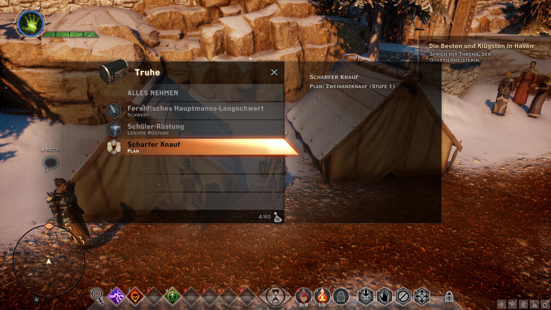 Im Gespräch mit Adan konntet ihr u.a. "Braucht ihr Hilfe?" fragen. Dadurch ist eine weitere Quest gestartet, die ihr nun zusammen mit dem Requirierungsauftrag erledigen könnt. Verlasst Haven durch das Tor und lauft zu der Hütte [8] außerhalb im Wald. Dort wird sich ein weiteres Feature von Dragon Age Inquisition bemerkbar machen: Das Suche-System. Auf dem Weg könnt ihr übrigens kurz in der Taverne einkehren und ein Lied erhaschen (Nebenaufgabe). Aber zurück zum Suchen-System: Wann immer ihr in der Nähe eines versteckten Questobjektes seid, beginnt euer Kompass zu blinken. Dann könnt ihr den Suchen-Button (V) drücken, um euch die ungefähre Richtung anzeigen zu lassen. Nutzt diese Funktionsweise um die letzte Notiz von Taigen auf dem Schreibtisch der Hütte aufzudecken. Die könnt ihr später zu Adan zurückbringen.