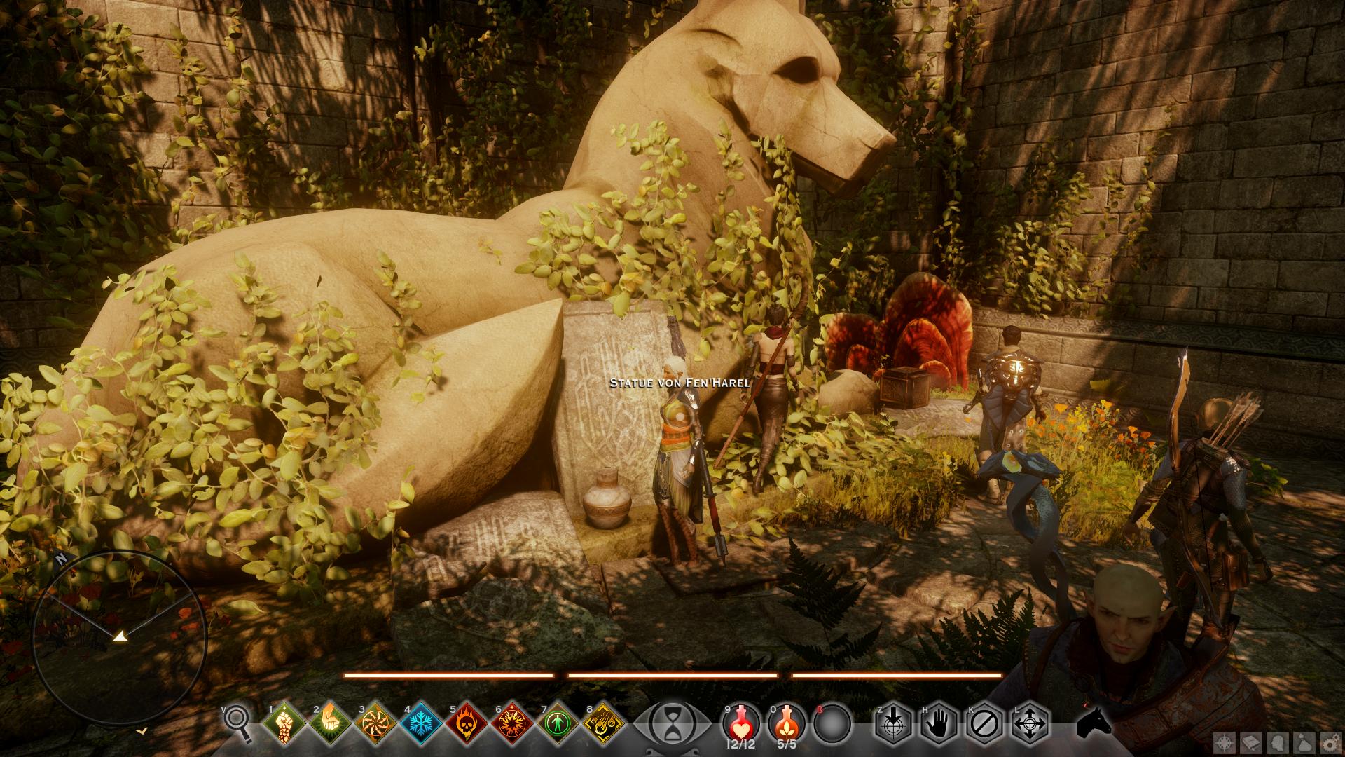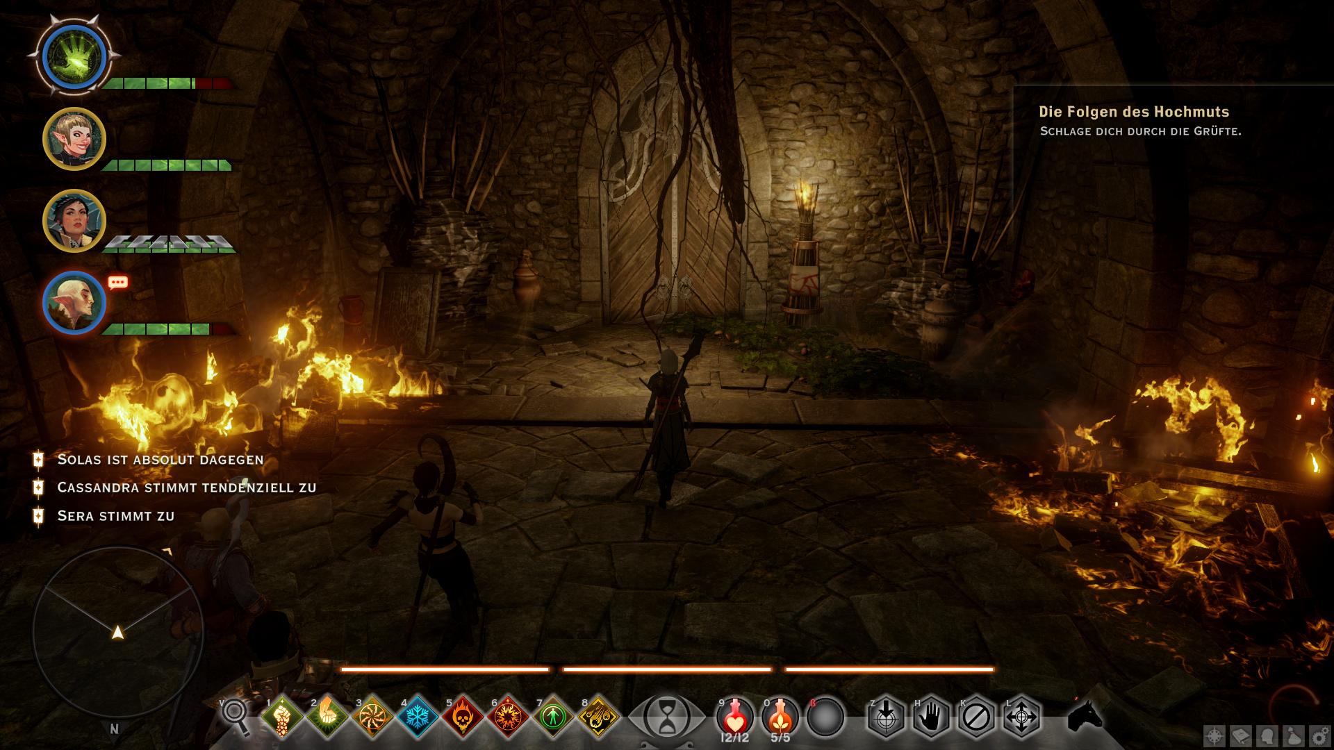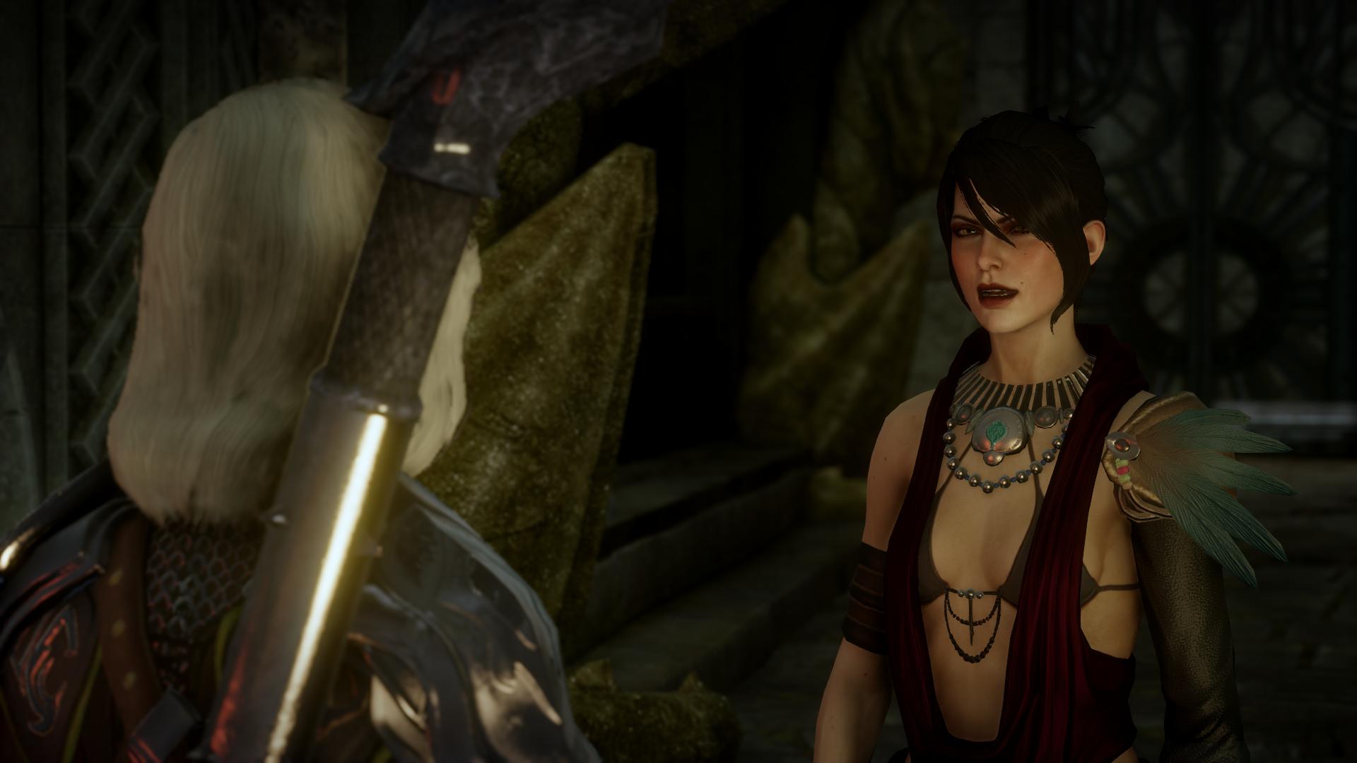 Corypheus und sein Drache sind vorerst ausgesperrt, aber ein Teil der Roten Templer befindet sich bereits im Mythal Tempel und ihr müsst vor ihnen im Inneren sein. Auch wenn sich das Ziel offenbar geändert hat. Denn wie sich in der anfänglichen Diskussion herauskristallisiert, lag Morrigan falsch und Corypheus ist hinter etwas mit dem Titel "Quelle der Trauer" her.