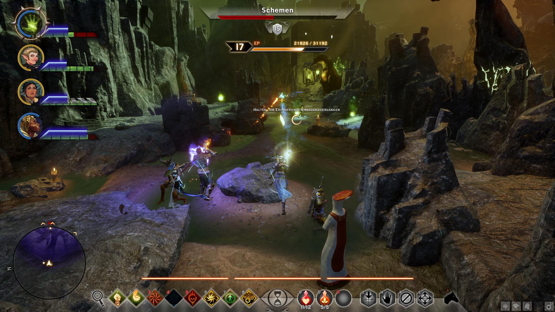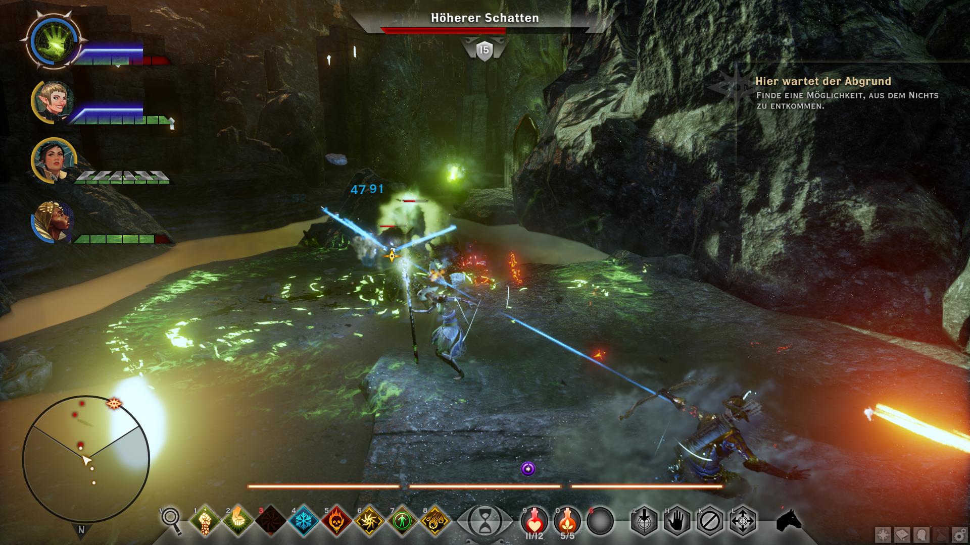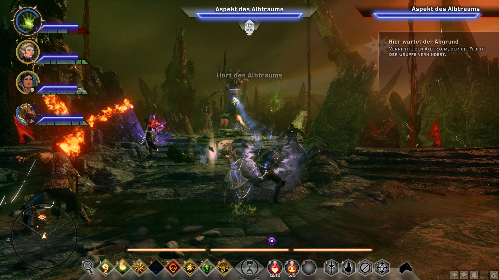 Als ihr das spinnenähnliche Etwas [14] erreicht, opfert sich Justinia erneut, um es zurückzuschlagen. Ihr müsst jedoch gegen den Aspekt des Albtraums antreten. Er ist resistent gegen Geistangriffe, nimmt aber ansonsten durch alles gut Schaden. Ab und zu ruft er kleine Spinnen herbei und verschwindet kurzzeitig. Wenn ihr einen Moment erwischt, in dem er und die Spinnen da sind, dann nutzt eine eurer offensiven Fokus-Fähigkeiten, um möglichst viel Schaden anzurichten. Der Aspekt des Albtraums wird zwar für euch unsichtbar, aber, dank dem Questziel auf eurem Radar, könnt ihr ihn trotzdem immer sehen. Er schützt sich ferner immer wieder mit einer magischen Barriere. Diese lässt sich bannen, nutzt das aus! Erreicht die Gesundheit des Aspekts des Albtraums 25%, so beschwört er zusätzlich zu den Spinnen noch Dämonen der Angst. Spätestens dann ist der ideale Zeitpunkt für Mal des Risses oder andere Fokus-Fähigkeiten.