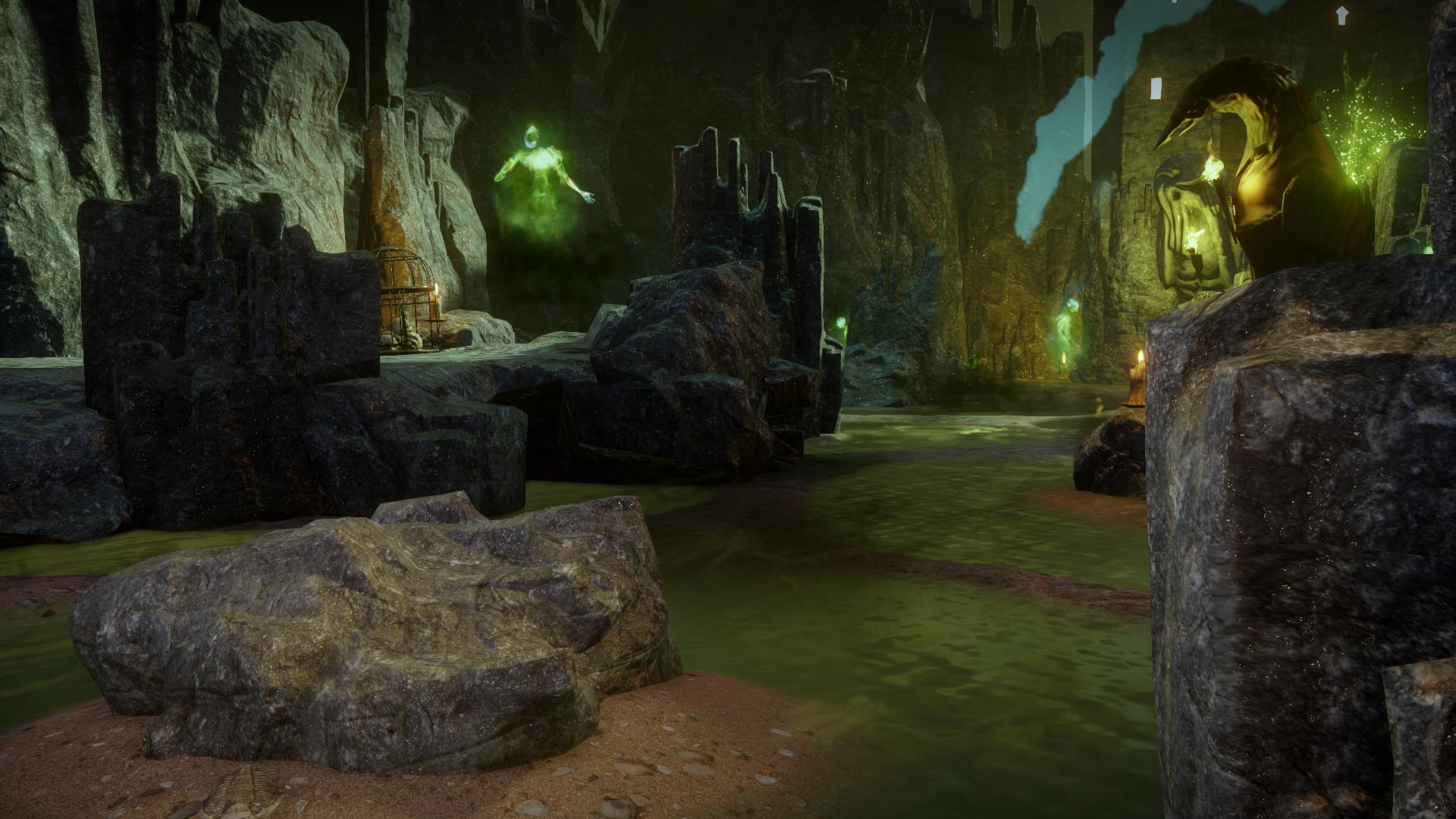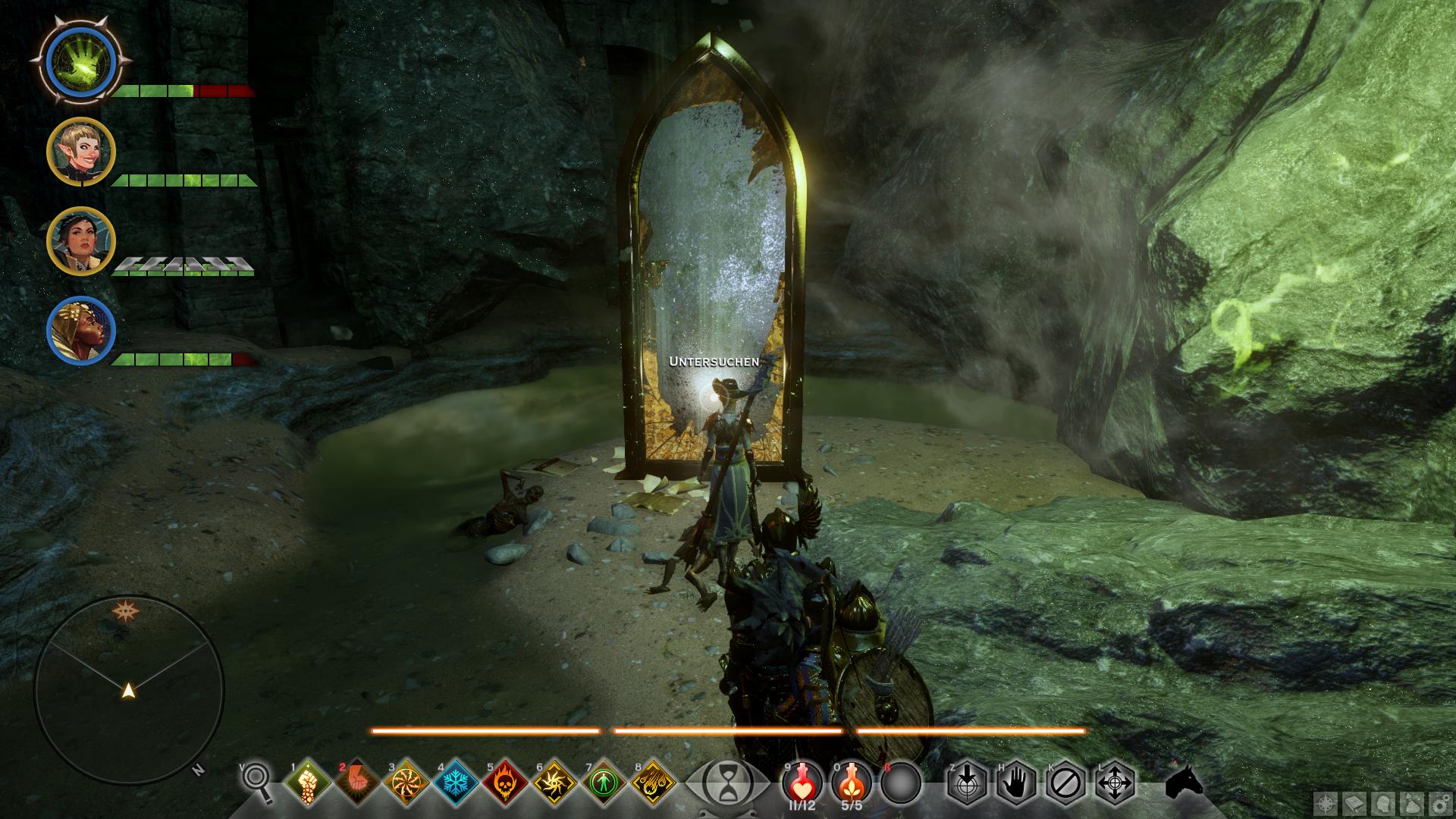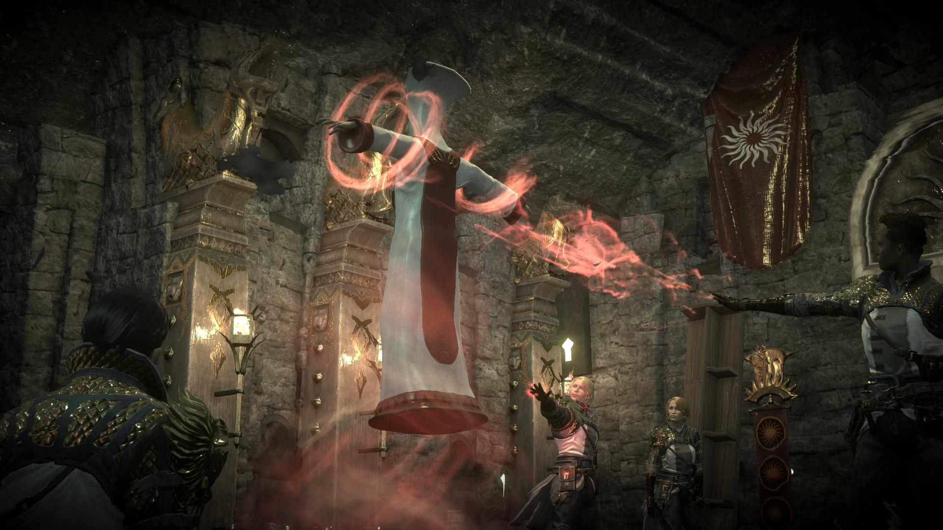 Oben auf der Treppe findet ihr ein Vorratslager und außerdem erwartet euch dort die Göttliche Justinia, oder zumindest ein Geist der so aussieht. Habt ihr Cassandra in der Gruppe, könnt ihr sie nach ihrer Meinung fragen, ob es wirklich Justinia ist. Eine definitive Antwort bekommt ihr darauf jedoch nicht. Justinia erzählt euch, dass ihr euch jetzt in dem Teil des Nichts befindet, welcher dem Dämon gehört, der Corypheus dient. Sie verweist euch zudem auf die Schemen hinter ihr. Tötet sie und ihr erhaltet einen Teil eurer Erinnerungen an die Ereignisse eures ersten Nichts-Aufenthaltes zurück. Sobald ihr alle vier aufgenommen habt, seht ihr eine Sequenz, in der Corypheus Justinia Magie absaugt, um seine Elfenkugel aufzuladen. Welche dann versehentlich euch in die Hände fällt und das Mal verursacht.