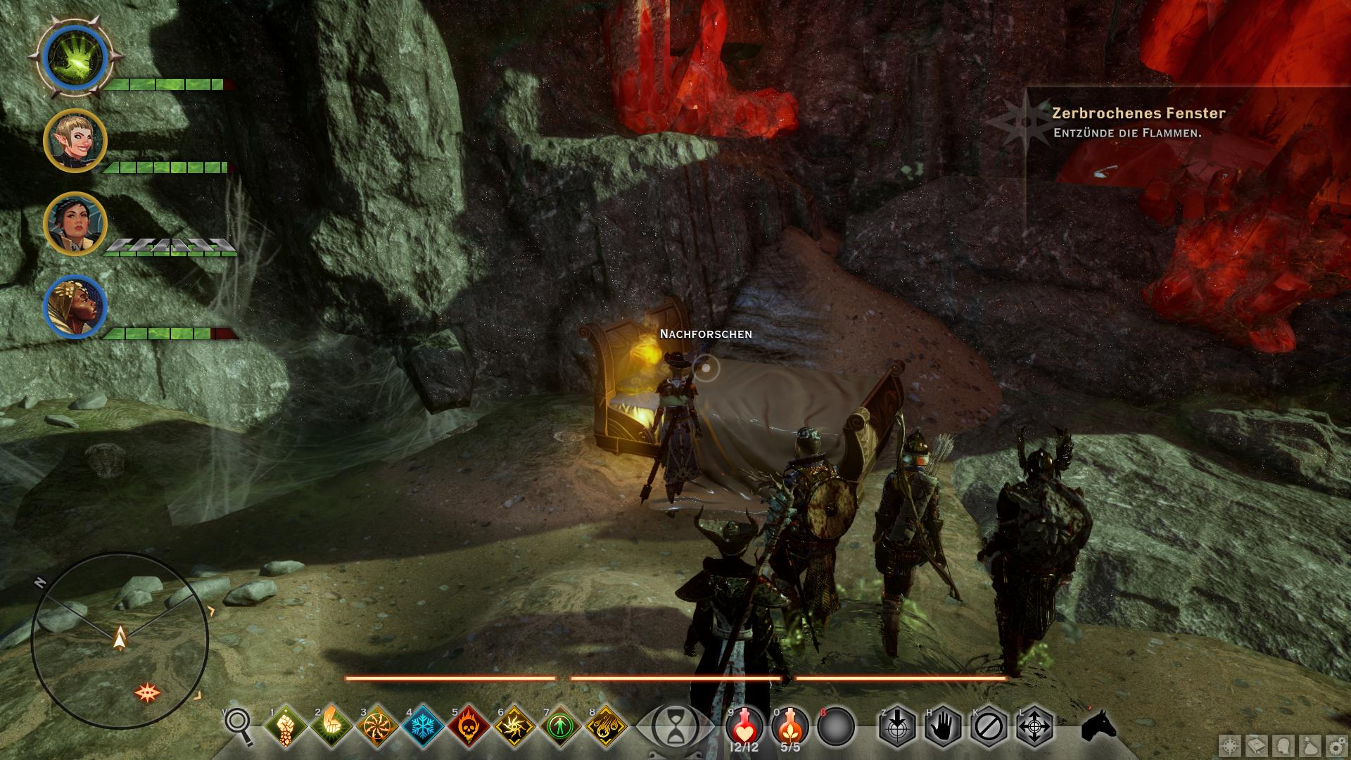 An der nächsten Abzweigung müsst ihr sowohl den unteren als auch oberen Weg erkunden. Oben findet ihr als erstes ein Stofftier, das ihr gleich daneben [11] ins Bett legen solltet. Das gibt euch durch die Quest noch mal Willenskraft +1. Gegenüber vom Bett steht eine Konsole mit fünf Knöpfen, welche die "Zerbrochenes Fenster" Quest startet. Drückt die Tasten in der Reihenfolge 4, 1, 3, 5, 2 und gelangt so in den Besitz eine Amuletts der Macht für euren Hauptcharakter und weitere Beute.