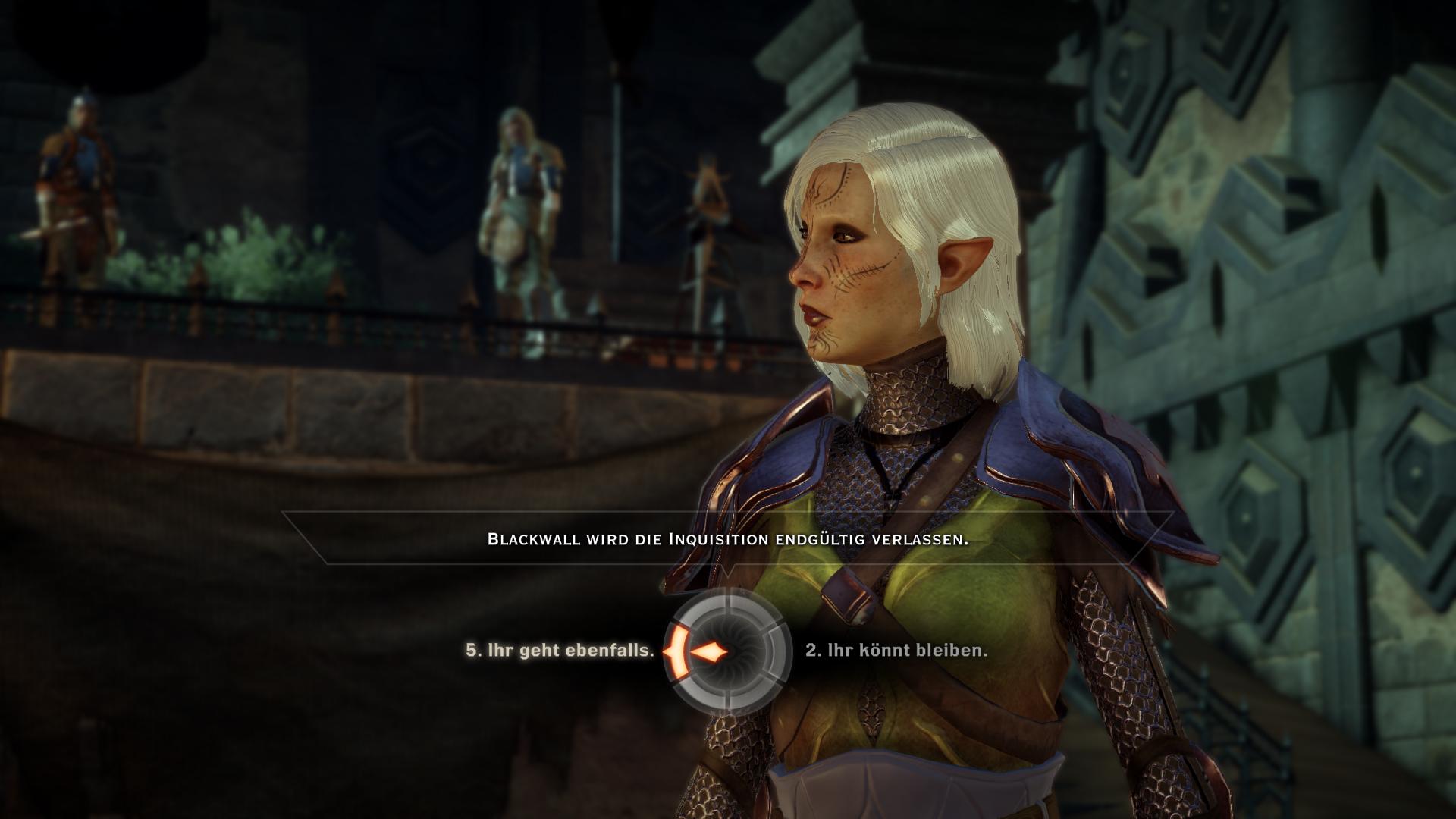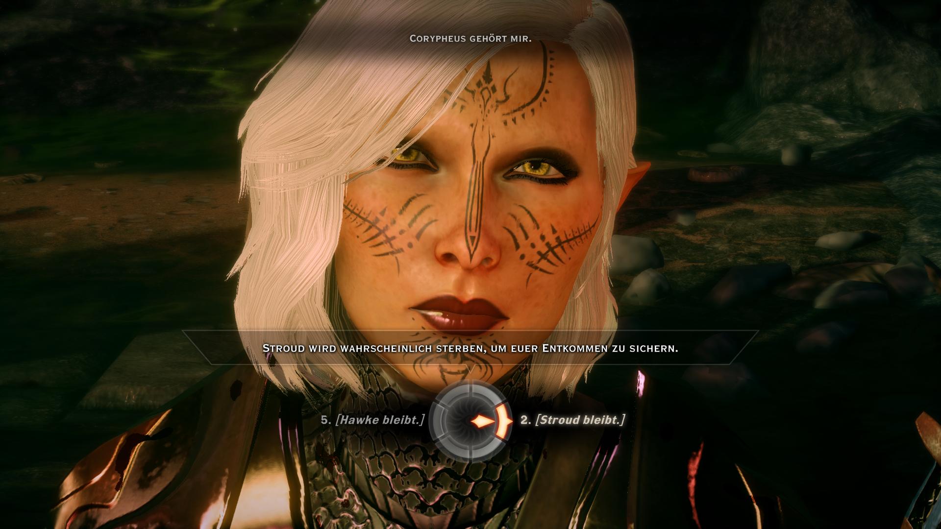 Mit dem Tod des Aspekts kommt der andere Dämon zurück und versperrt euch den Weg. Die zuvor streitenden Begleiter Hawke und Strout, wetteifern nun darum sich opfern zu dürfen. Ihr könnt entscheiden, wer von beiden im Nichts zurückbleiben soll. Entgegen der anderen Entscheidungen des Spiels, hat diese keinen Einfluss auf das Vertrauen eurer Begleiter. Ihr könnt also frei entscheiden.