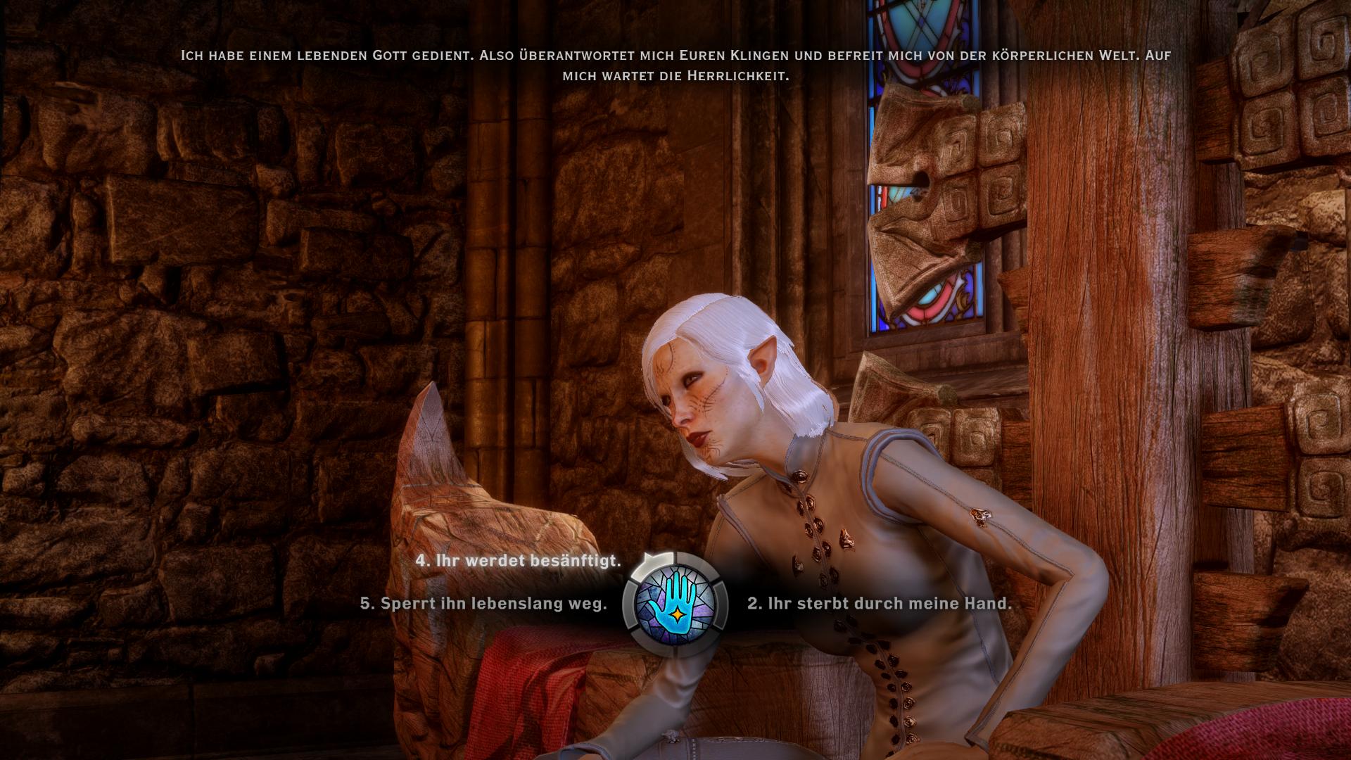 - Magister Erimond könnt ihr selbst den Kopf abschlagen, lebenslang einsperren oder besänftigen lassen. Letzteres schaltet den "Urteil: Wie konntet ihr" Einsatz frei, der euch etwas Einfluss bringt.