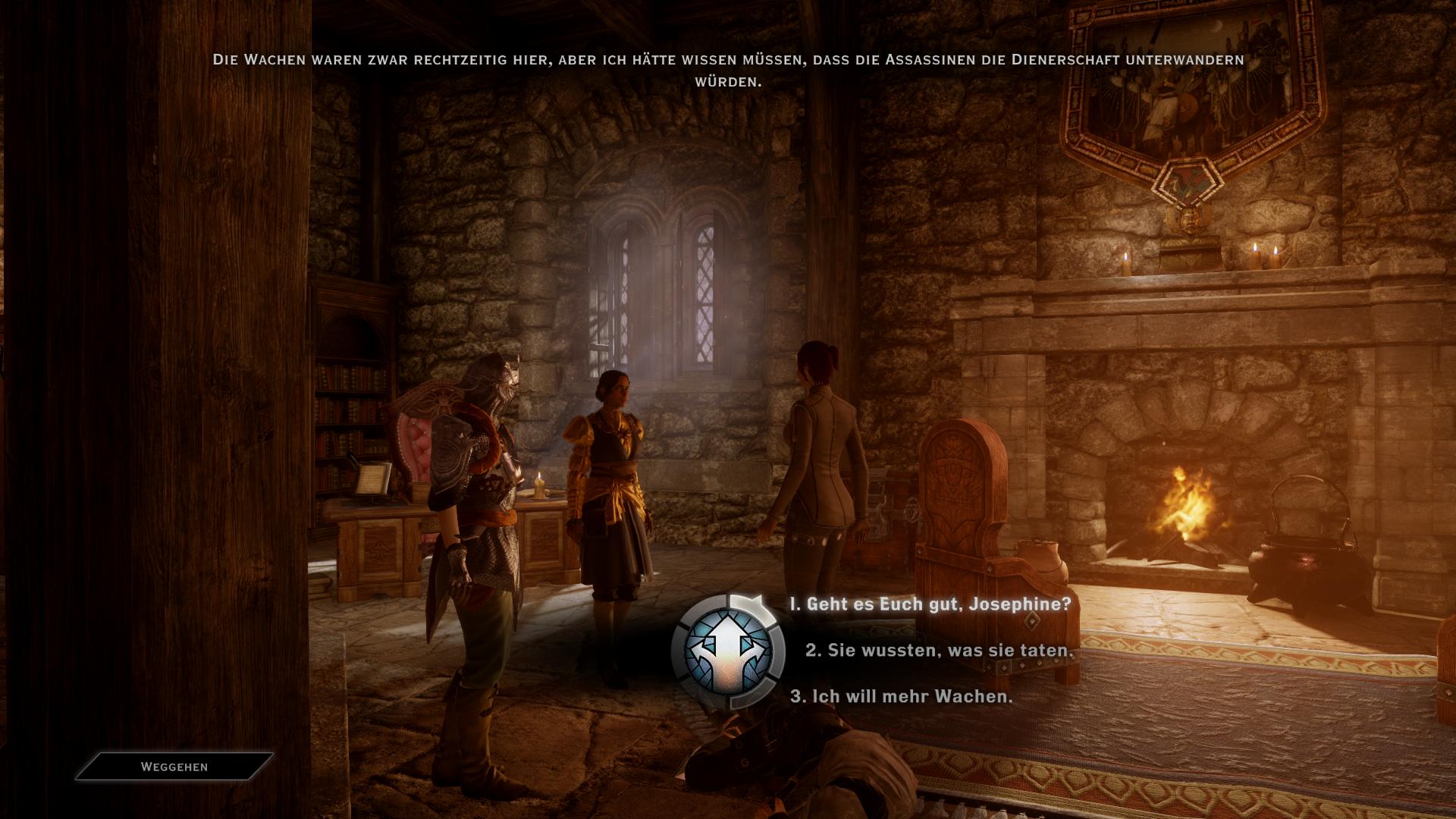 Josephine hat bereits einen Nachfahren der Du Paraquettes ausfindig gemacht, der bereit ist, euch zu helfen. Der muss aber zunächst in den Adelsstand gehoben werden, was drei Schritte erfordert. Als Josephine euch das eröffnet kommt Leliana herein und bietet eine Alternativ-Lösung an, indem sie ihre Agenten ins Haus der Ruhe schicken will und den Vertrag dort vernichtet. Der 20-Minütige Auftrag "Zerstörung des Auftrags des Hauses der Ruhe" steht euch daraufhin am Kartentisch zur Verfügung.