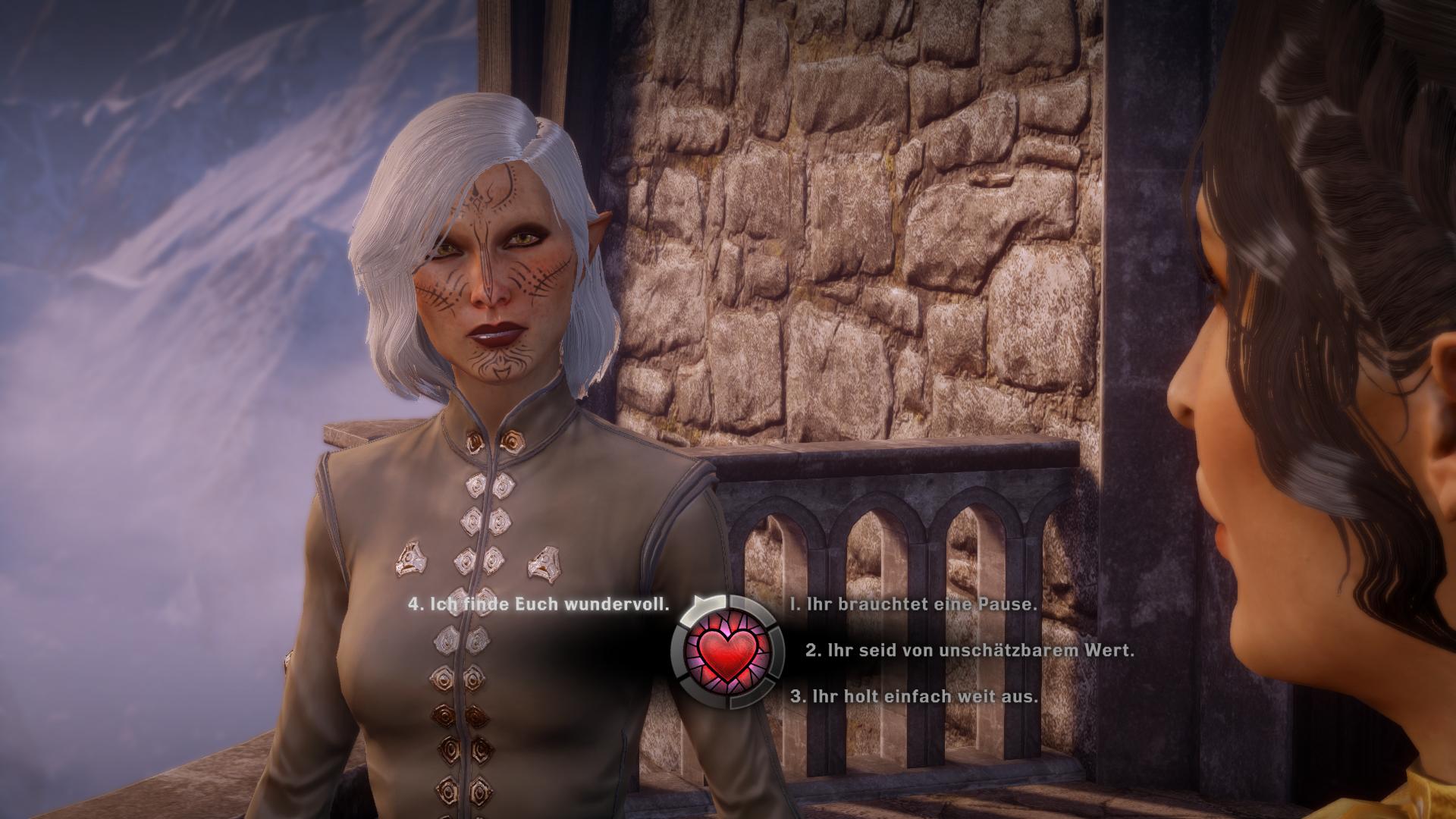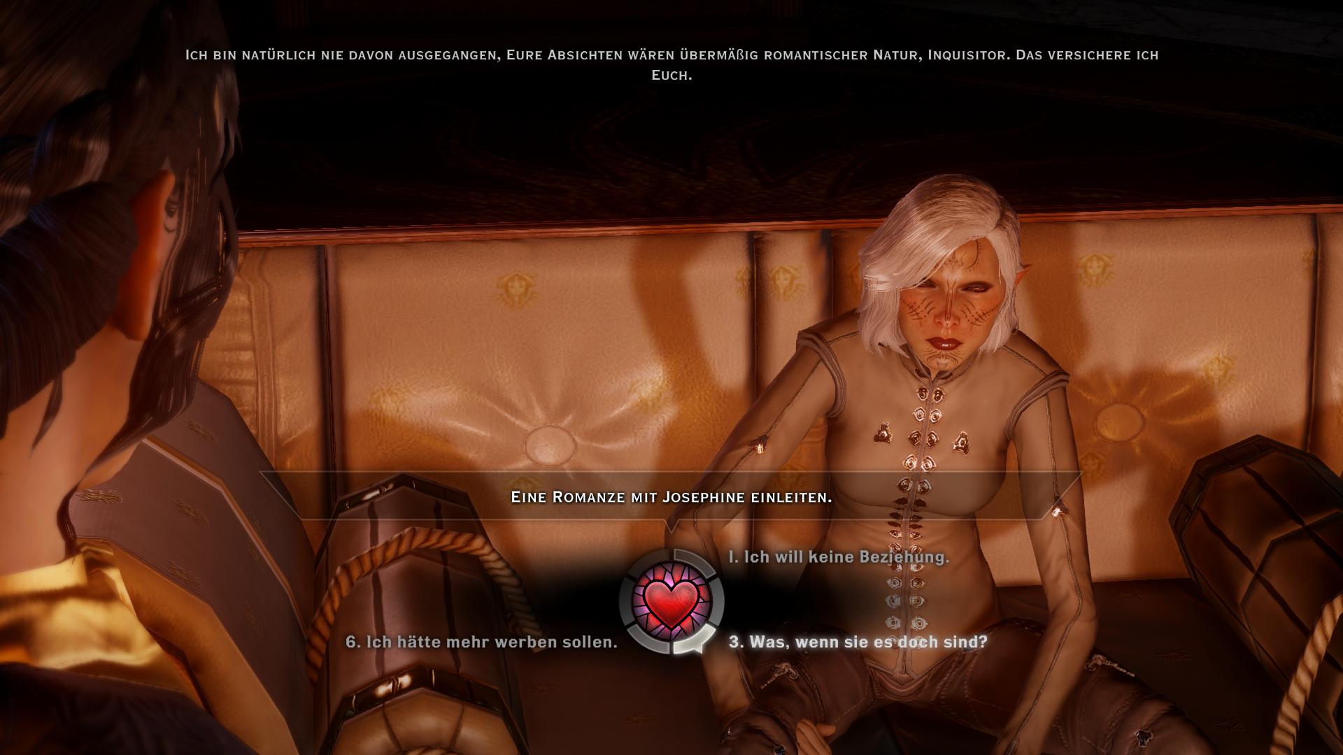 Redet in der Himmelsfeste erneut mit Josi und trefft sie dann zum Abschluss der Quest an den Docks von Val Royeaux. Sie erzählt euch dort von ihrem früheren Leben als Bardin. Was offenbar Spione im Adel sind. Ihren Dank am Ende der Geschichte könnt ihr dazu nutzen, Josephine ein Kompliment zu machen.