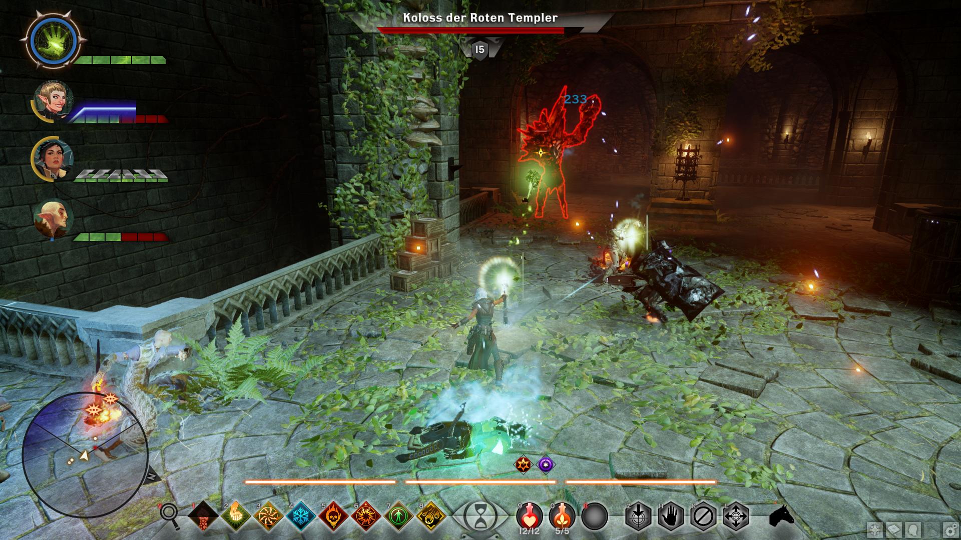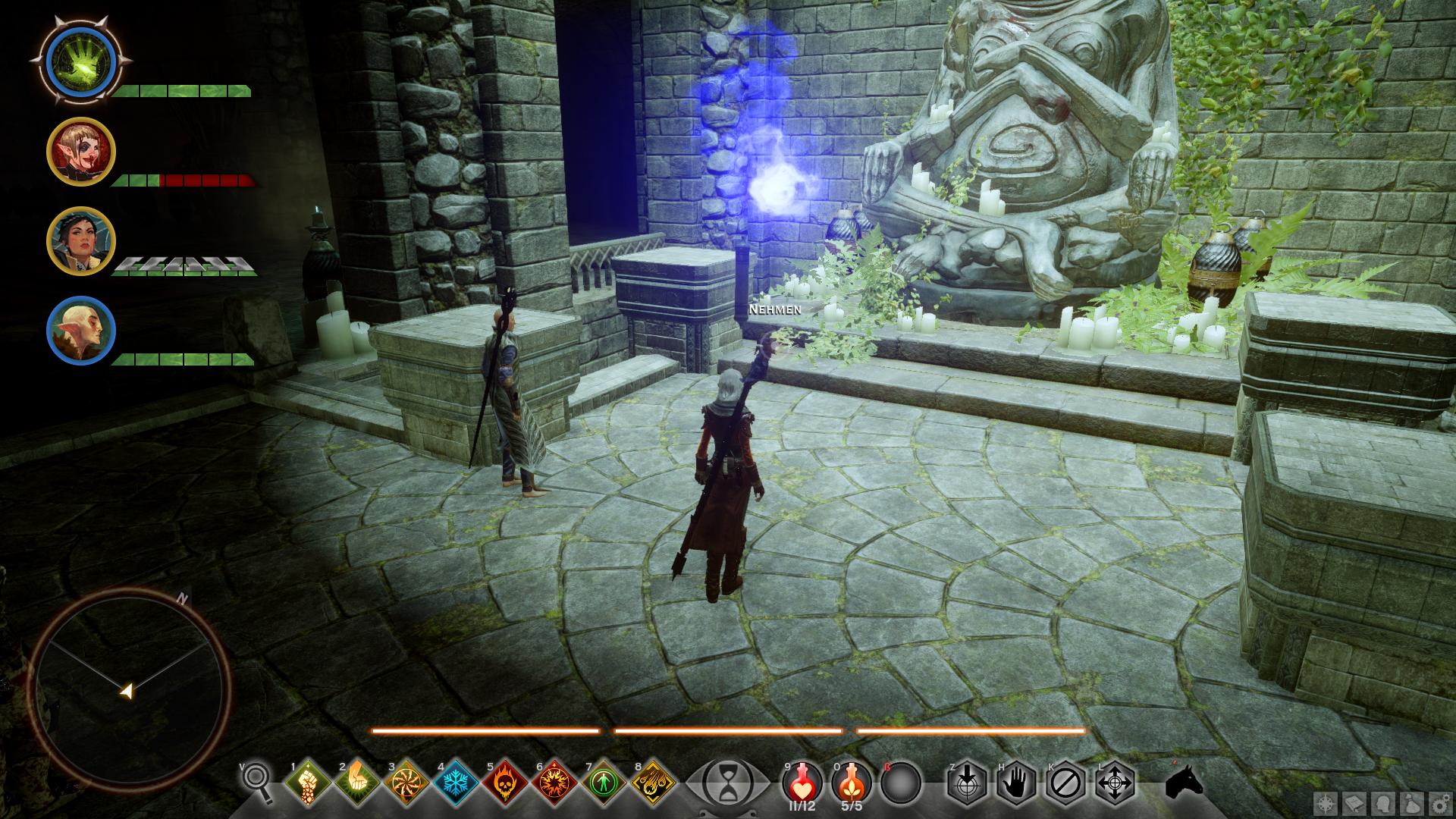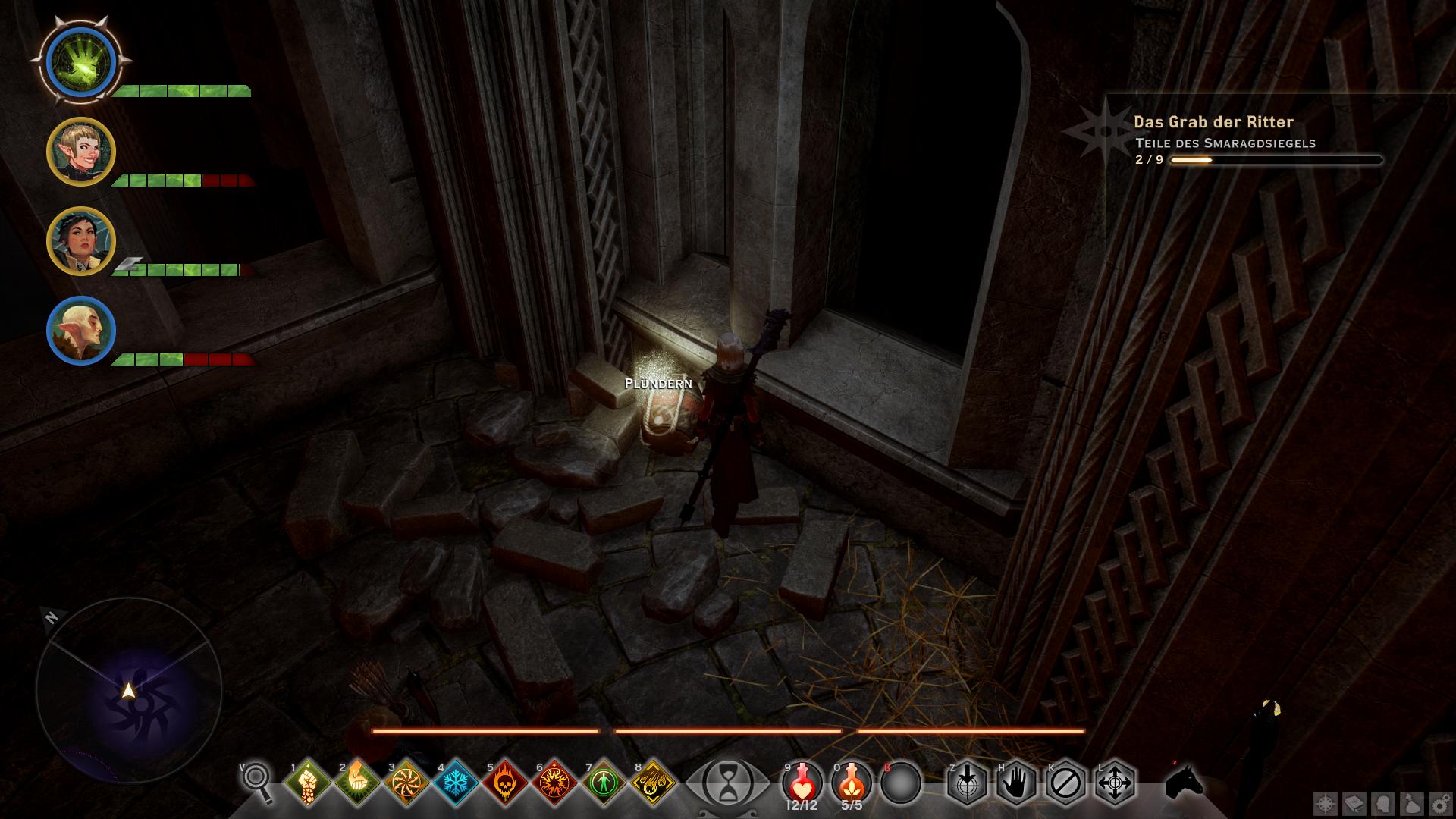 Beim Betreten von Din'an Hanin findet ihr keinerlei Anzeichen auf den Verbleib von Tavin oder den anderen Elfen. Nach wenigen Schritten entdeckt ihr jedoch den Leichnam eines Inquisitionssoldaten. Womit klar wäre, dass in der Ruine etwas nicht stimmt. Eine Abzweigung später greifen euch die ersten Roten Templer an, die fortan überall in der alten Elfenruine lauern. Geht ihr die rechte Treppe nach dem ersten großen Ruinengang hinunter, lauft ihr direkt auf einen Koloss der Roten Templer [1] zu. Sobald ihr den bezwungen habt, könnt ihr aus seinen Überresten das erste Smaragdsiegel bergen, wodurch diese Quest beginnt. Nun müsst ihr acht weitere finden, um Einlass zur Gruft von Din'an Hanin zu erlangen. Die Smaragdsiegel liegen entweder in Geröllhaufen oder werden von den anderen Kolossen der Ruinen herumgetragen.
