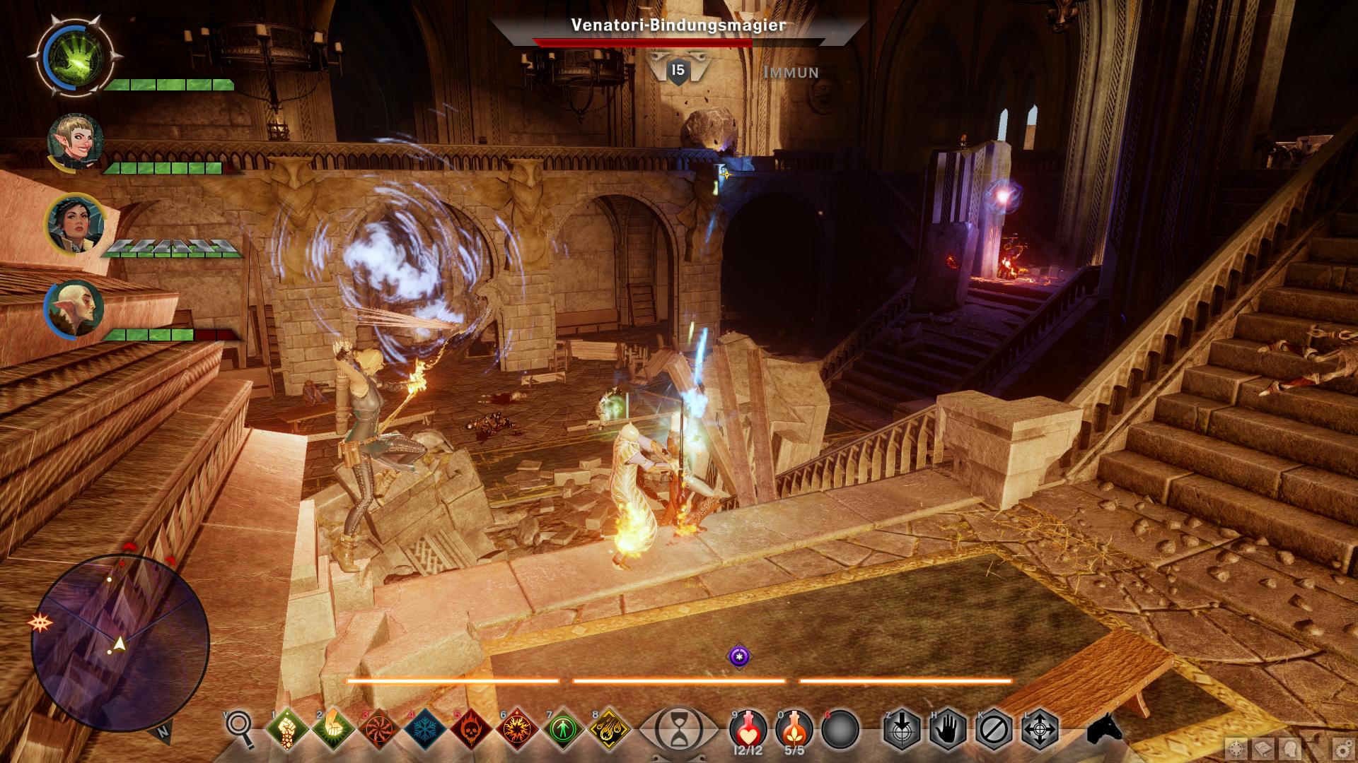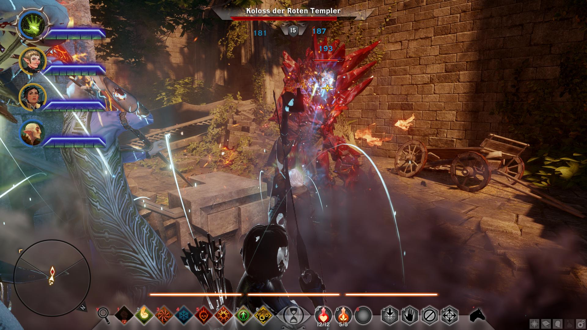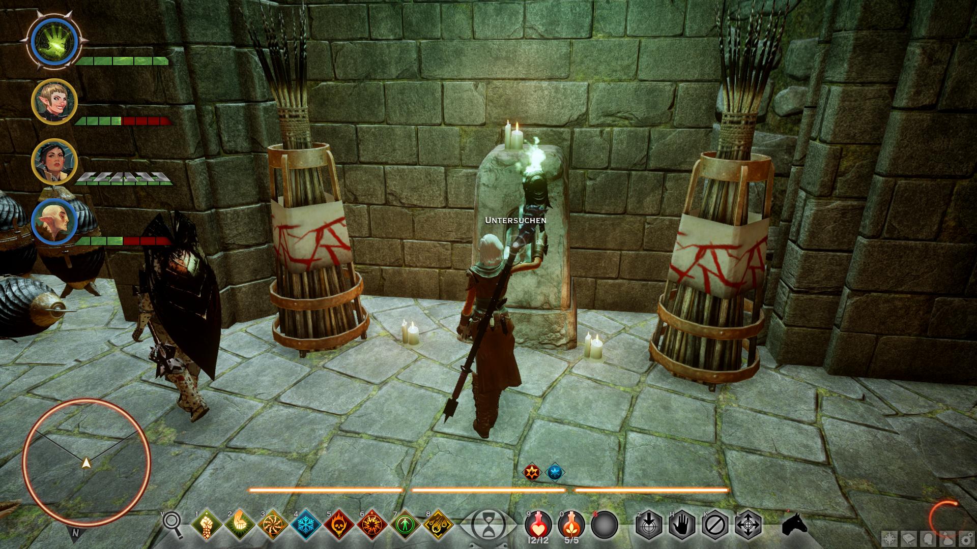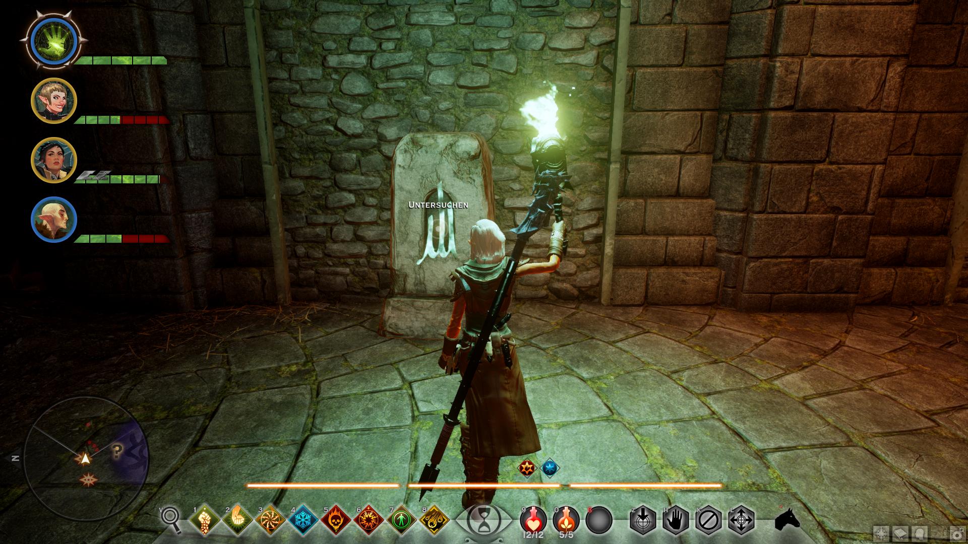 Beim Betreten von Din'an Hanin findet ihr keinerlei Anzeichen auf den Verbleib von Tavin oder den anderen Elfen. Nach wenigen Schritten entdeckt ihr jedoch den Leichnam eines Inquisitionssoldaten. Womit klar wäre, dass in der Ruine etwas nicht stimmt. Eine Abzweigung später greifen euch die ersten Roten Templer an, die fortan überall in der alten Elfenruine lauern. Geht ihr die rechte Treppe nach dem ersten großen Ruinengang hinunter, lauft ihr direkt auf einen Koloss der Roten Templer [1] zu. Sobald ihr den bezwungen habt, könnt ihr aus seinen Überresten das erste Smaragdsiegel bergen, wodurch diese Quest beginnt. Nun müsst ihr acht weitere finden, um Einlass zur Gruft von Din'an Hanin zu erlangen. Die Smaragdsiegel liegen entweder in Geröllhaufen oder werden von den anderen Kolossen der Ruinen herumgetragen.