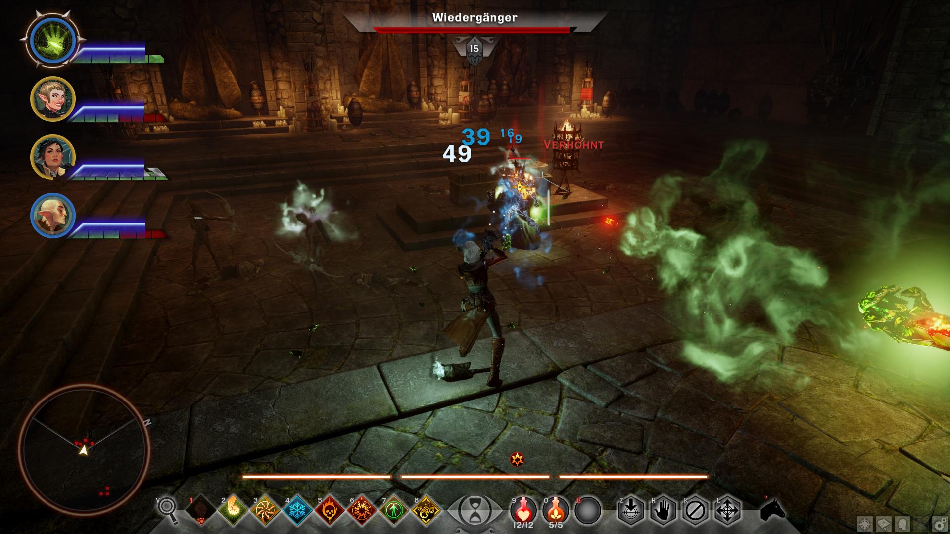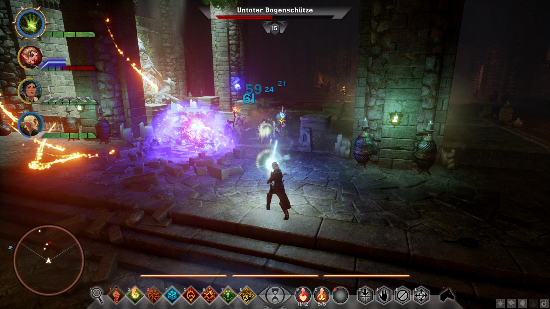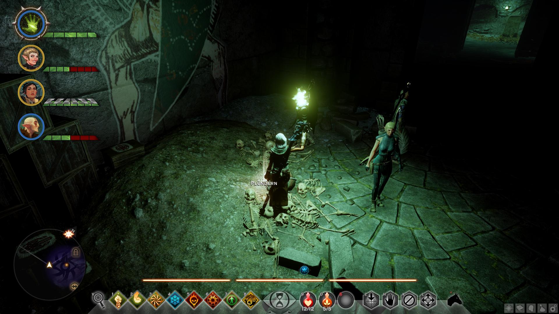 Das letzte Siegel bekommt ihr in den unteren Grüften, welche ihr entweder über die Treppe im Westen der oberen oder die Leitern in der Mitte erreicht. Die Ebene ist etwas unübersichtlich. Ihr müsst als erstes das Smaragdsiegel im Südosten [8] finden und könnt dann die Tür zur Hauptgruft [9] öffnen. Darin ist zentral eine tiefer liegende Plattform [10]. Um diese herum findet ihr Säulen mit Fackelhalterungen dran und im Norden ein Schleierfeuer. Entzündet ihr eine der Fackeln, entstehen um euch herum mehrere Leichname und mit der vierten Säule zusätzlich ein Widergänger. Aus dessen Überresten könnt ihr das Estwacht-Bollwerk plündern und anschließend sollte die Plattform in der Mitte hochgefahren sein. Dadurch könnt ihr nun die Analen [10] aufnehmen und anschließend an die Kirche oder die Dalish aushändigen.