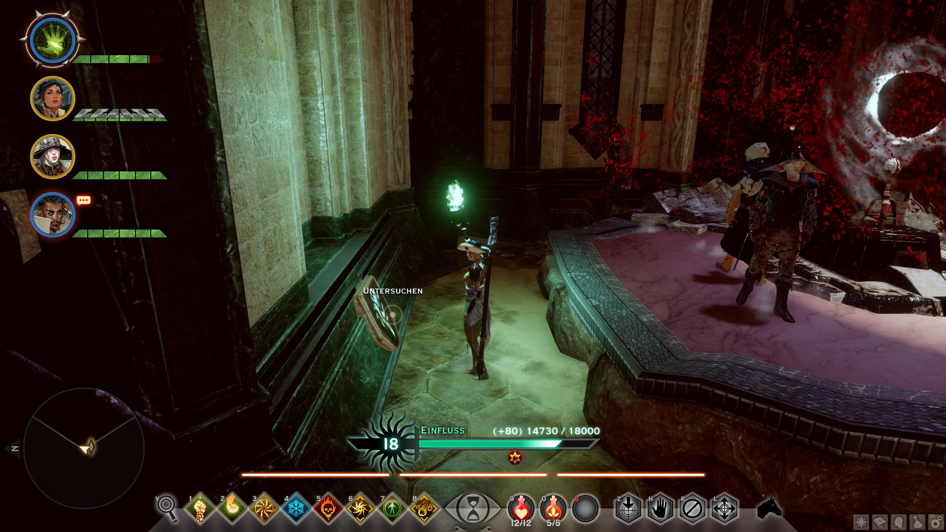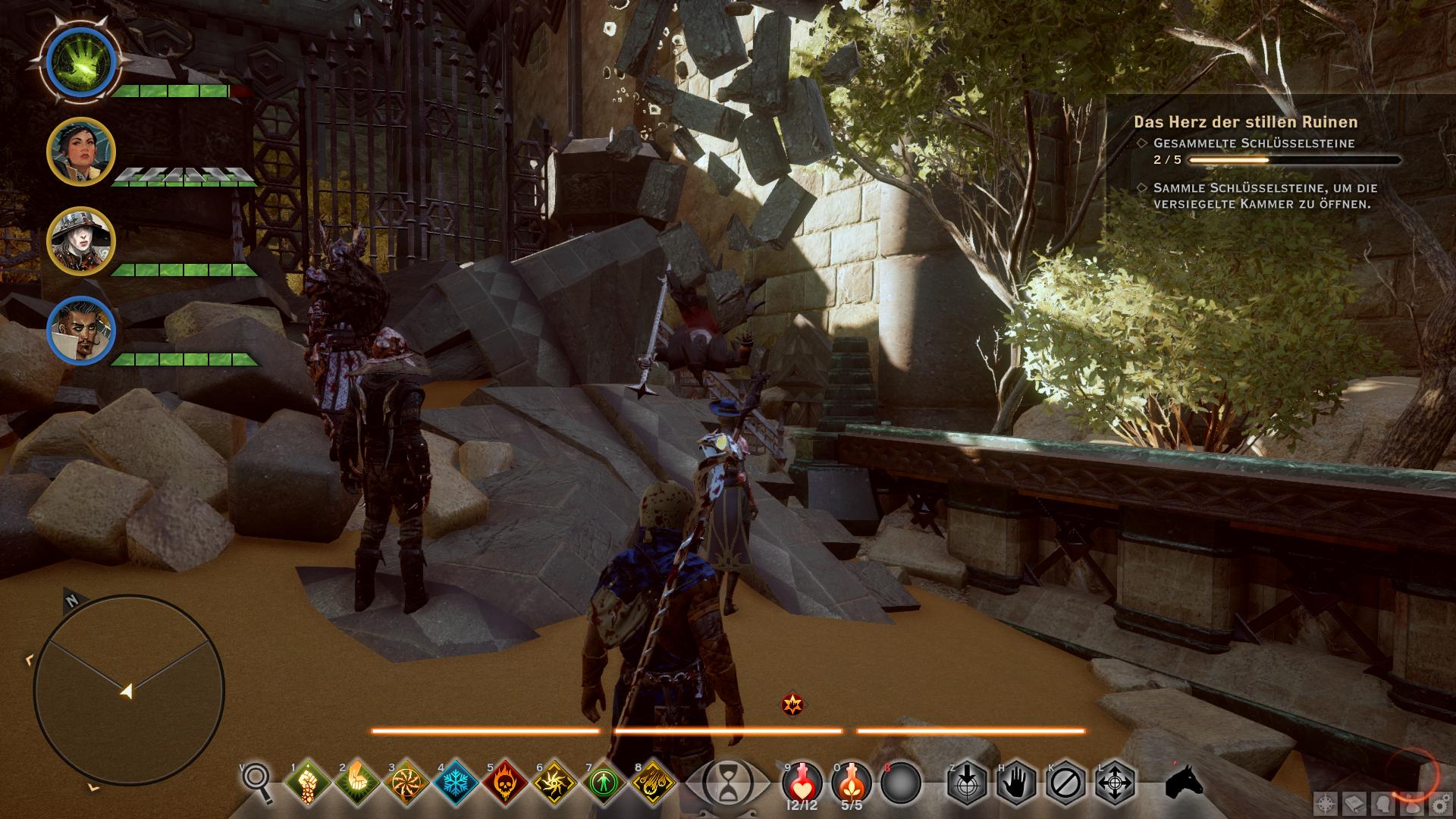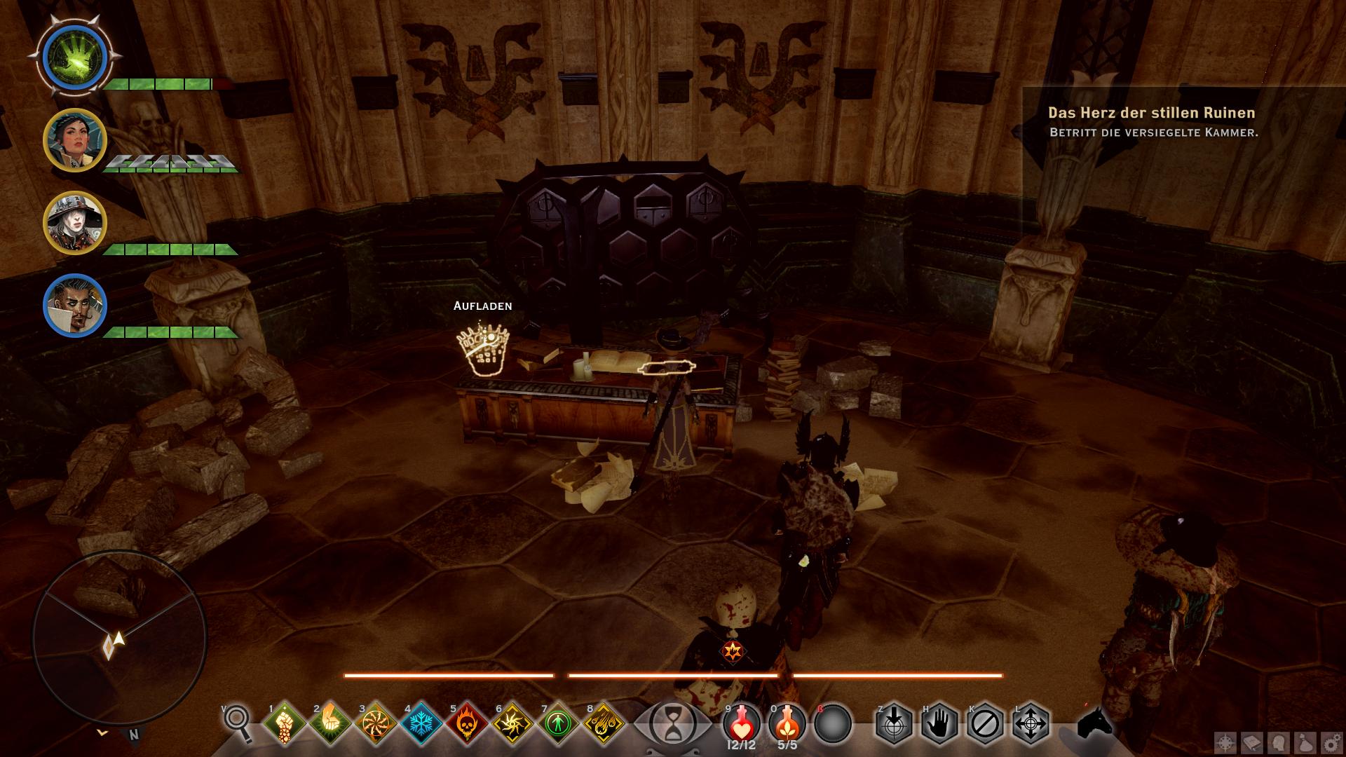 Dies ist eine direkte Folgequest der "Jagd auf die Tevinter-Reliquie". Die Jagd endet und diese Quest beginnt mit dem Tod von Lucanus [2] auf dem Hof der stillen Ruinen, genauer gesagt, wenn ihr den Schlüsselstein aus seinen Überresten plündert. Unter den Habseligkeiten befindet sich übrigens auch der Plan für die "Rune der Reinigung". Die anderen vier Schlüsselsteine liegen in den vier Ecken den Hofes bzw. in den angeschlossenen Räumen [3, 4, 5, 6]. Wenn ihr in dem südwestlichen Raum [3] seid, solltet ihr unbedingt das Schleierfeuer entzünden und eine Fackel mitnehmen. Öffnet mit den fünf Schlüsselsteinen die Tür zum nördlichen Raum [7] und nehmt den "Sturm" Stab an euch. Dadurch läuft die Zeit in den stillen Ruinen wieder wie gewohnt und die Dämonen auf dem Hof erwachen zum Leben. Bevor ihr den Raum verlasst, solltet ihr mit der Schleierfeuer-Fackel die Rune hinter dem Podest des Stabes untersuchen. Auf diese Weise erhaltet ihr den Plan: "Rune des Geistes". Die Herz Quest ist an dem Punkt abgeschlossen. Ihr könnt zum Riss [1] weiter gehen und den für die [ur=/dragon-age-inquisition/quests/ein-seltsamer-riss-in-den-ruinen-a-stranger-rift-in-the-ruins.htm]"Ein seltsamer Riss in den Ruinen" Quest schließen.