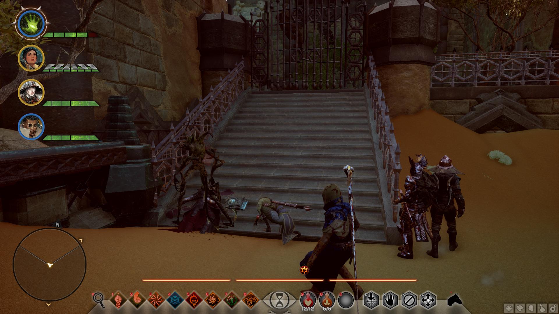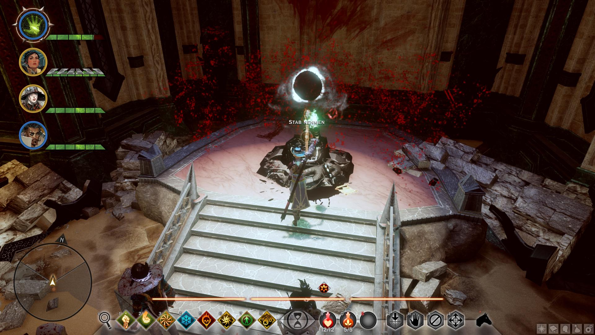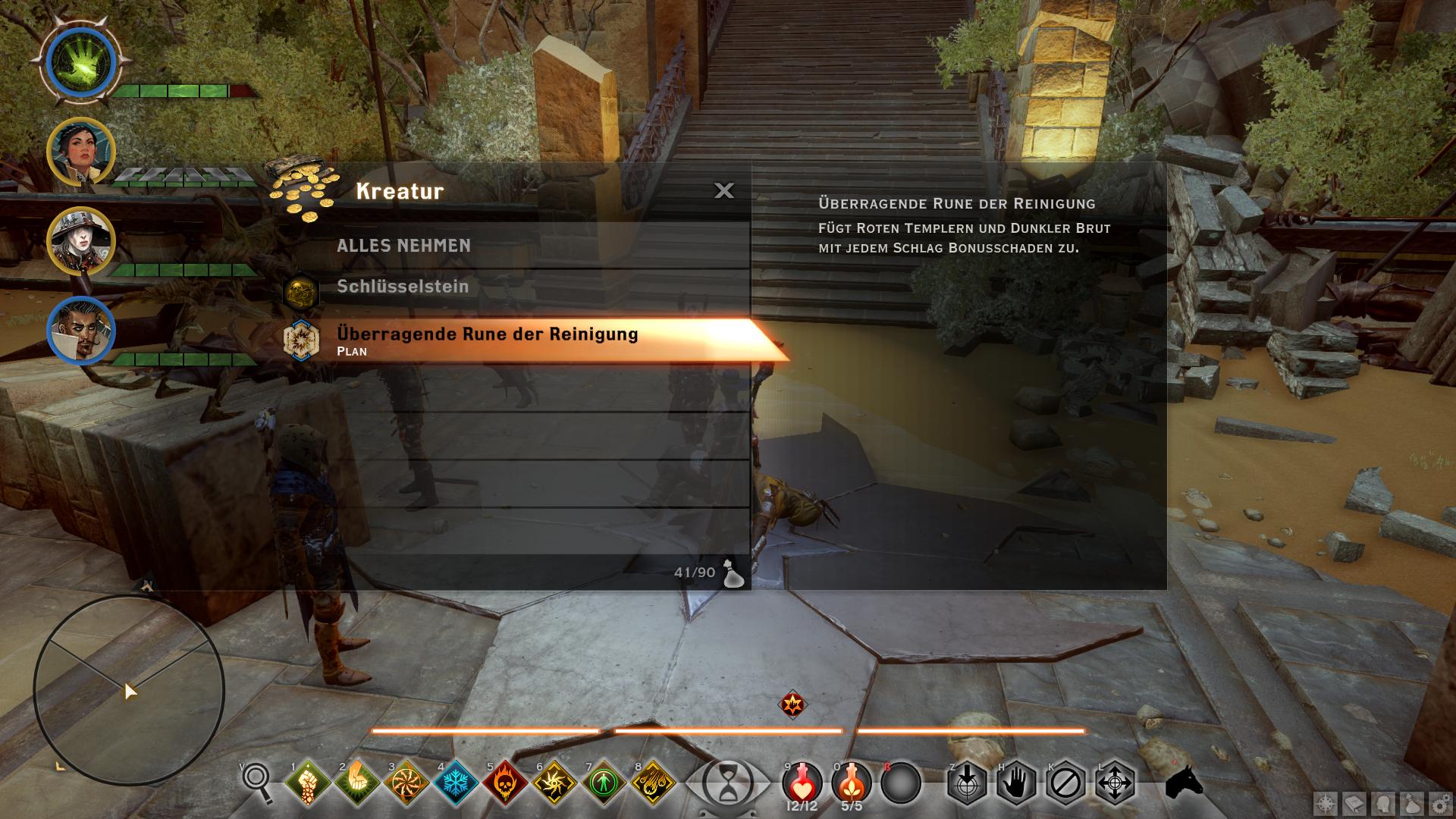 Dies ist eine direkte Folgequest der "Jagd auf die Tevinter-Reliquie". Die Jagd endet und diese Quest beginnt mit dem Tod von Lucanus [2] auf dem Hof der stillen Ruinen, genauer gesagt, wenn ihr den Schlüsselstein aus seinen Überresten plündert. Unter den Habseligkeiten befindet sich übrigens auch der Plan für die "Rune der Reinigung". Die anderen vier Schlüsselsteine liegen in den vier Ecken den Hofes bzw. in den angeschlossenen Räumen [3, 4, 5, 6]. Wenn ihr in dem südwestlichen Raum [3] seid, solltet ihr unbedingt das Schleierfeuer entzünden und eine Fackel mitnehmen. Öffnet mit den fünf Schlüsselsteinen die Tür zum nördlichen Raum [7] und nehmt den "Sturm" Stab an euch. Dadurch läuft die Zeit in den stillen Ruinen wieder wie gewohnt und die Dämonen auf dem Hof erwachen zum Leben. Bevor ihr den Raum verlasst, solltet ihr mit der Schleierfeuer-Fackel die Rune hinter dem Podest des Stabes untersuchen. Auf diese Weise erhaltet ihr den Plan: "Rune des Geistes". Die Herz Quest ist an dem Punkt abgeschlossen. Ihr könnt zum Riss [1] weiter gehen und den für die [ur=/dragon-age-inquisition/quests/ein-seltsamer-riss-in-den-ruinen-a-stranger-rift-in-the-ruins.htm]"Ein seltsamer Riss in den Ruinen" Quest schließen.