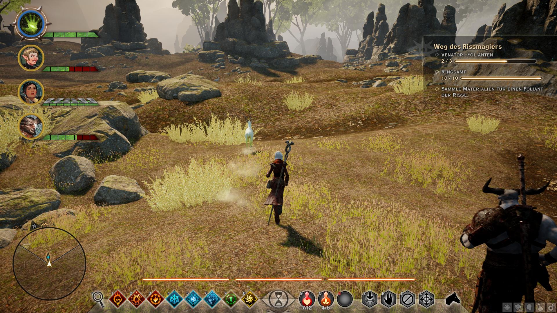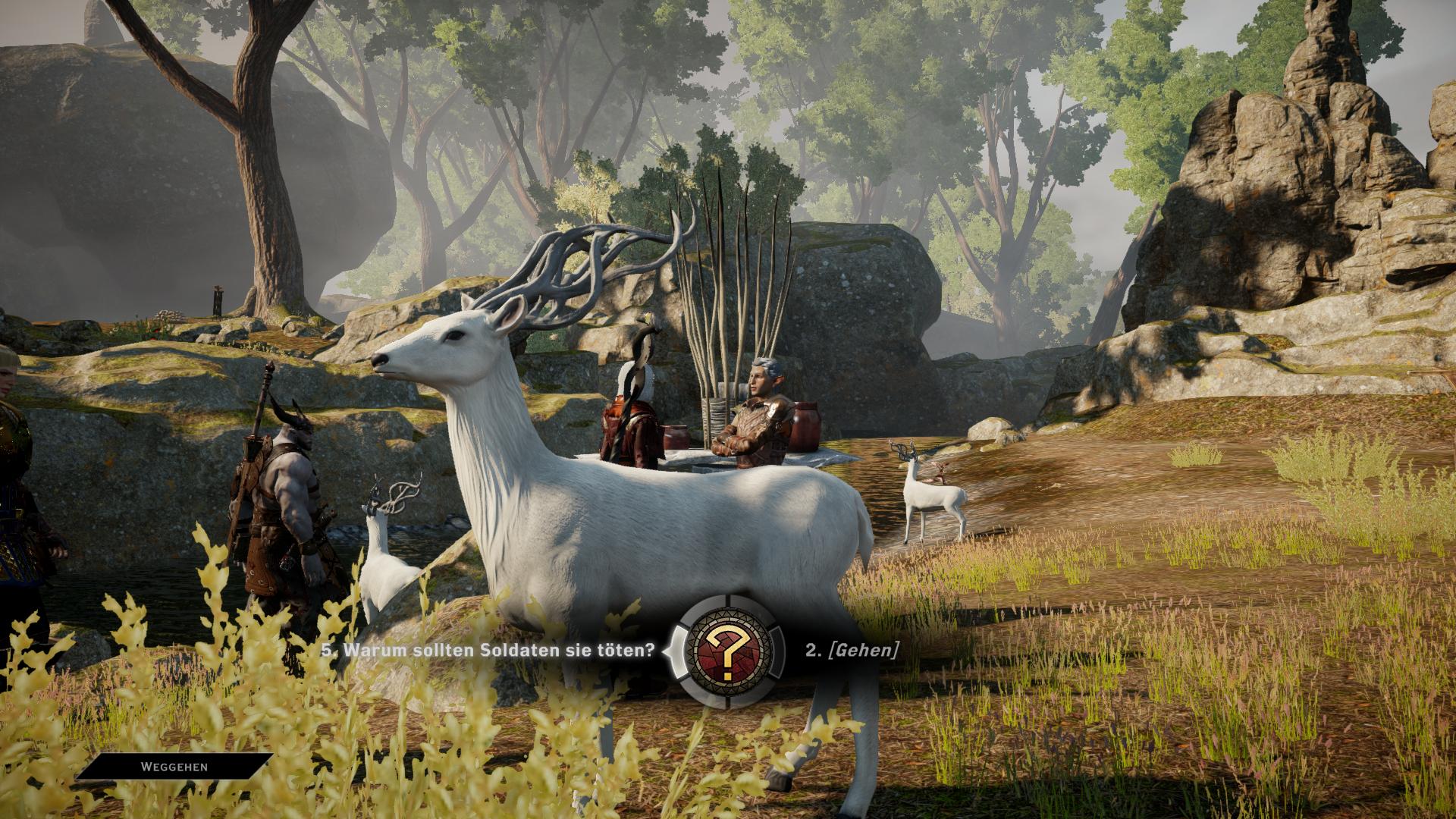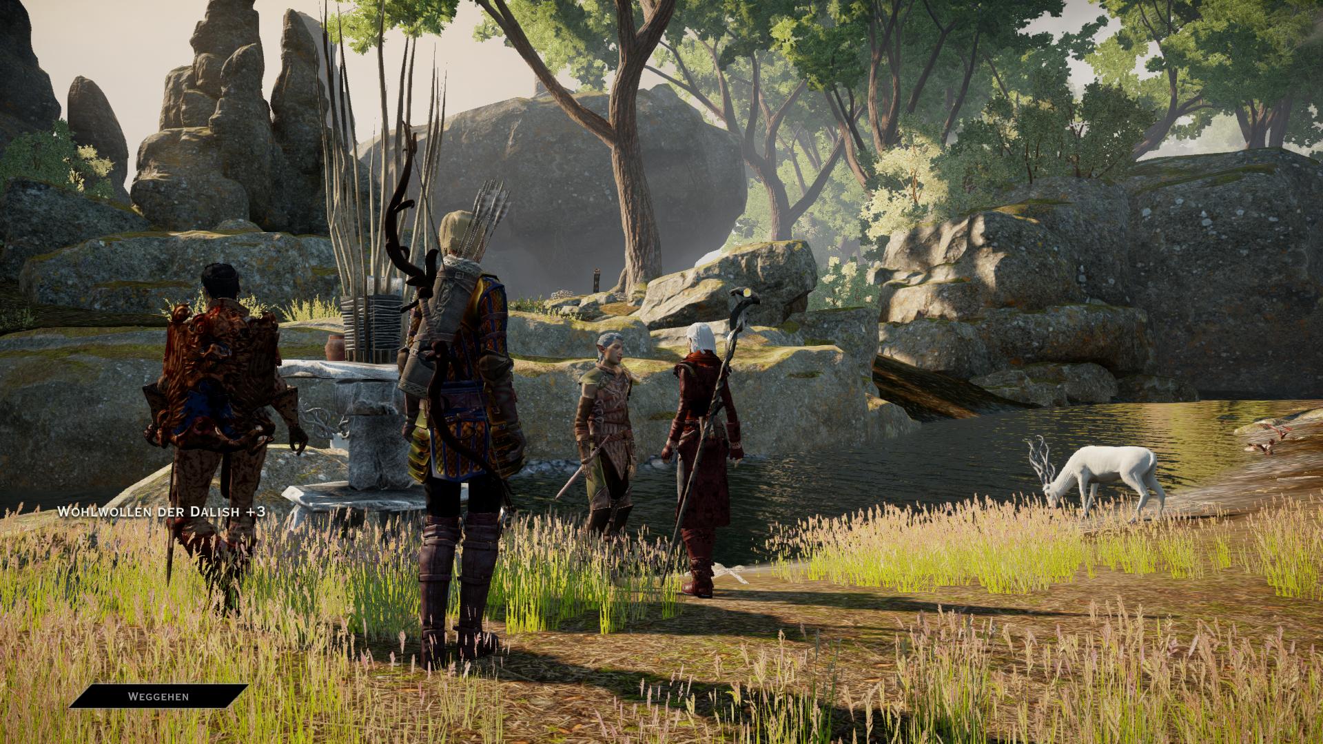 Direkt neben Hüter Hawen im Dalish-Lager [16] steht Ithiren, welcher euch von der Sagenumwobenen goldenen Halla erzählt. Ihr könnt diese leicht Gold glänzende Rehähnliche Tier tatsächlich weiter südlich entlang des Flussufers [17] finden. Um sie zu Ithiren bzw. den Dalish zu bringen, müsst ihr euch nur aus der entgegengesetzten Richtung nähern und sie somit verschrecken bzw. in die richtige Richtung zu scheuchen. Als Lohn steigt euer Ruf um drei Punkte in Richtung wohlwollend.