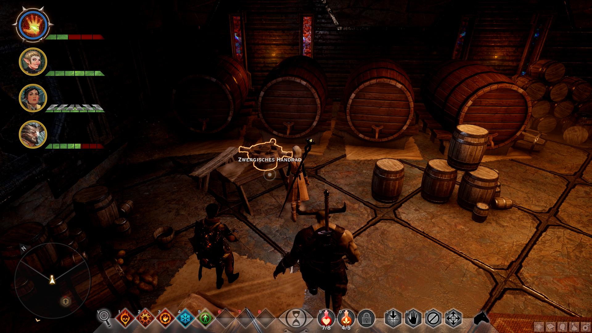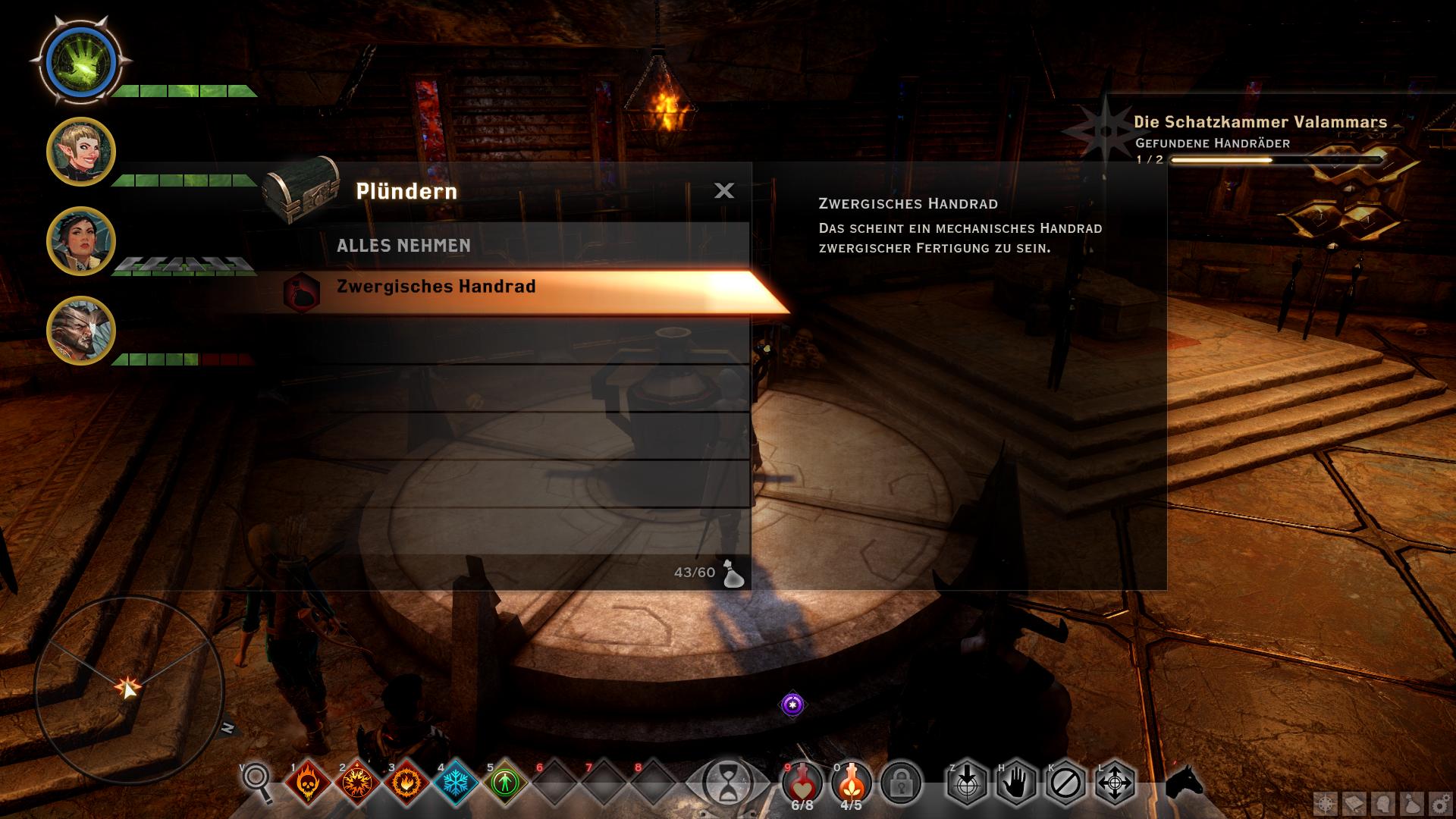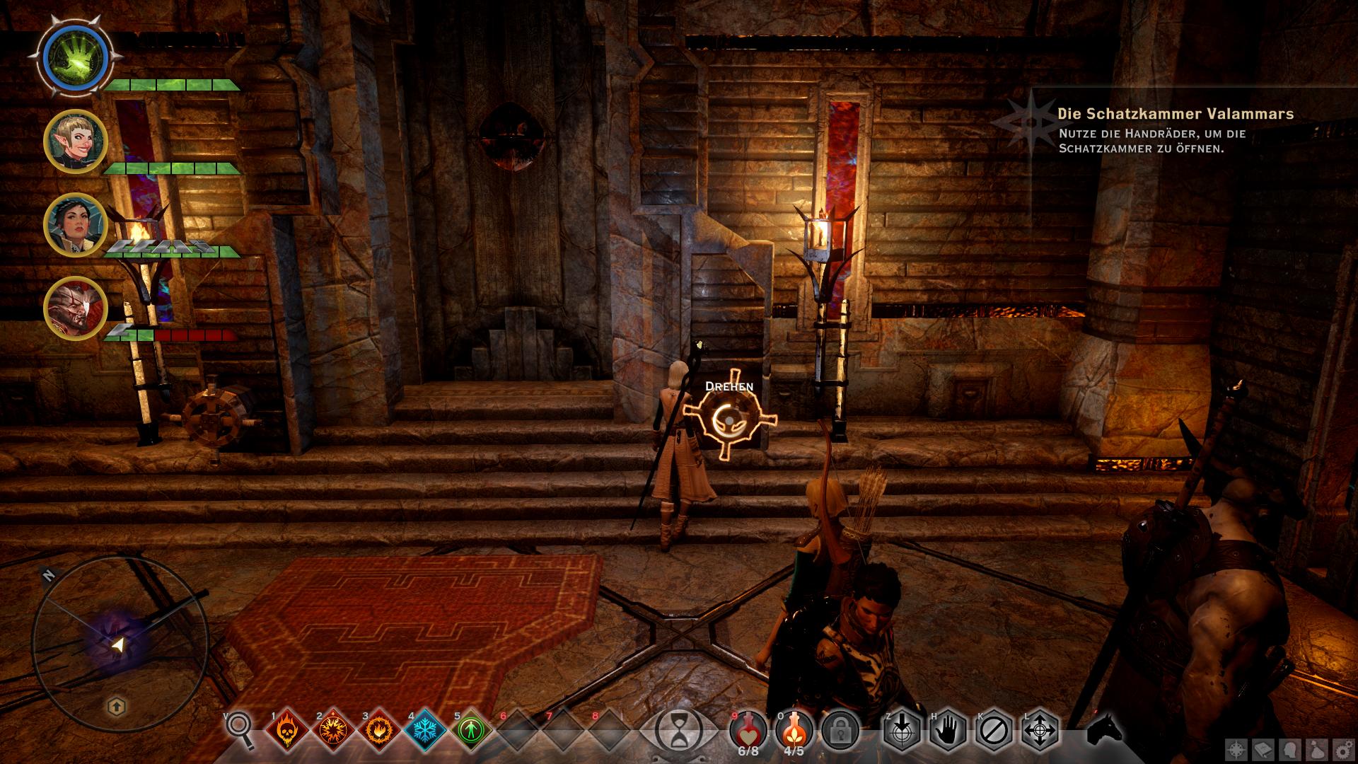 Diese Aufgabe startet wenn ihr in Valammar eines der beiden zwergischen Handräder aufhebt. Das eine liegt in der ersten Kammer auf der mittleren Ebene Valammars [3], direkt wenn ihr die erste Treppe hinunter geht. Das zweite in dem Raum gegenüber, über die Brücke hinweg [4]. Die Türen müsst ihr mit einem Schurken knacken. Im zweiten Raum findet ihr u.a. auch ein Mosaikteil für "den Fall" und den "Schild der Dunklen Brut" Plan. Setzt die beiden Handräder an der Tür [6] im Karta-Raum ein und dreht an beiden so lange bis sich die Tür zur Schatzkammer Valammars öffnet. Habt ihr den Hurlock Alpha darin ausgeschaltet, könnt ihr die gesamte Schatzkammer plündern, wozu u.a. "Bianca Bogen III", ein "Amulett der Macht" für Varric, ein weiteres Mosaik Teil (Der Fall), "Banner der Zwerge" und der "Gehärteter Großschwertgriff" Plan gehören.