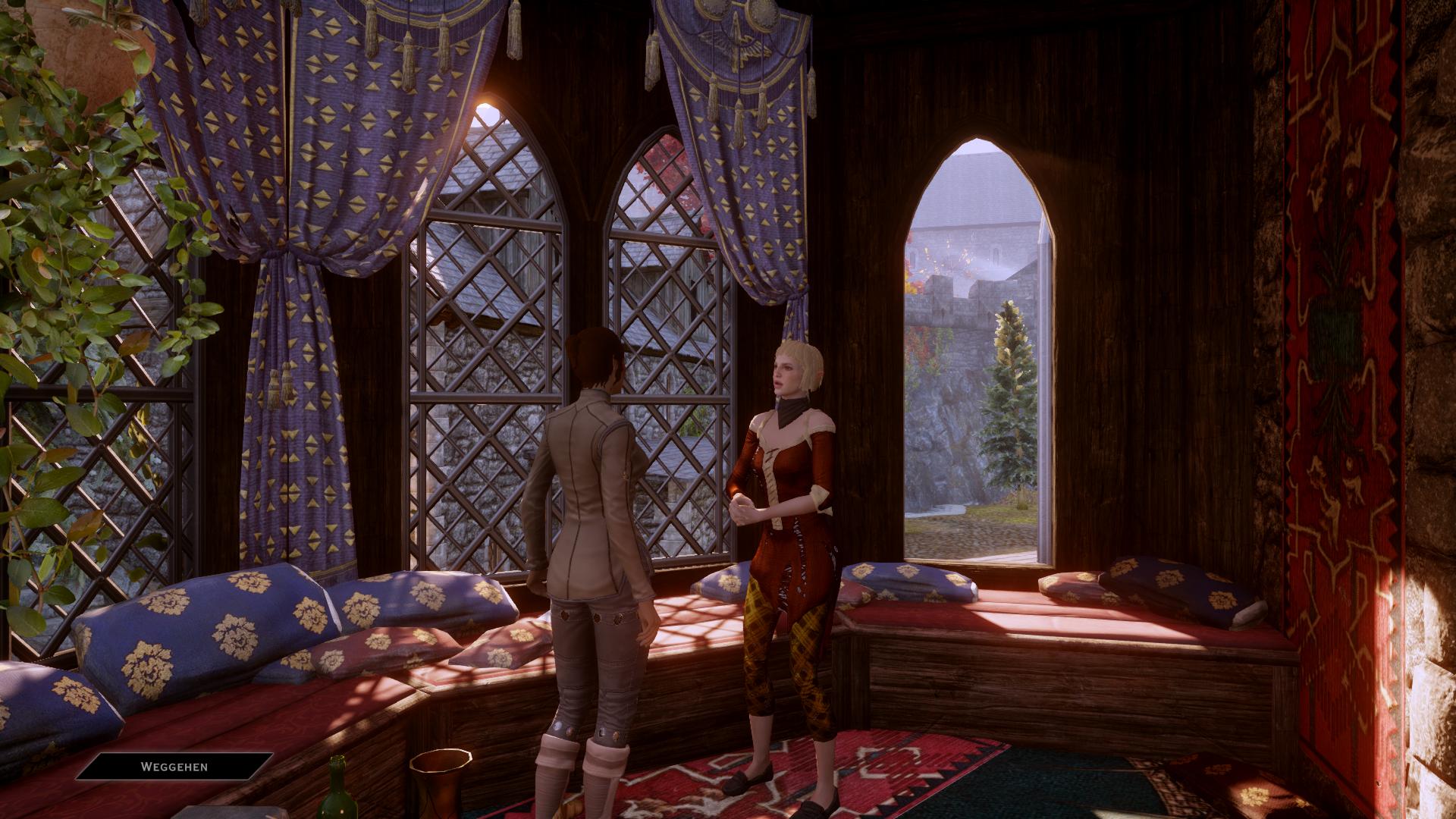 Habt ihr alle drei roten Tücher gefunden, erscheint ein "Abgeschiedener Hof" auf der Weltkarte (nicht zu verwechseln mit der Taktikkarte des Kriegsrats). Reist dort hin und erledigt die sehr einfach zu bezwingende Überfallgruppe. Das ruft Sera auf den Plan, die den Leuten offenbar die Hosen geklaut hat. An dem Punkt bietet Sera an, sich der Inquisition anzuschließen.