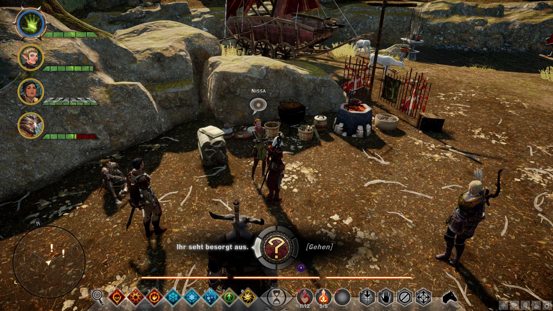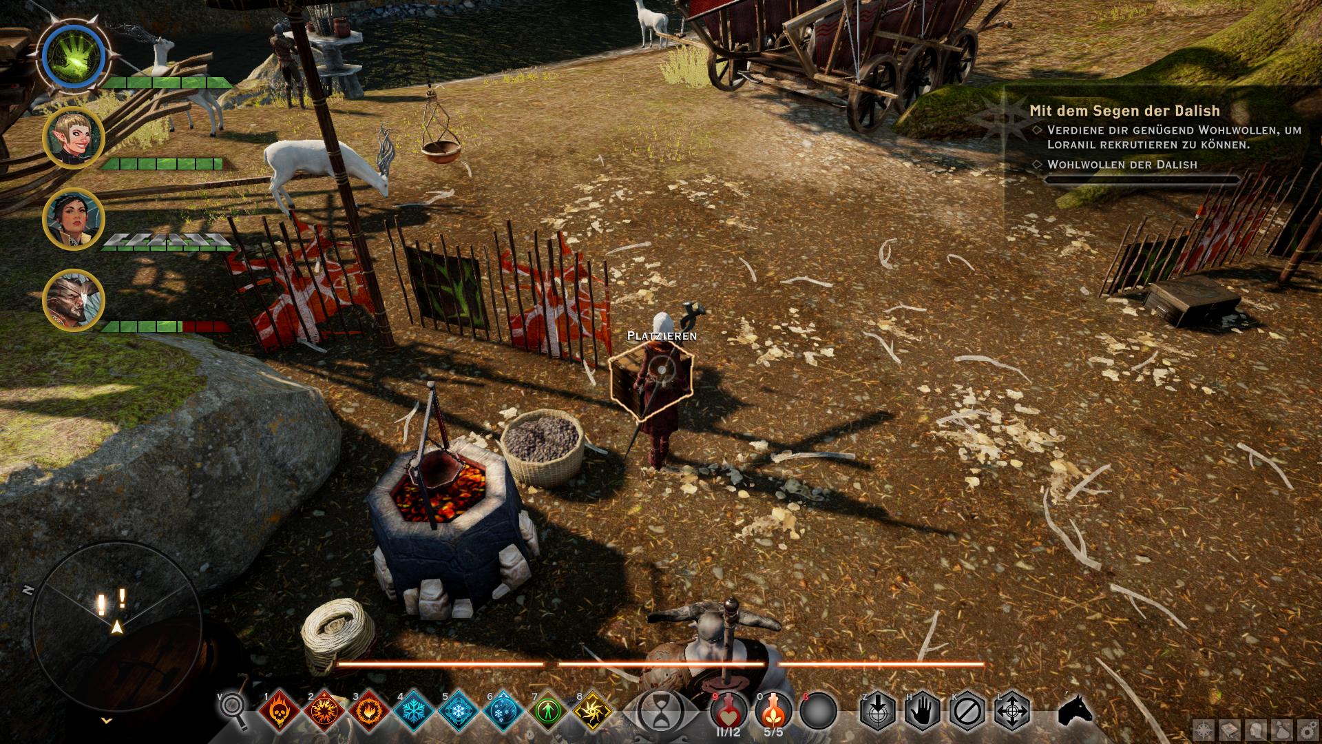 Diese Aufgabe von Nissa aus dem Dalish-Lager [16] ist ideal geeignet, um die letzten fehlenden Punkte zum wohlwollenden Ruf bei den Dalish zu erreichen. Nachdem Nissa euch ihre Sorgen vorgetragen hat, könnt ihr im Buch neben ihr nachlesen, was den Dalish fehlt und sofern ihr das bei euch tragt, auf den Korb einen Meter weiter klicken, um es den Dalish zu überlassen. Das Prinzip lässt sich mehrfach wiederholen und gibt jedes Mal +1 Ruf. Der Haken ist jedoch, dass die Materiealien an sich immer kostspieliger werden (Elfenwurzel, Hundsleder, Eisen, usw.) und ihr irgendwann bei Großbärenhäuten landet. Diese findet ihr nur in den Smaragdgräbern und dieser Stufe 4 Werkstoff ist ebenfalls sehr gut zum Bau der besten mittleren Rüstungen geeignet. Ihr solltet also abwägen, ob die Erfüllung der Quest und das eventuelle Gewinnen eines Emissärs den Aufwand wert ist.