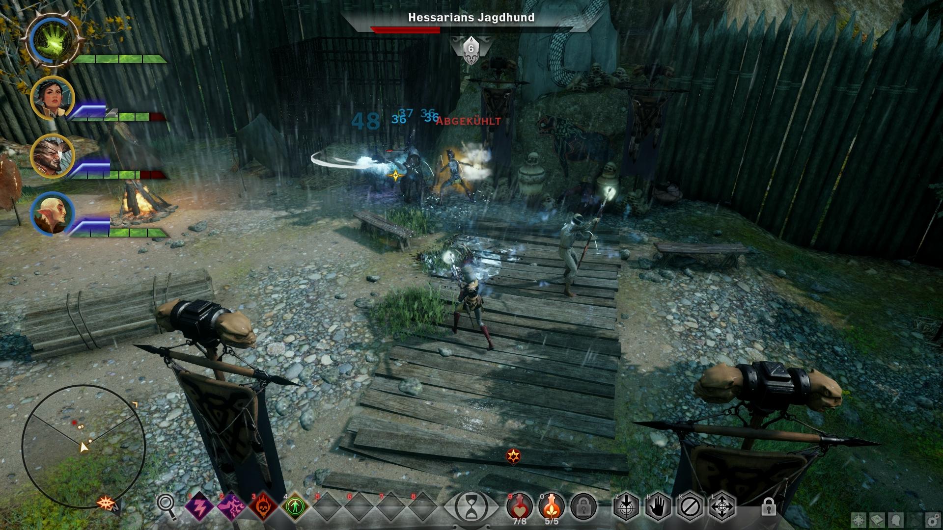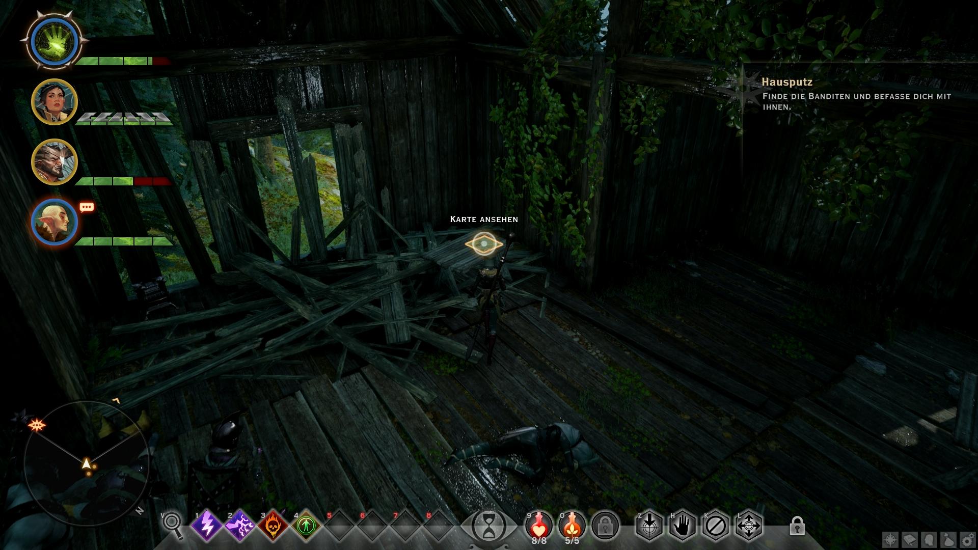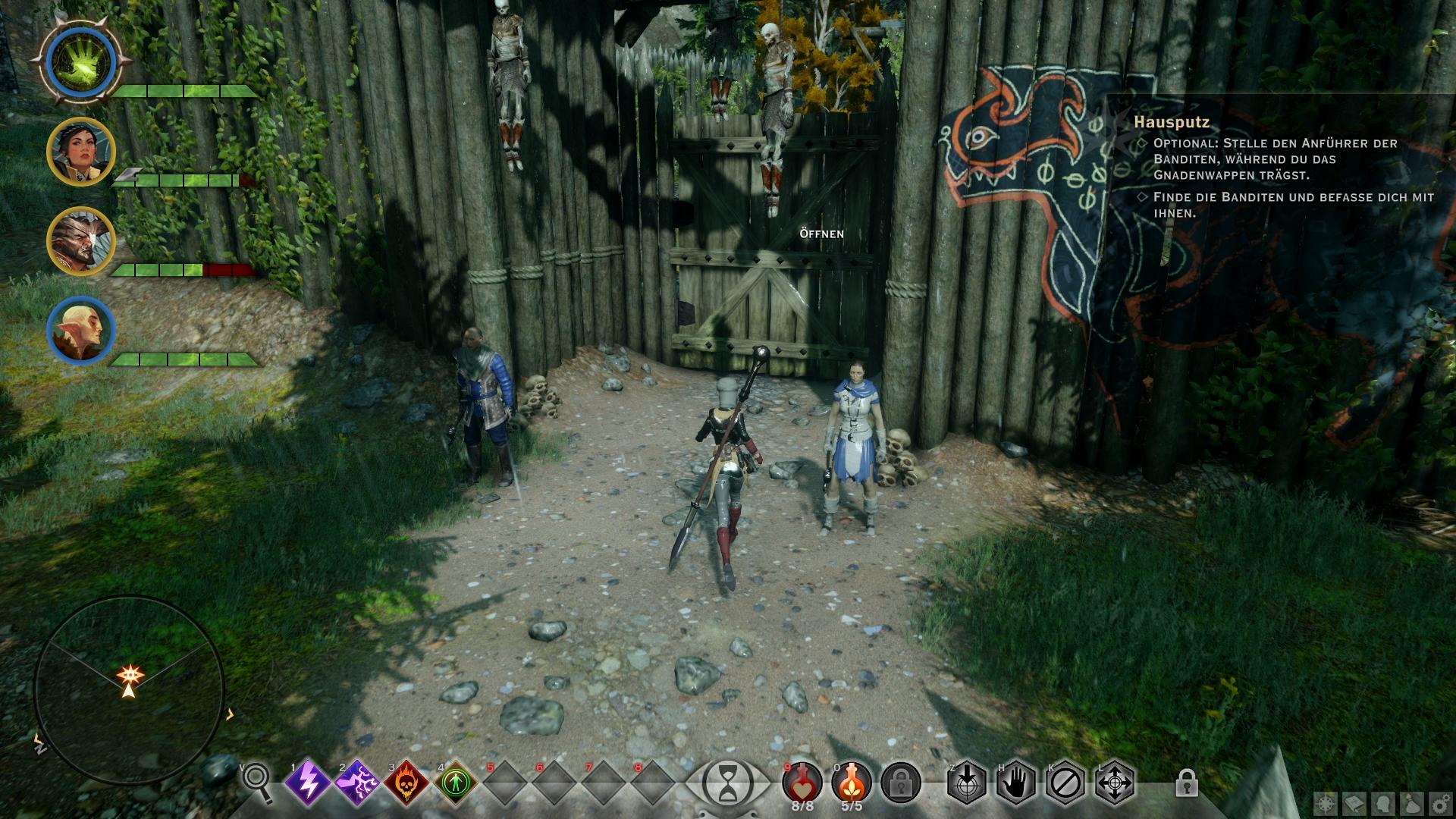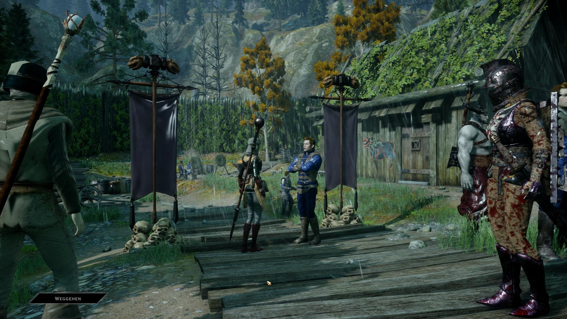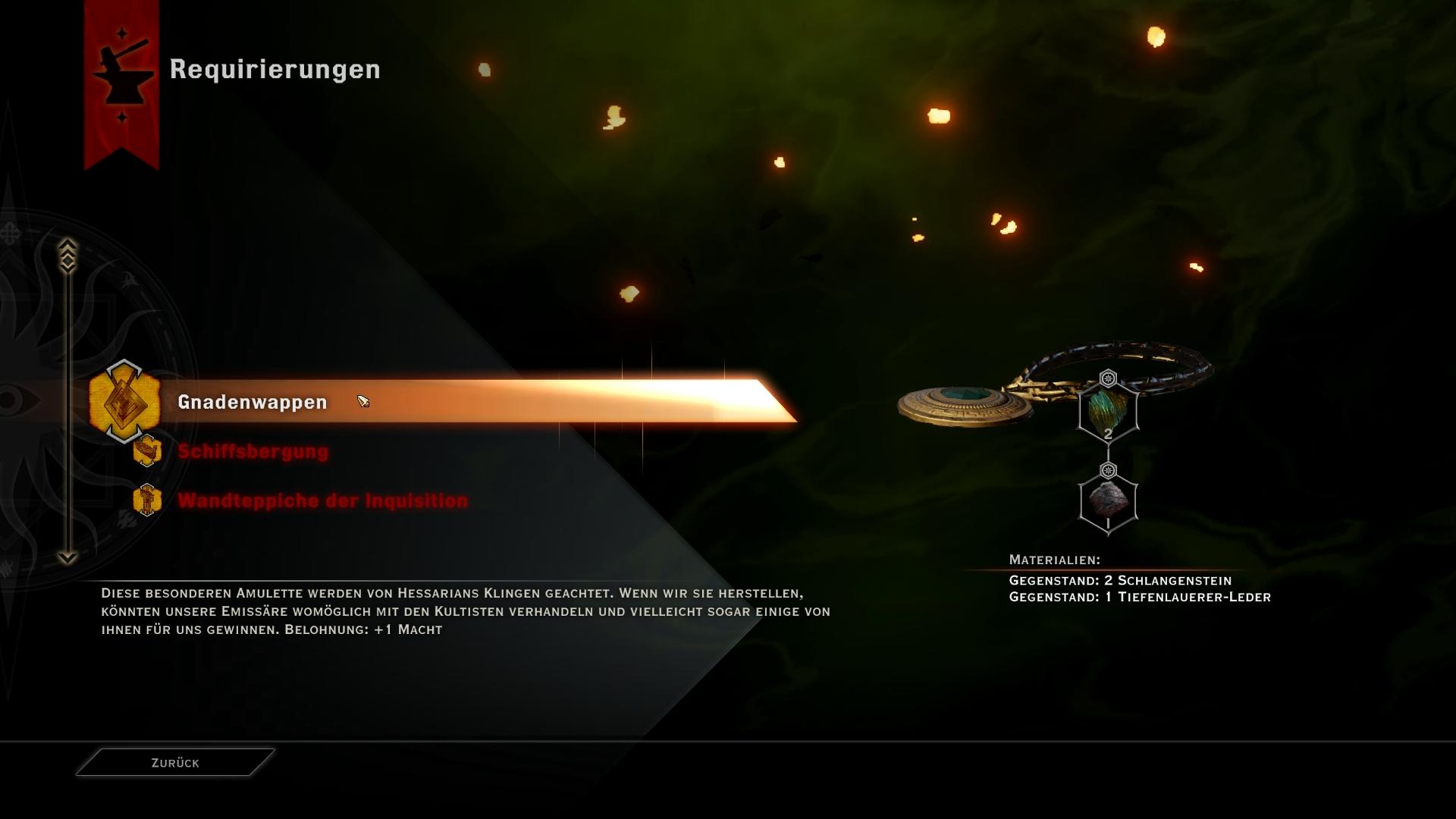 Bei euren Eintreffen an der Sturmküste [1] berichtet euch Späherin Harding von einer Gruppe Inquisitionssoldaten, die Verhandlungen mit Hessarians Klingen aufnehmen sollten und verschwunden sind. Begebt euch vom Basislager (Einsamkeit des Sturms) aus nach Süden auf den nächsten bewaldeten Hügel. Dort greifen euch bei zwei Hütten einige Banditen an. Auf dem Dach der einen Hütte findet ihr eine Scherbe und in der anderen eine mehrere Truhen, sowie eine Notiz auf dem Tisch. Durch diese bekommt ihr das Rezept für ein Gildenwappen von Hessarians Klingen. Kehrt zum Lager zurück und stellt dort am Requirierungstisch das Gildenwappen her. Den benötigten Schlangenstein solltet ihr direkt beim Lager auf dem Weg nach unten finden können. Legt das Gildenwappen eurem Hauptcharakter um den Hals (Gefährten zählen nicht) und geht damit zur Festung von Hessarians Klingen nach Süden hinter den zuvor besuchten Hügel. Durch das Wappen sollten euch die Wachen freundlich gesonnen sein und passieren lassen. Wendet euch nach rechts zum Anführer und bezwingt ihn samt seiner Hunde im Kampf. Daraufhin ist die Aufgabe erfüllt und ihr seid der neue [url=/dragon-age-inquisition/nicht-spieler-charaktere/emissare-agents.htm#Hessarians Klingen]Anführer von Hessarians Klingen, wodurch ihr sie als Emissäre erhaltet. Alternativ könnt ihr selbstverständlich auch auf das Wappen verzichten und alle in dem Lager töten. Dadurch entgeht euch jedoch der Emissär.