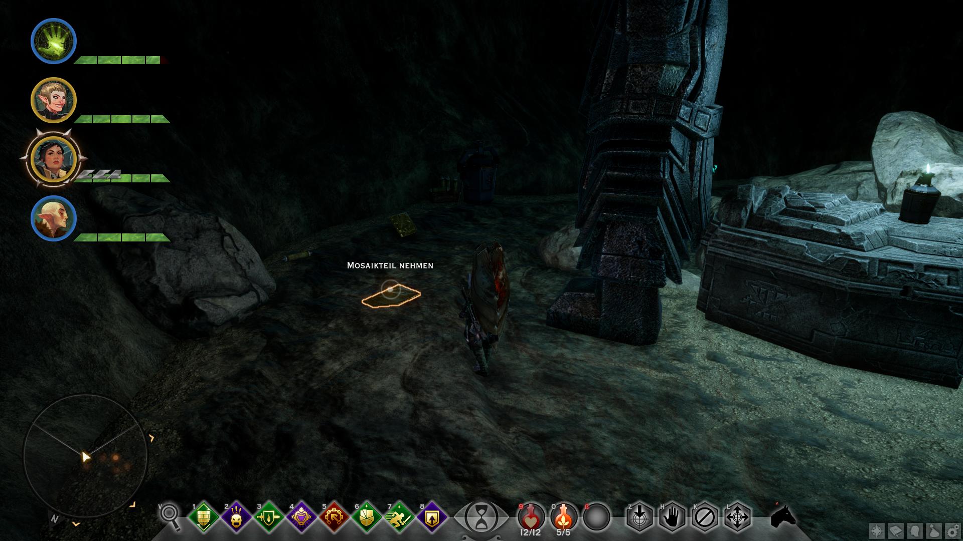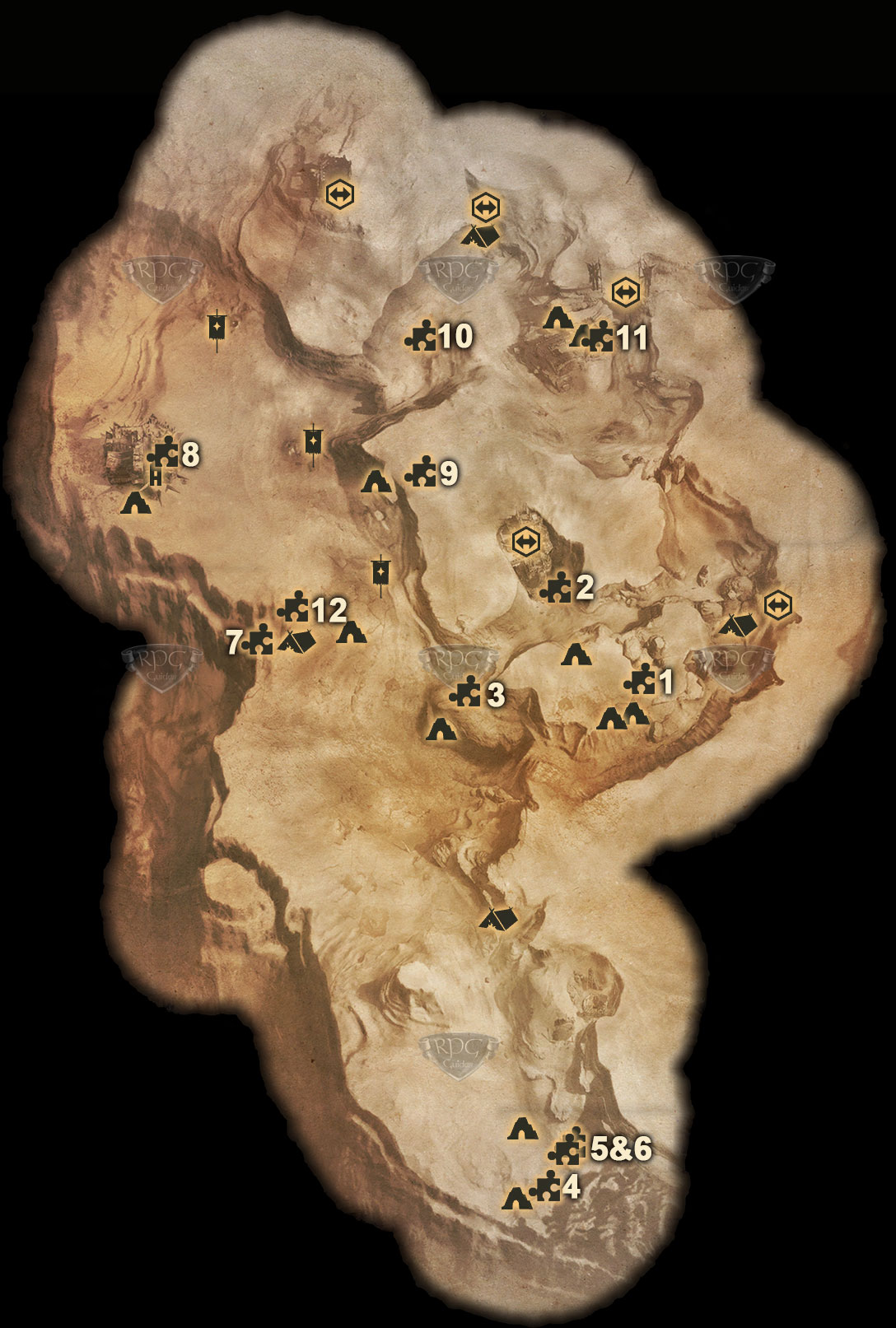 5./6. Gleich zwei Mosaikstücke befinden sich in der zweiten Höhle im Süden ("die Ödnis" Abschnitt). Viele schreiben den Zugang zu dieser Höhle dem Abyssischen Hochdrachen zu, welcher über die gleichnamige Quest (Der Abyssische Hochdrache) anzulocken ist. Der Grund dafür liegt darin, dass der Drache im Kampf durch seine Hiebe sämtliche Ruinenreste zerstören kann und somit möglicherweise ebenfalls den Stein am Höhleneingang zerstört. Der Fels kann aber schlichtweg mit der "Enterkette" (Grappling Chain) Fähigkeit eines Kriegers zerschlagen werden. Unabhängig davon ob ihr den Drachen schon bekämpft habt oder nicht. In der Höhle selbst gibt es neben den beiden Mosaikstücken, die direkt nebeneinander liegen, lediglich Tiefenpilze.