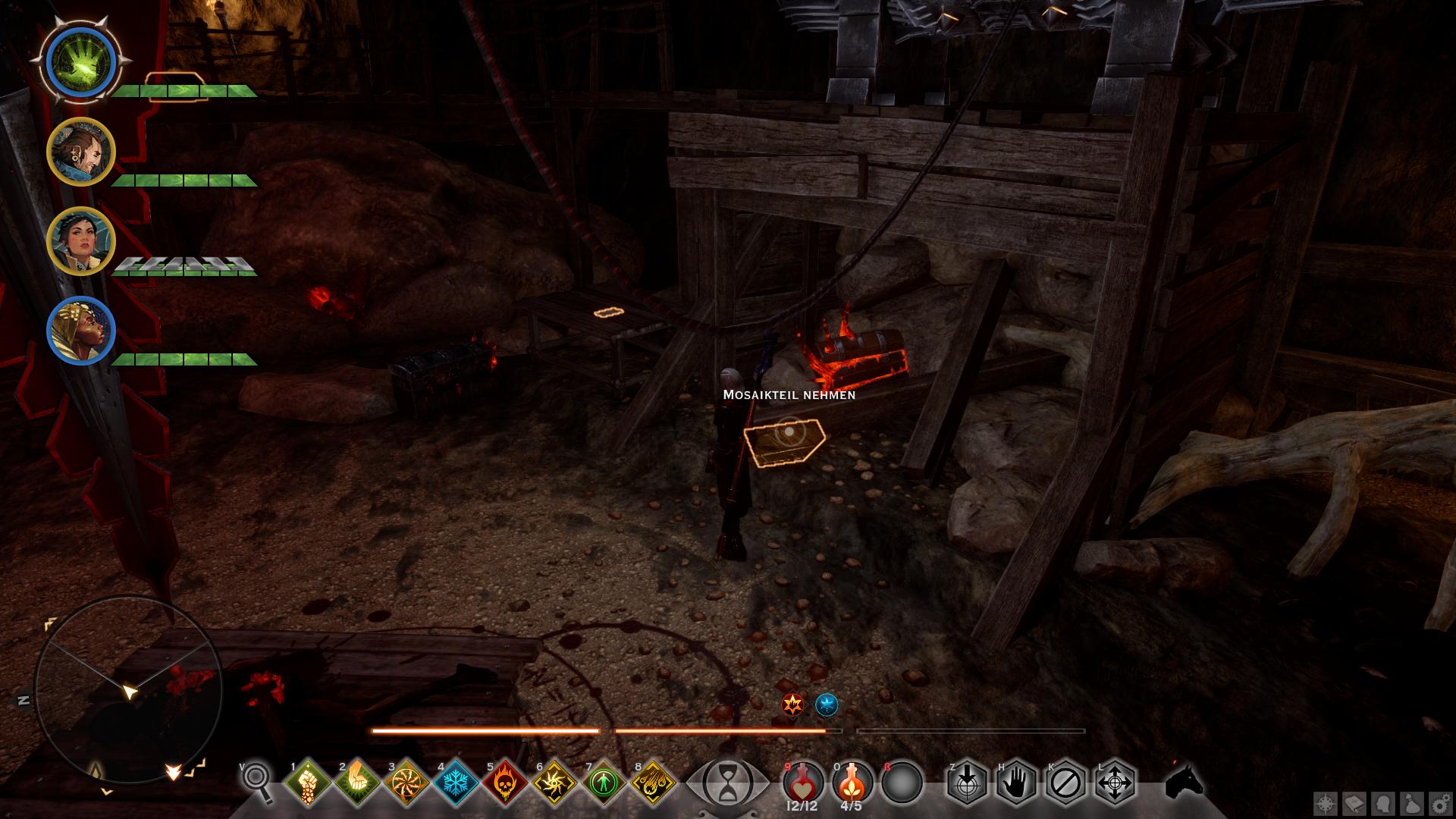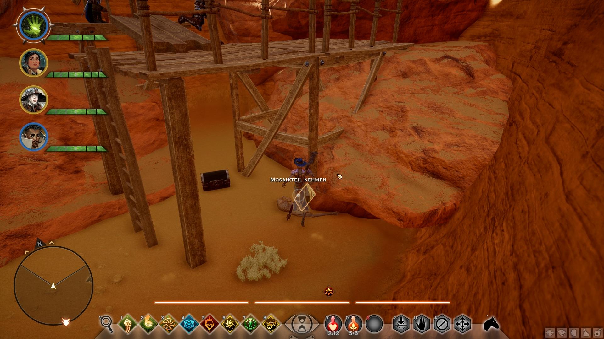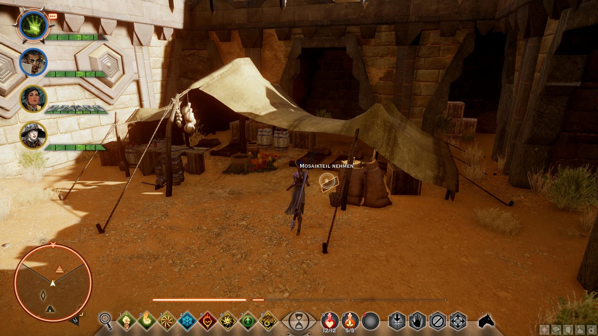 2. Das zweite Mosaikstück ist ähnlich leicht zu finden. Es liegt am Eingang der Stillen Ruinen. Falls ihr gerade erst das erste Mosaikteil eingesammelt habt, könnt ihr dem Verlauf der Sandfelsmine weiter folgen und gelangt so direkt vor die Stillen Ruinen. Dort gibt es eine Gruppe Venatori, welche die "Jagd auf die Tevinter-Reliquie" Quest startet. Hinter den letzten beiden Kisten auf der rechten Seite, noch vor der magischen Barriere, lehnt das Mosaikstück.